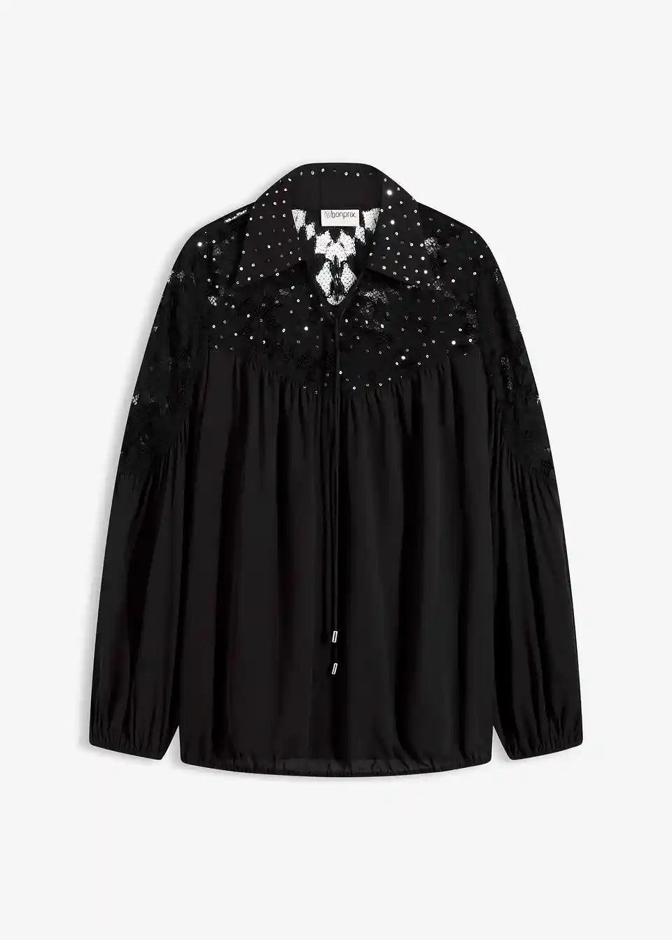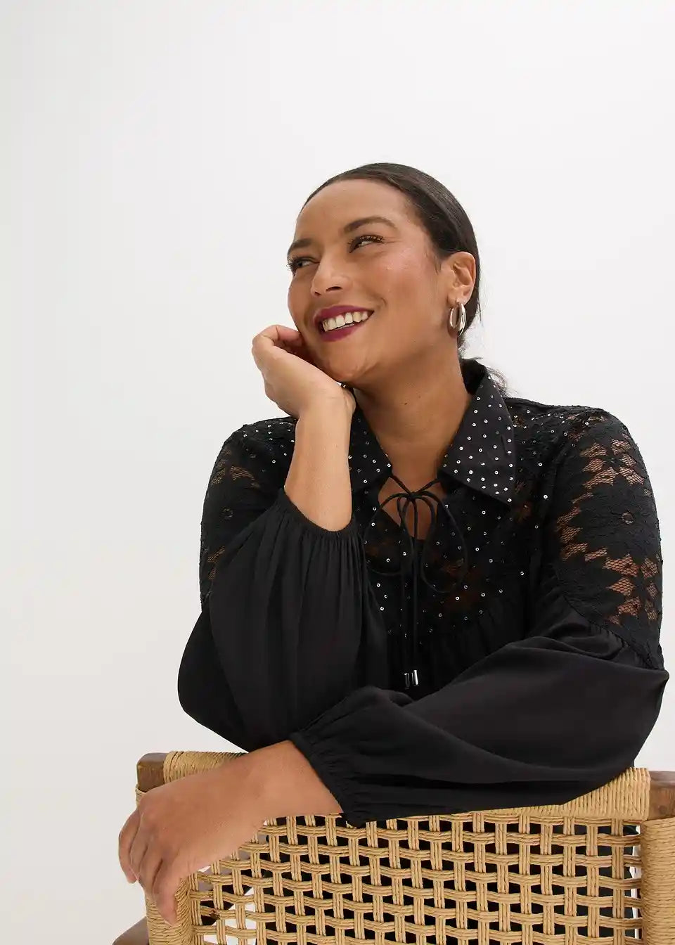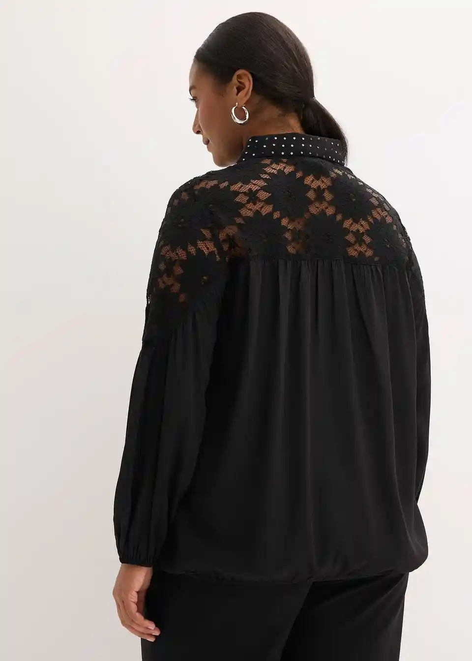 Igriva in moderna bluza z všitkom iz čipke in zavezovanjem na ovratniku
