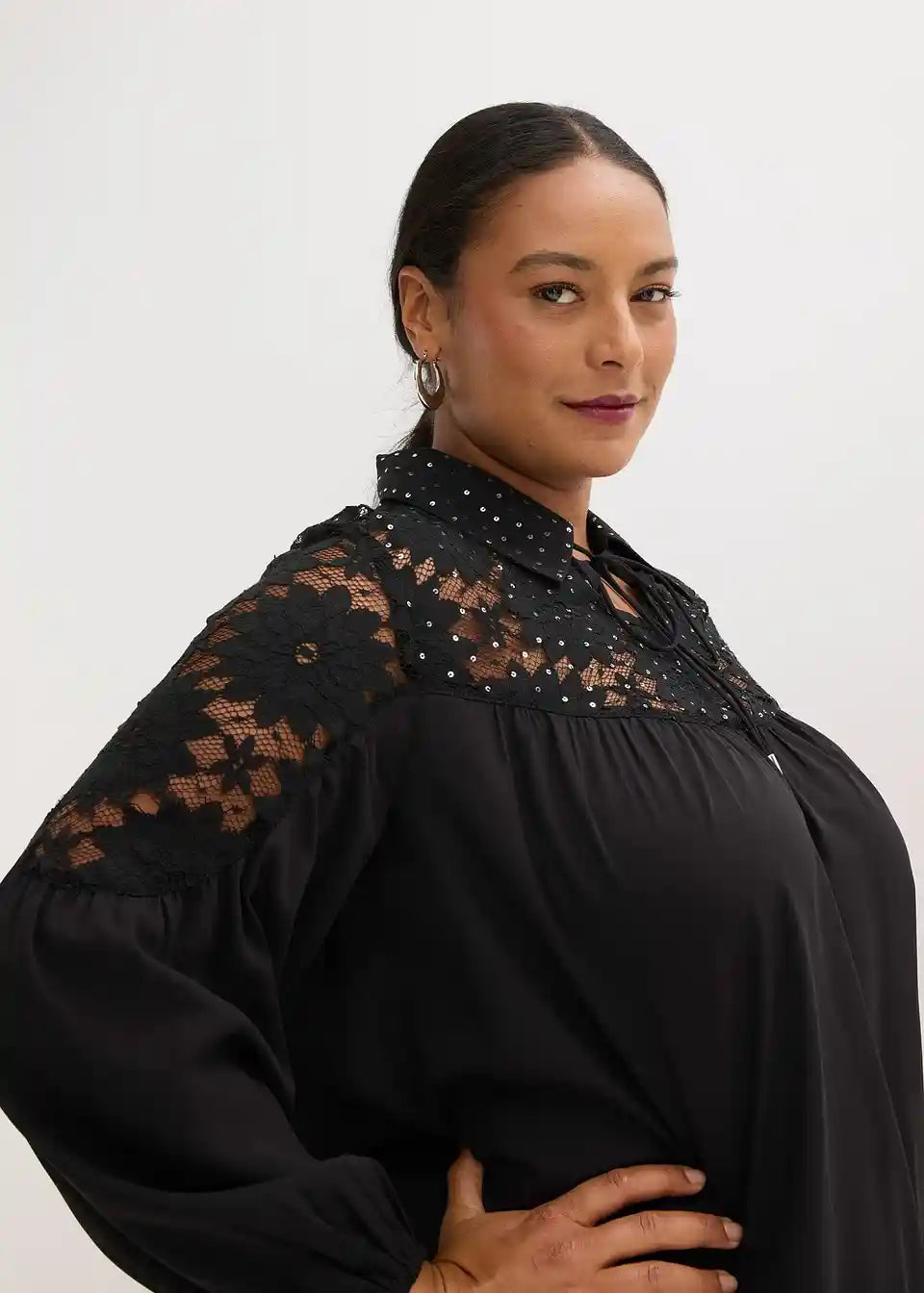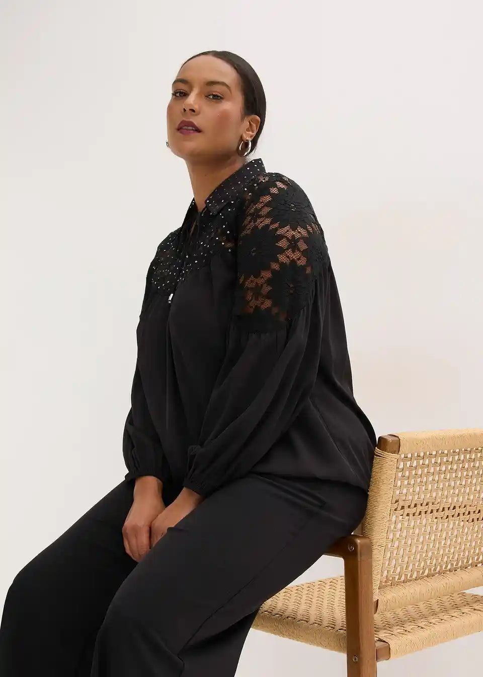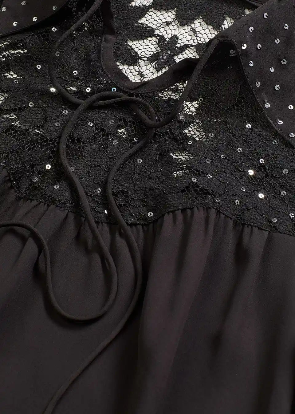 Igriva in moderna bluza z všitkom iz čipke in zavezovanjem na ovratniku