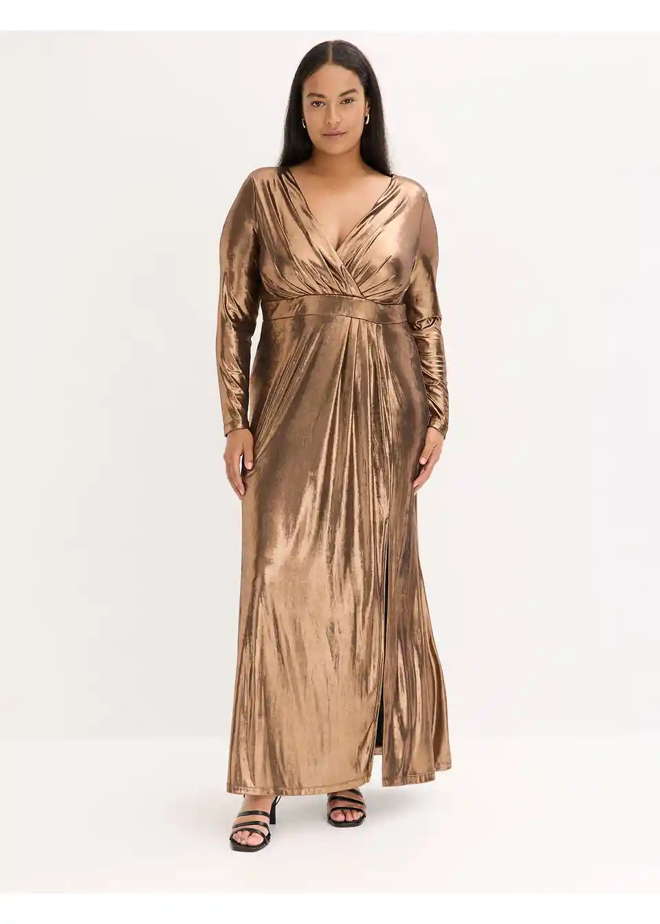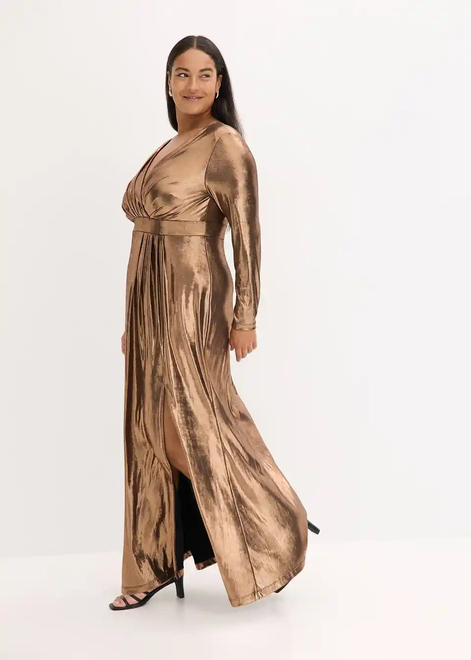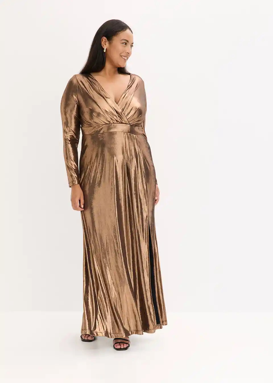 Moderna in ženstvena večerna obleka iz sijočega materiala v kovinskem videzu
