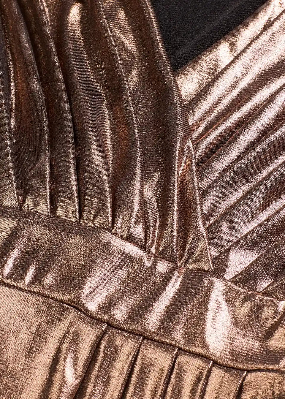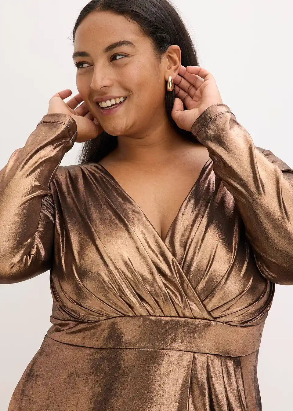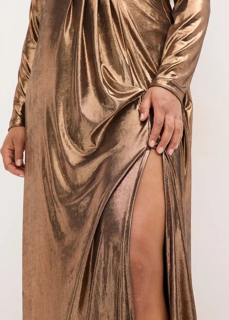Moderna in ženstvena večerna obleka iz sijočega materiala v kovinskem videzu