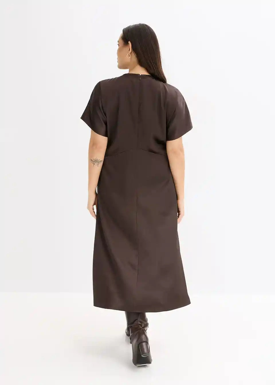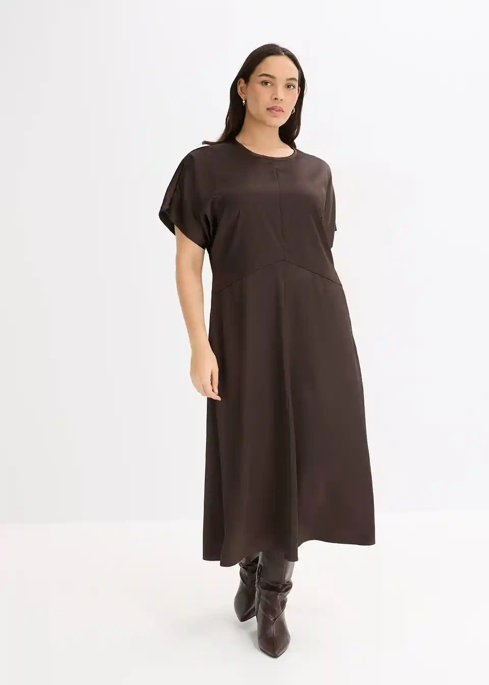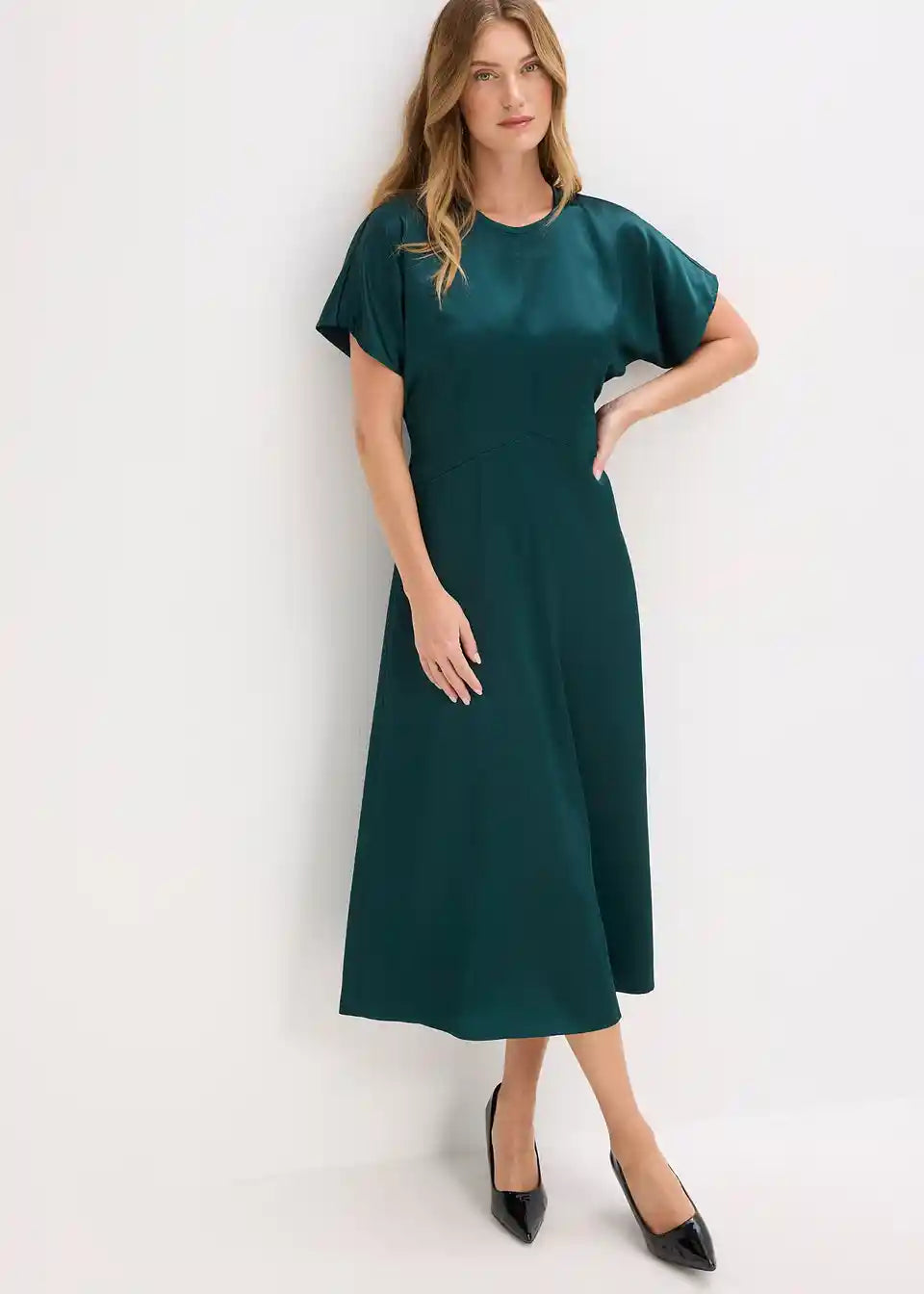 Midi obleka iz padajočega satena ima oprijeto silhueto v pasu in široke rokave