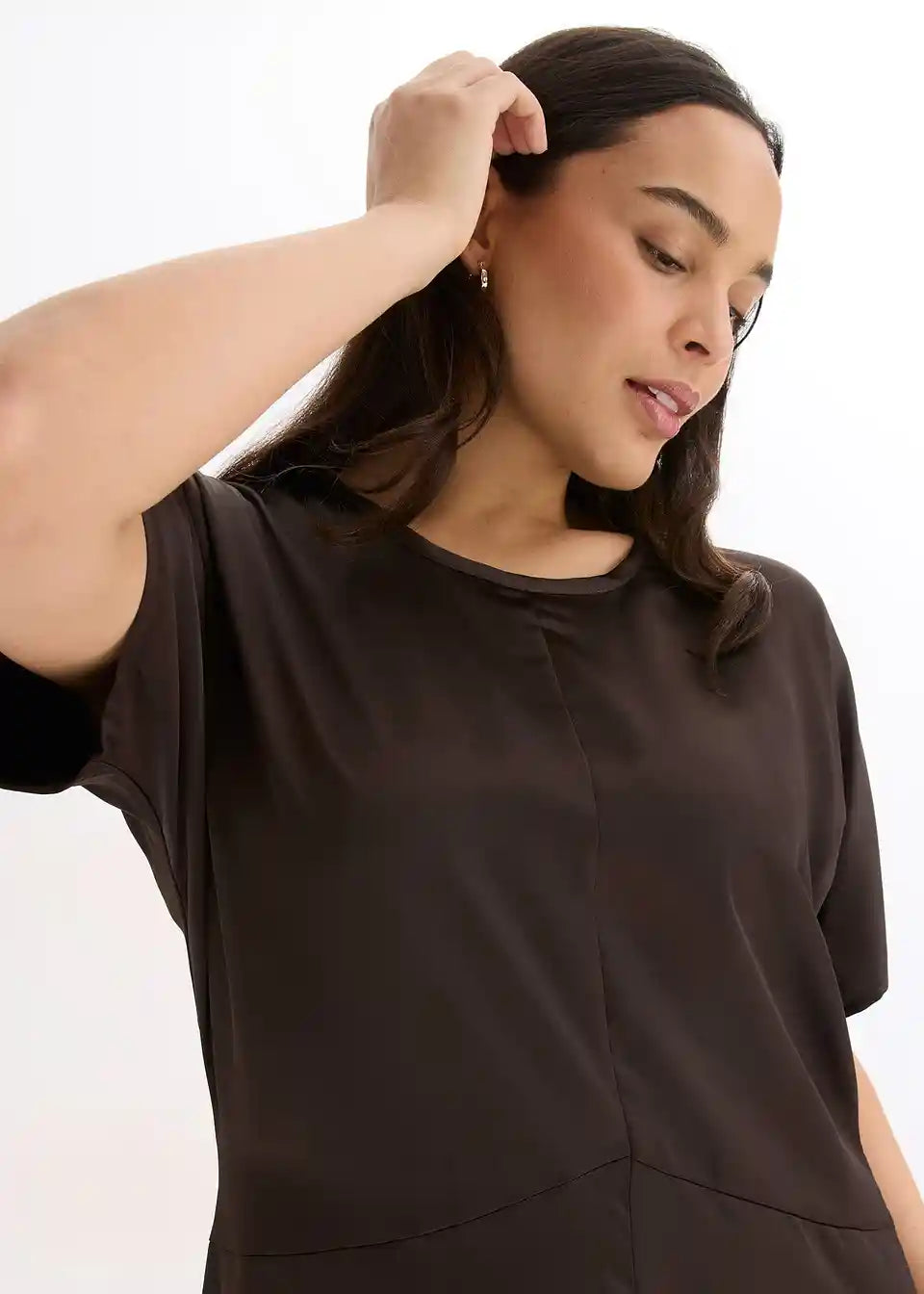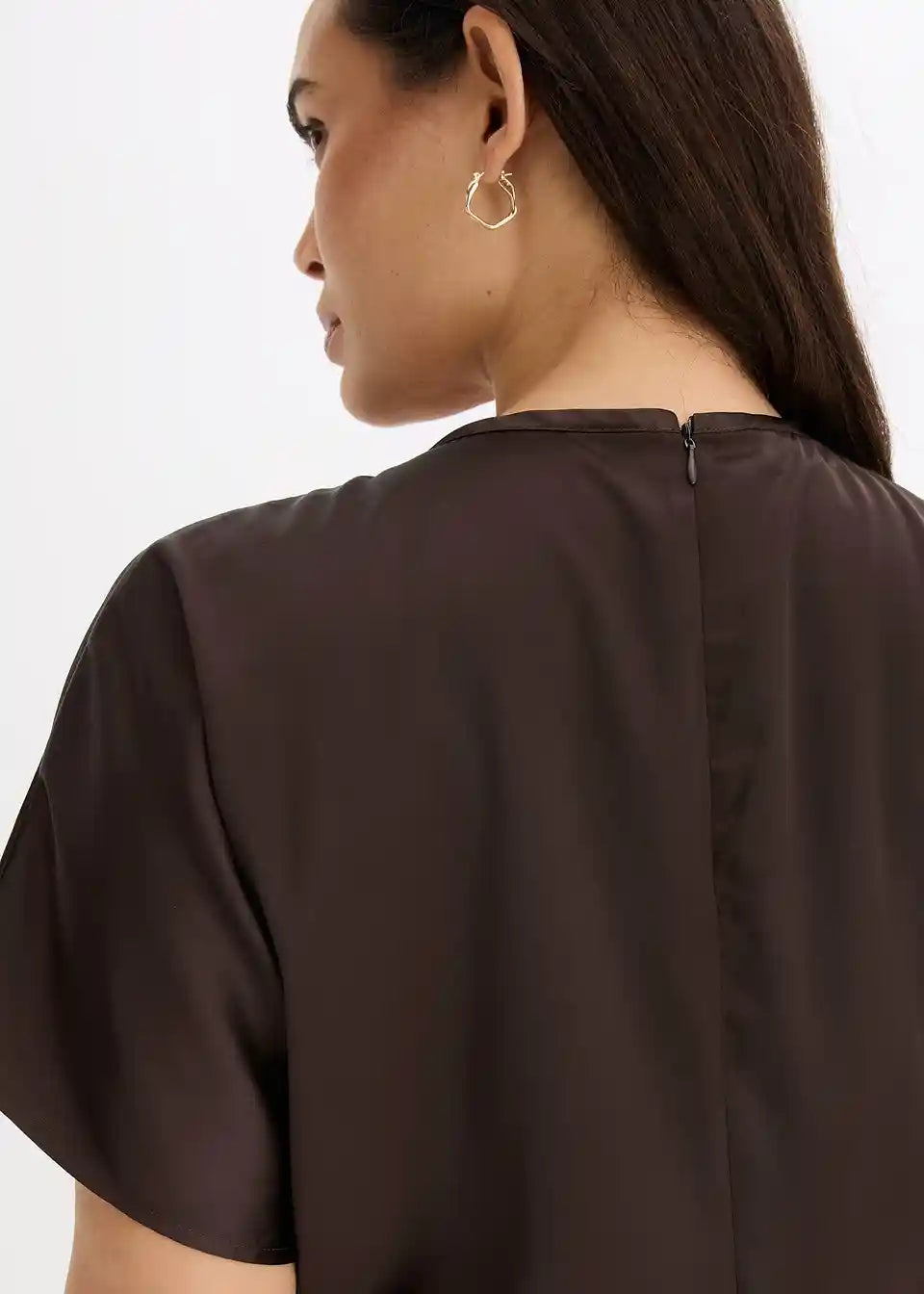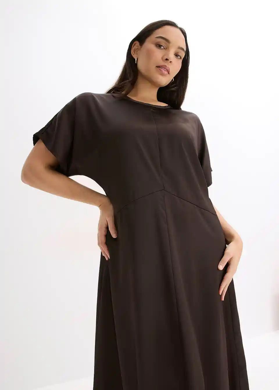 Midi obleka iz padajočega satena ima oprijeto silhueto v pasu in široke rokave