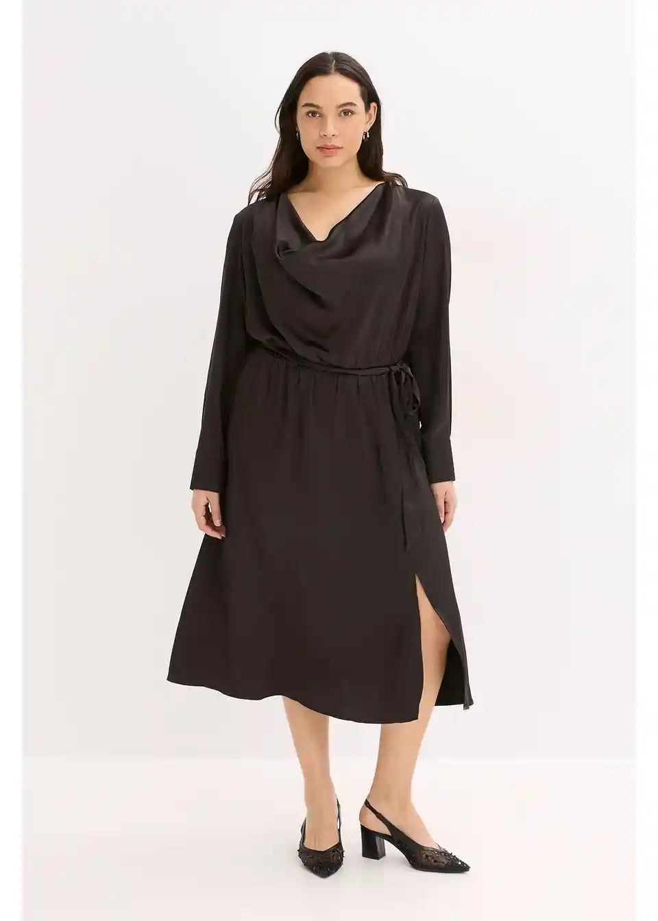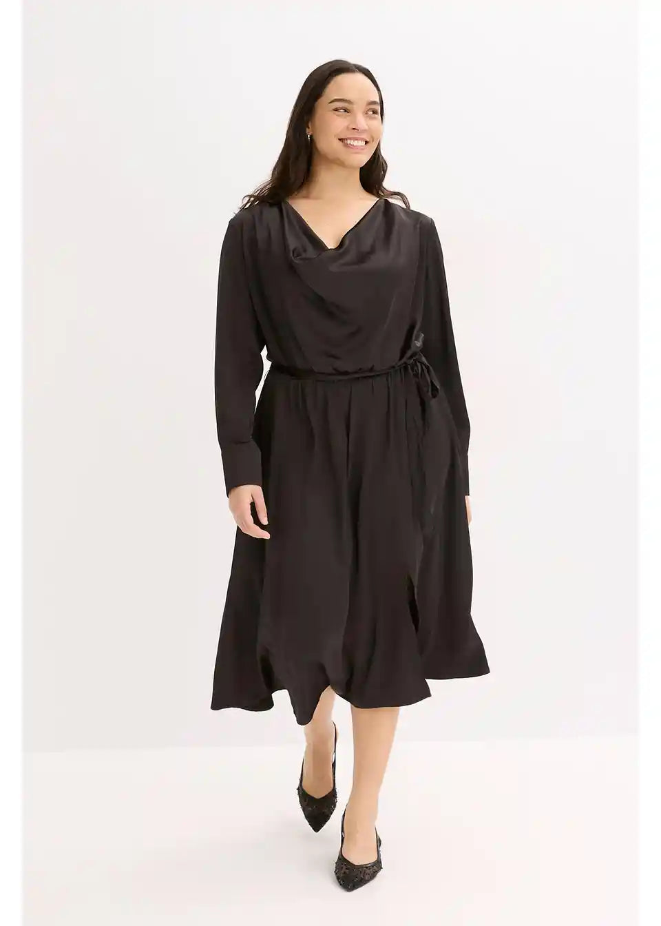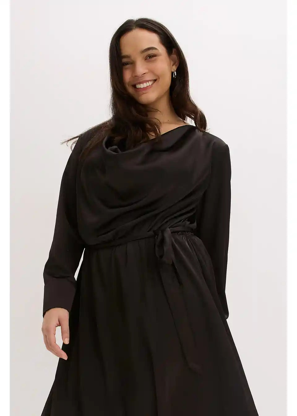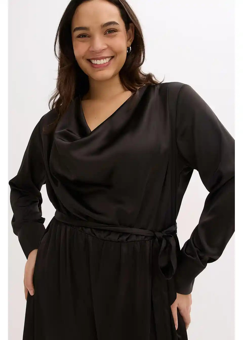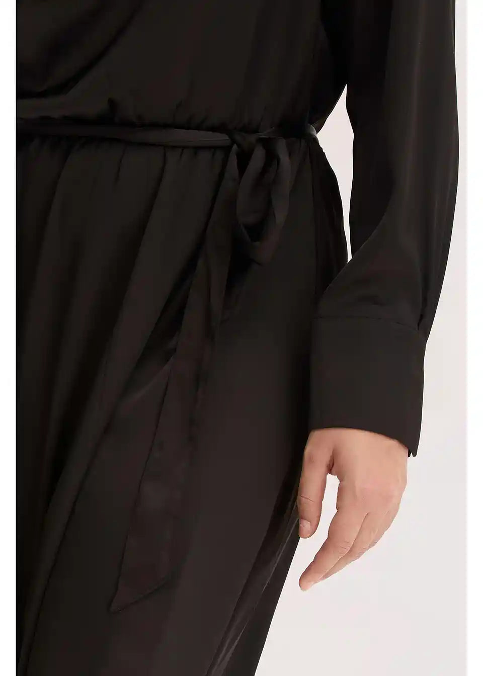 Padajoča rahlo razširjena obleka iz satena s pasom za zavezovanje