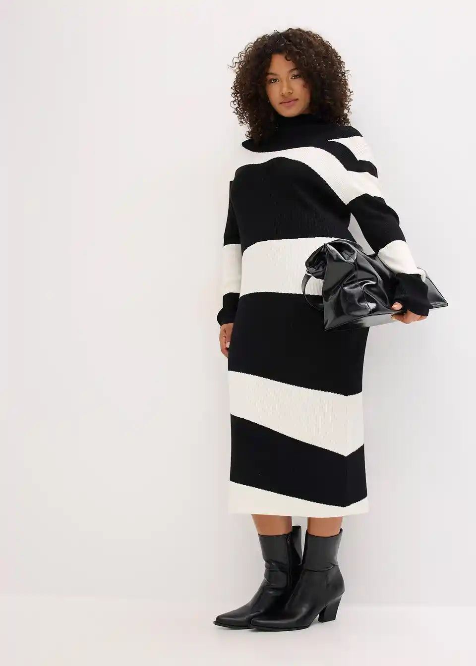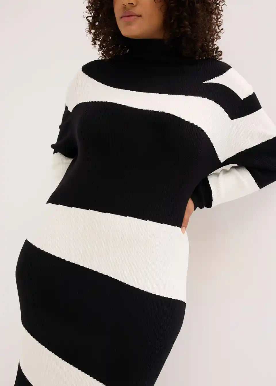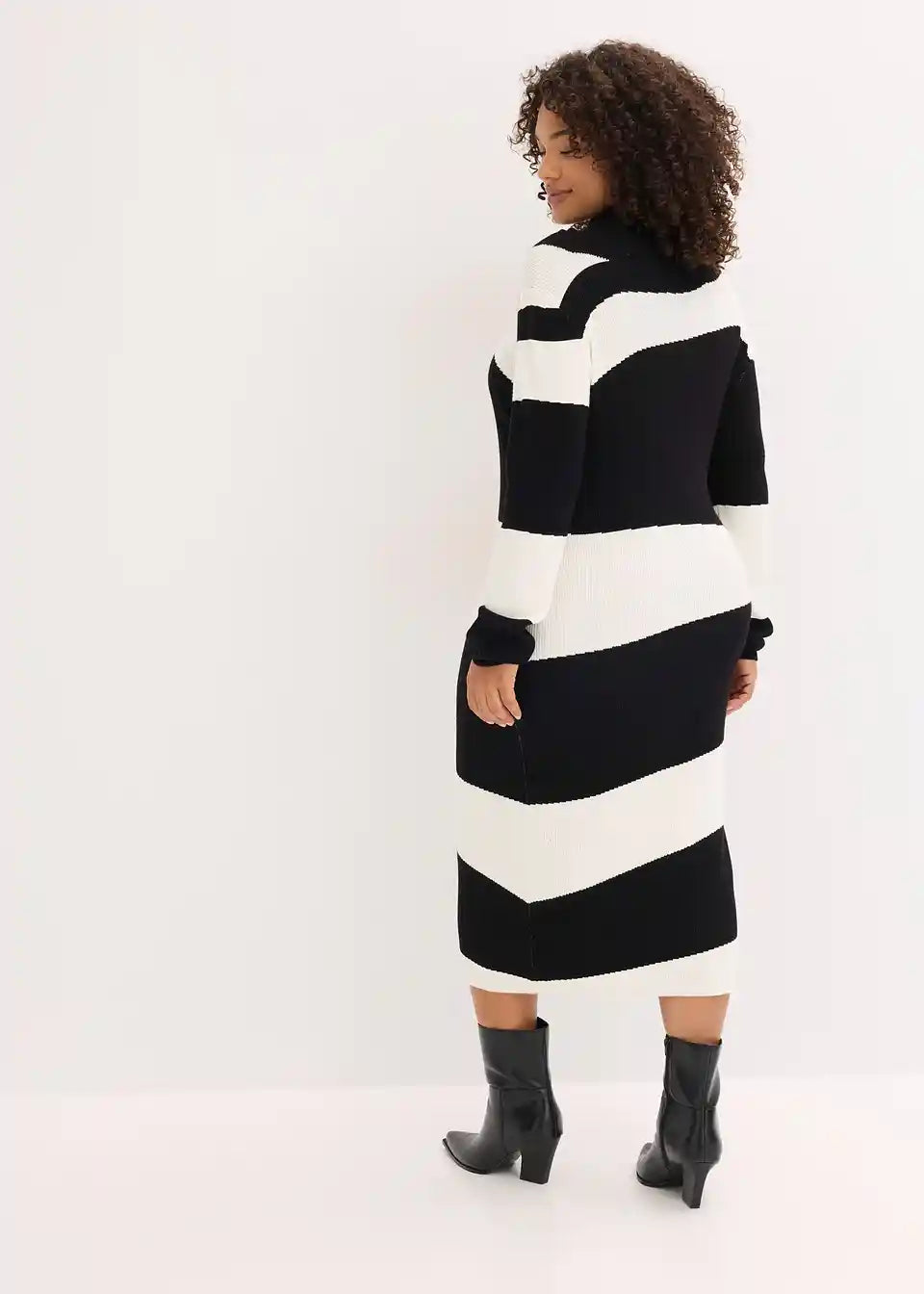 Mehka, po telesu oprijeto krojena, pletena obleka v midi dolžini