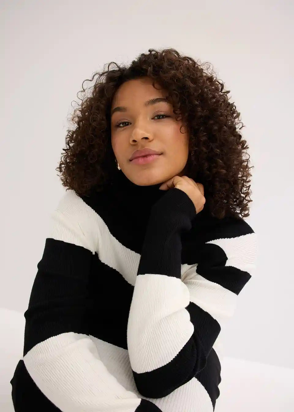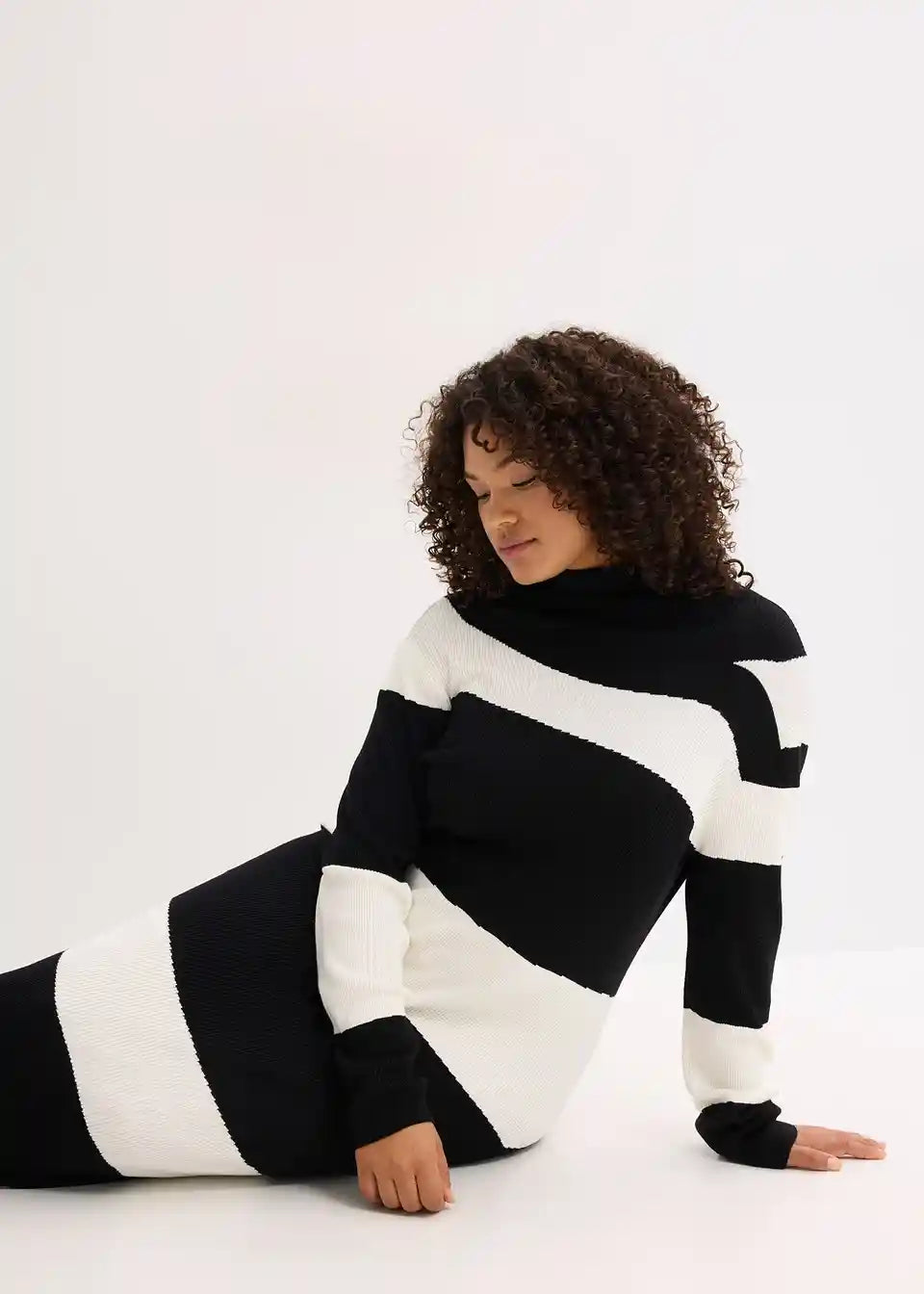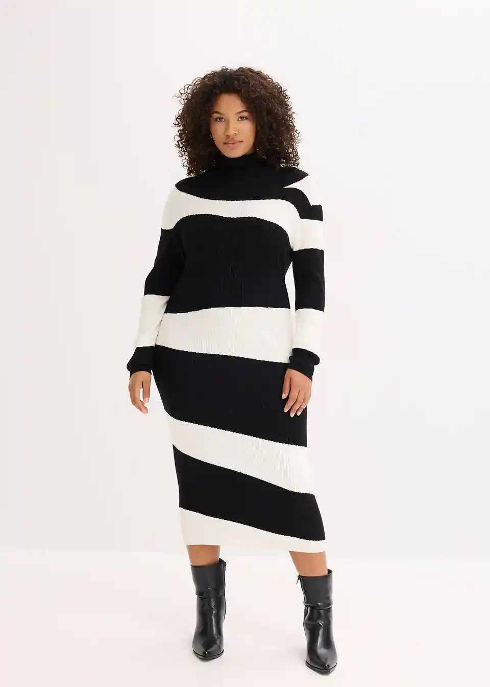 Mehka, po telesu oprijeto krojena, pletena obleka v midi dolžini