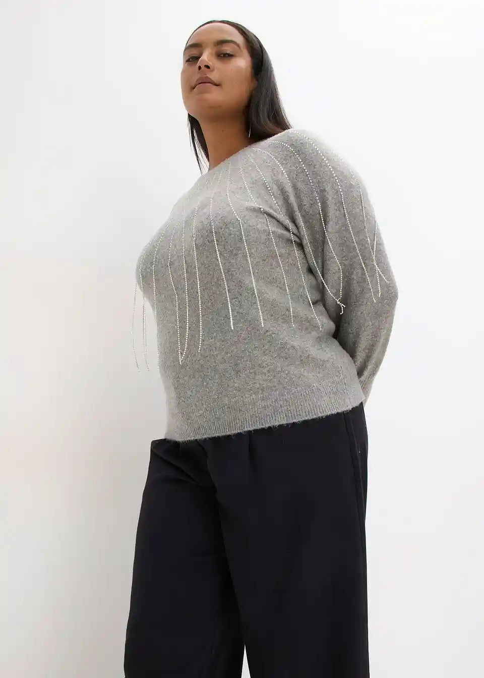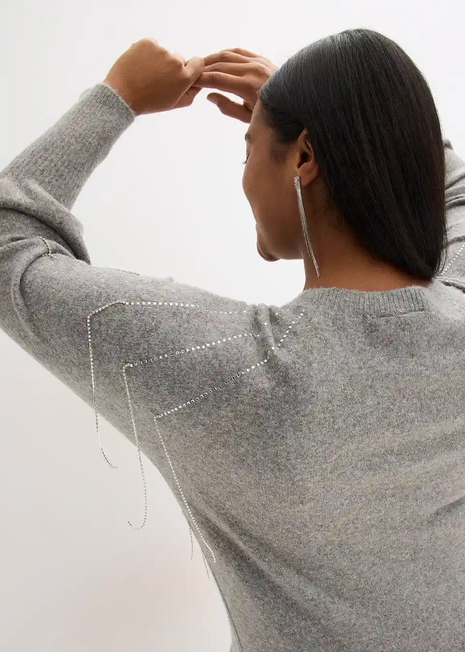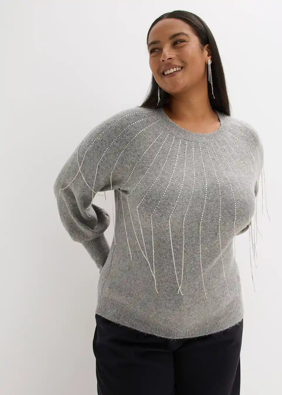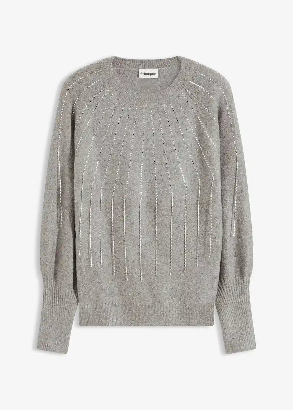 Ženstven pleten pulover z balonastimi rokavi in modno bleščečo aplikacijo z resami spredaj