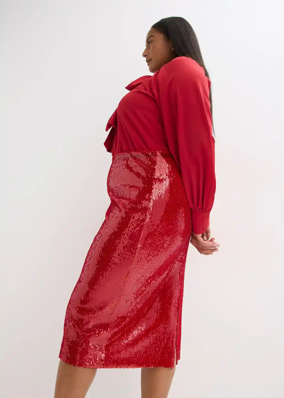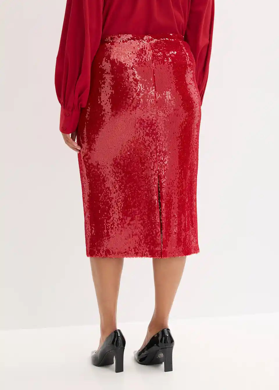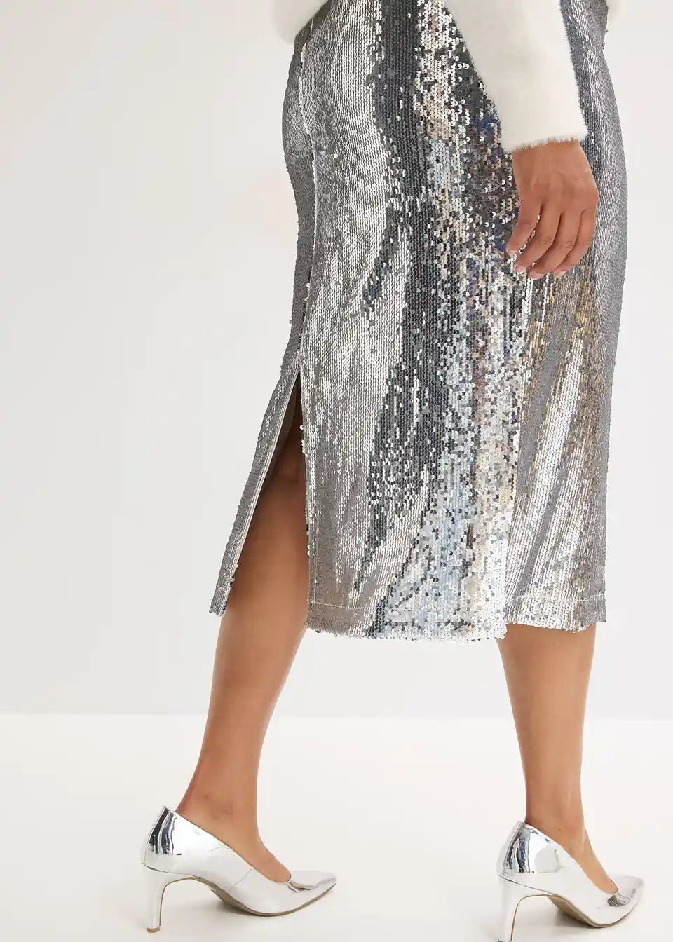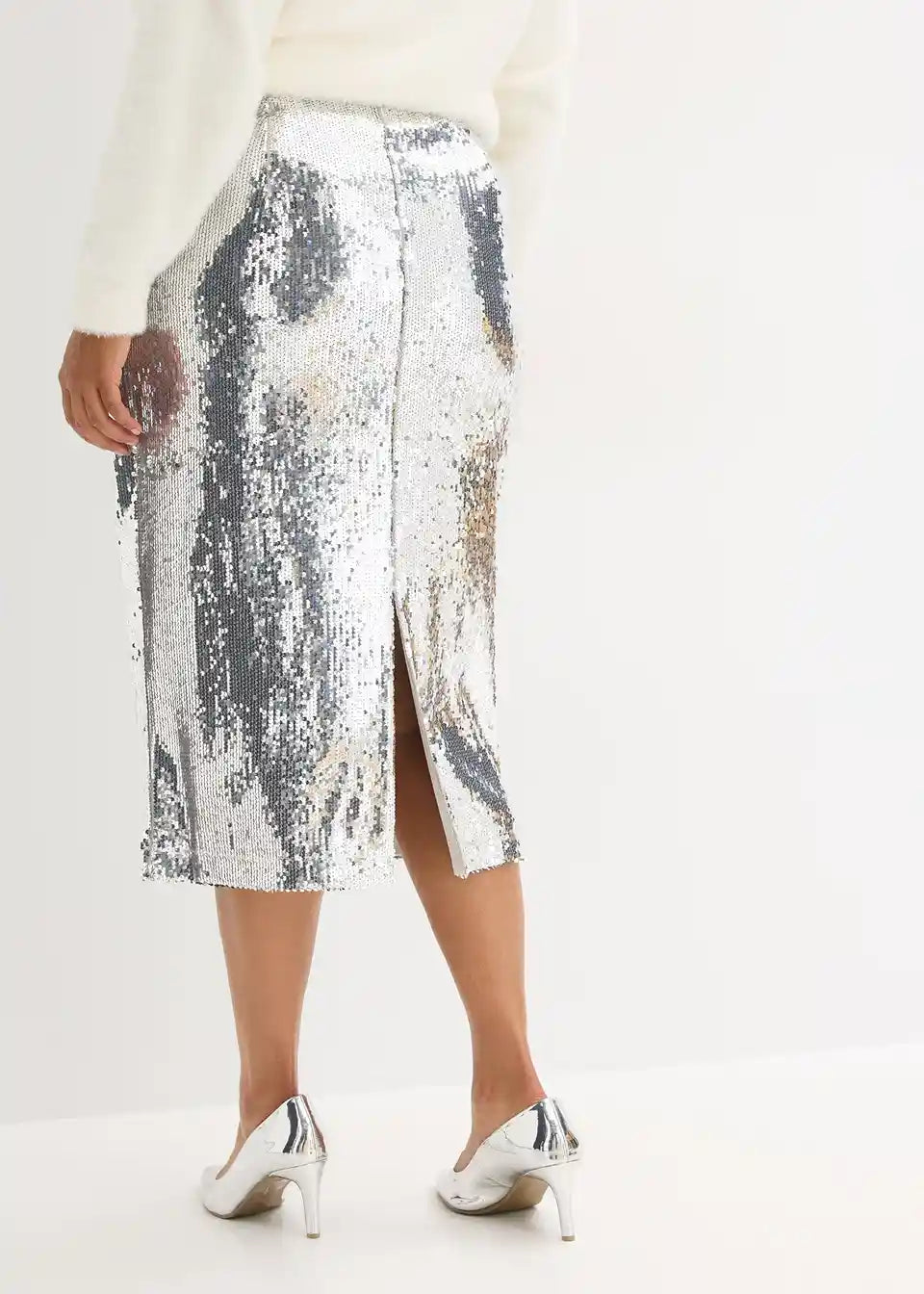 Modno krilo z bleščicami v midi dolžini z znotraj ležečo elastiko v pasu in razporkom zadaj na spodnjem robu