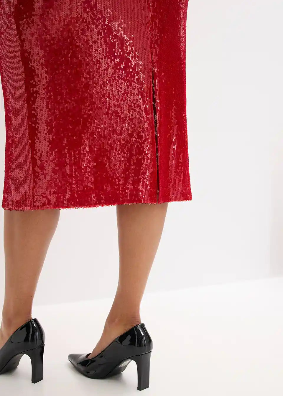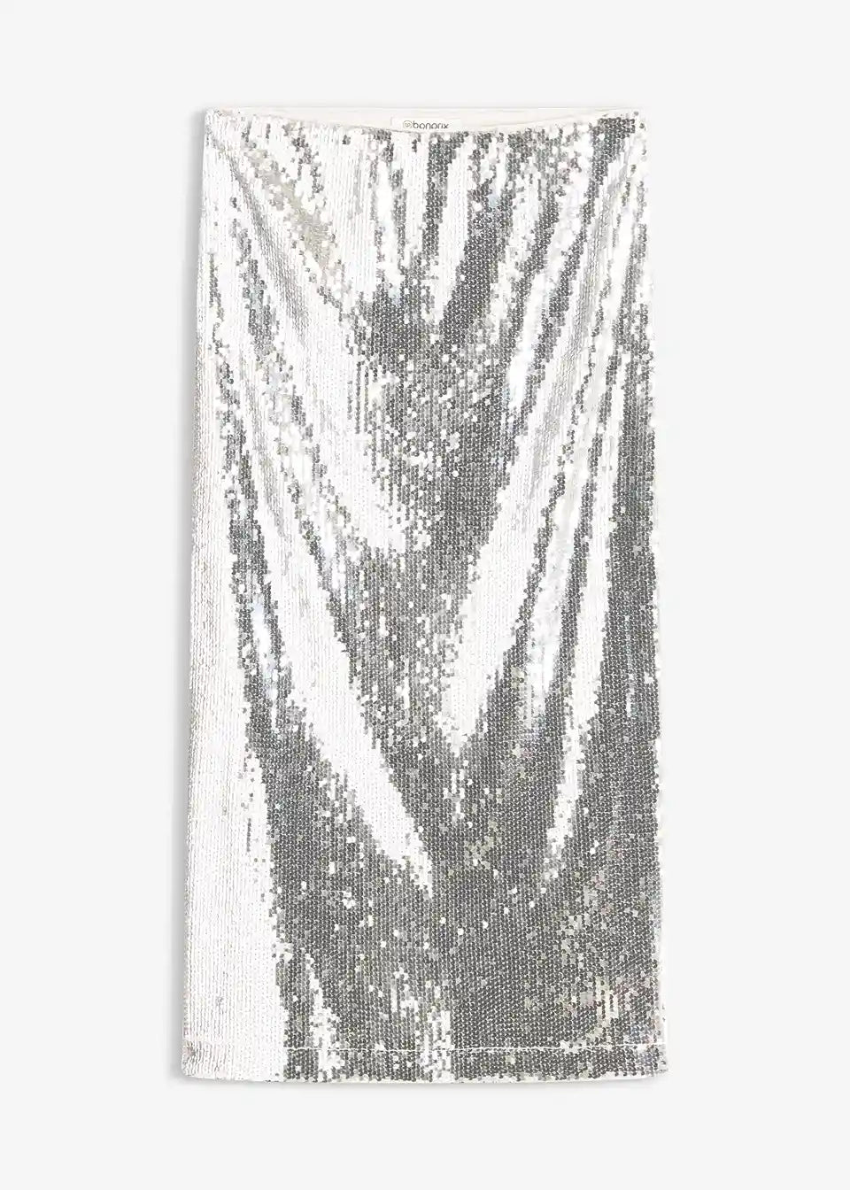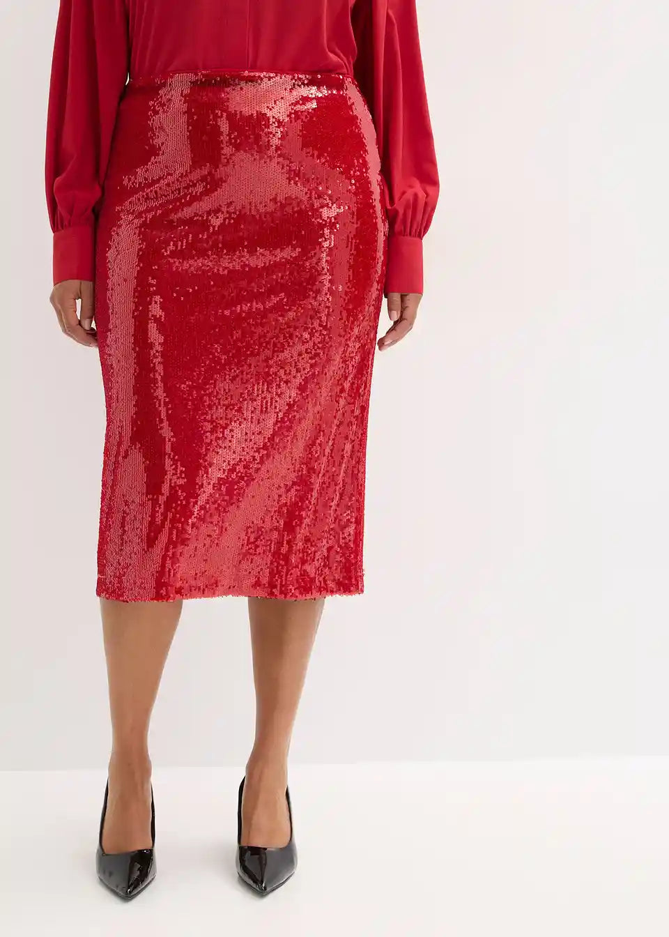Modno krilo z bleščicami v midi dolžini z znotraj ležečo elastiko v pasu in razporkom zadaj na spodnjem robu