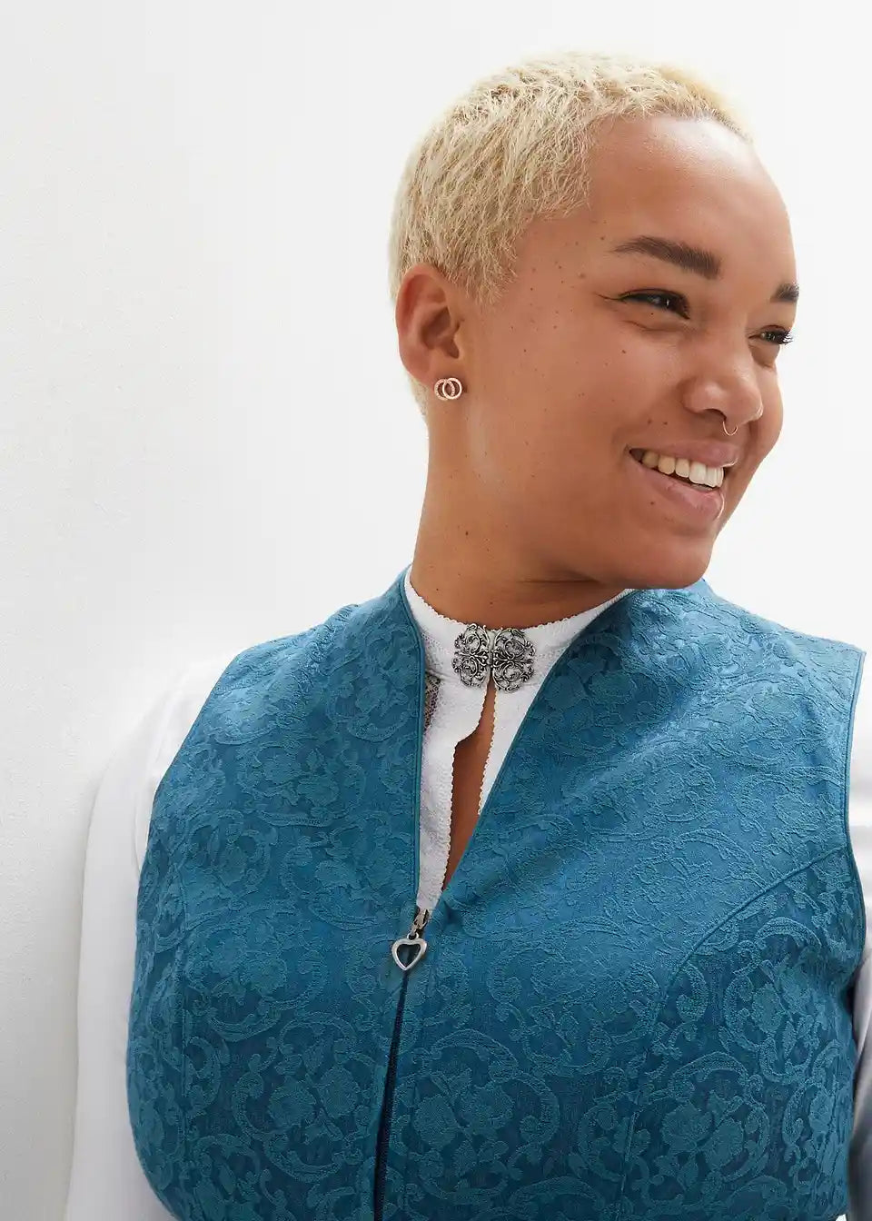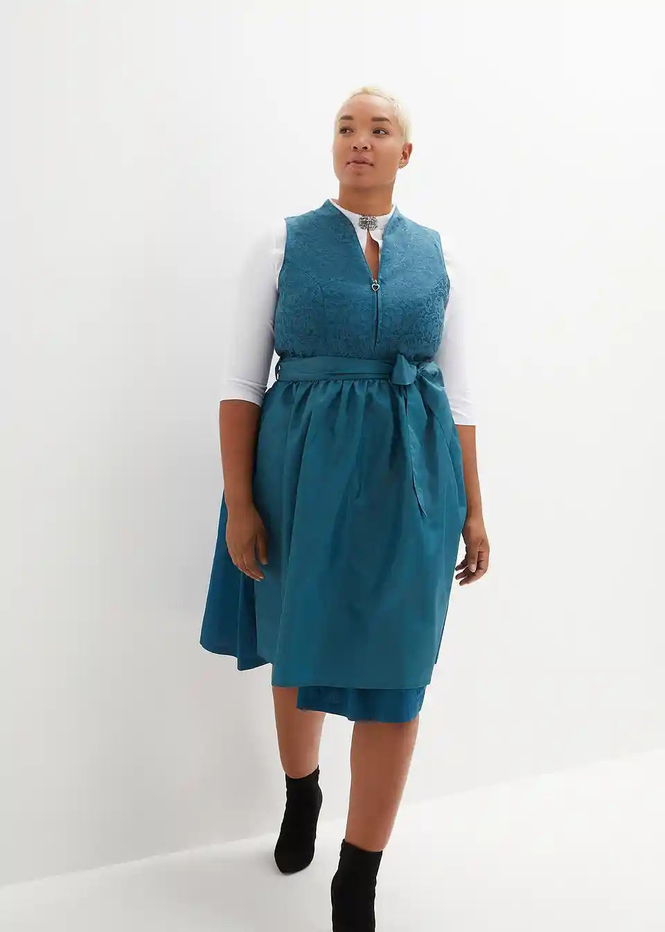Eleganten Dirndl z visokokakovostnim žakardnim življenjem in stoječim ovratnikom, krilo je podloženo z udobno bombažno tkanino.