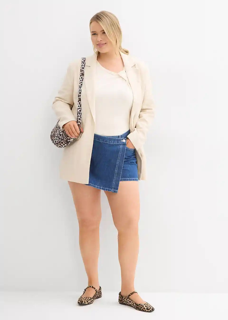 Jeans hlačno krilo z videzom ovijanja iz izredno lahkega low Stretch denima. Dolžina pri vel. 42 cca 8,5 cm, pralno v pralnem stroju.