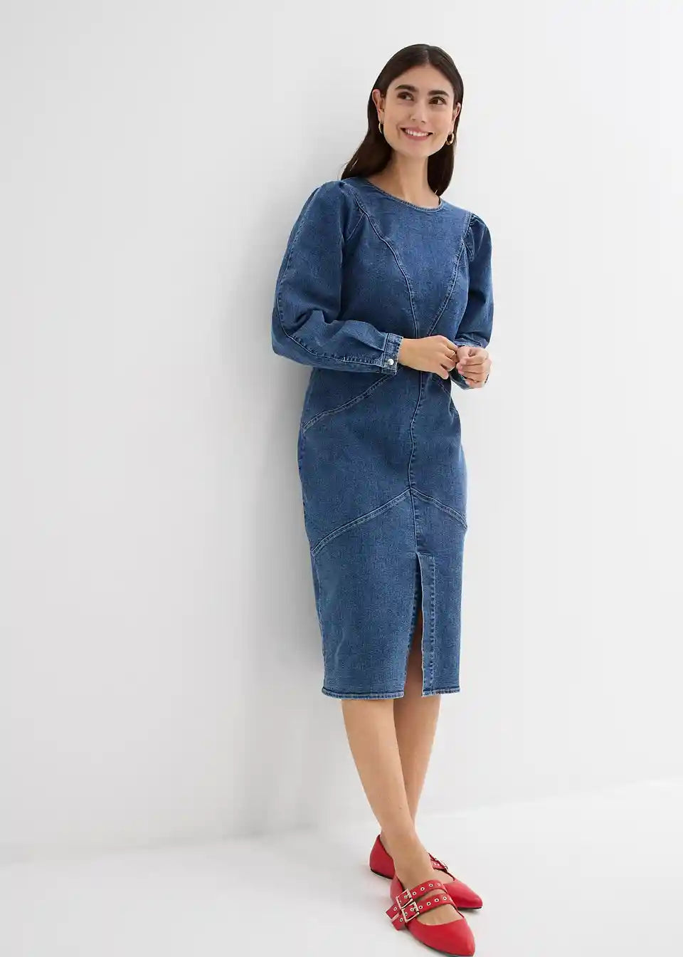 Midi jeans obleka s širokimi rokavi in poudarjenim pasom
