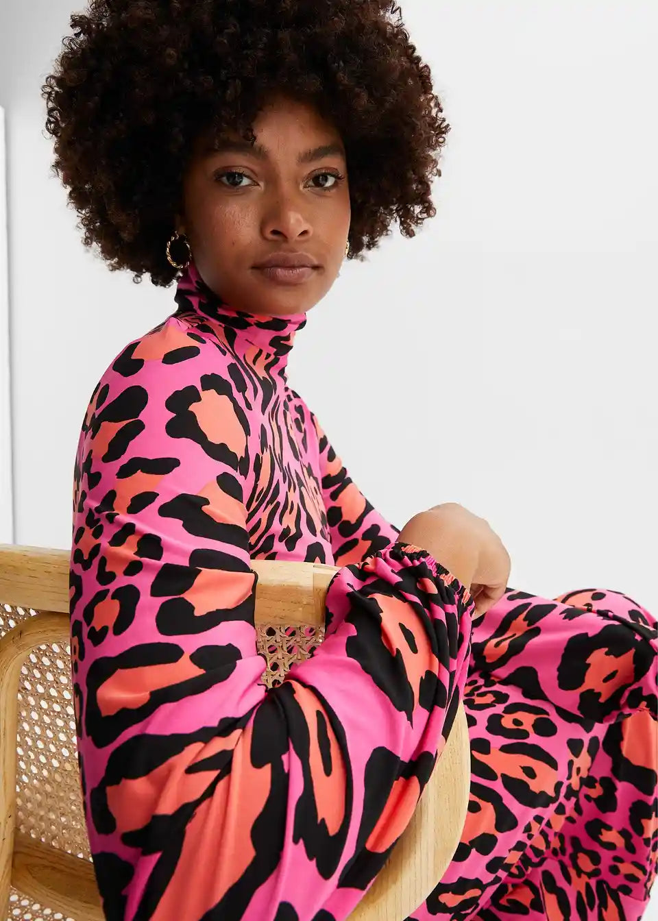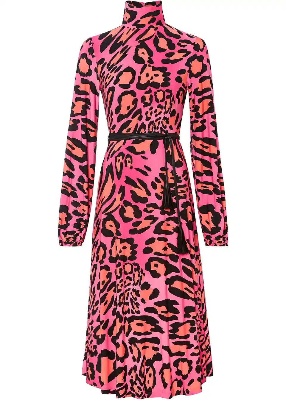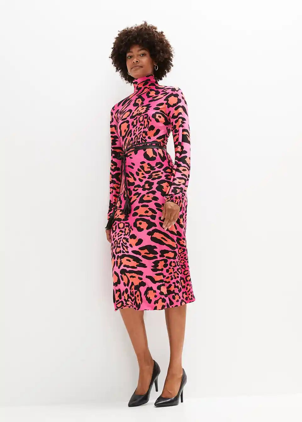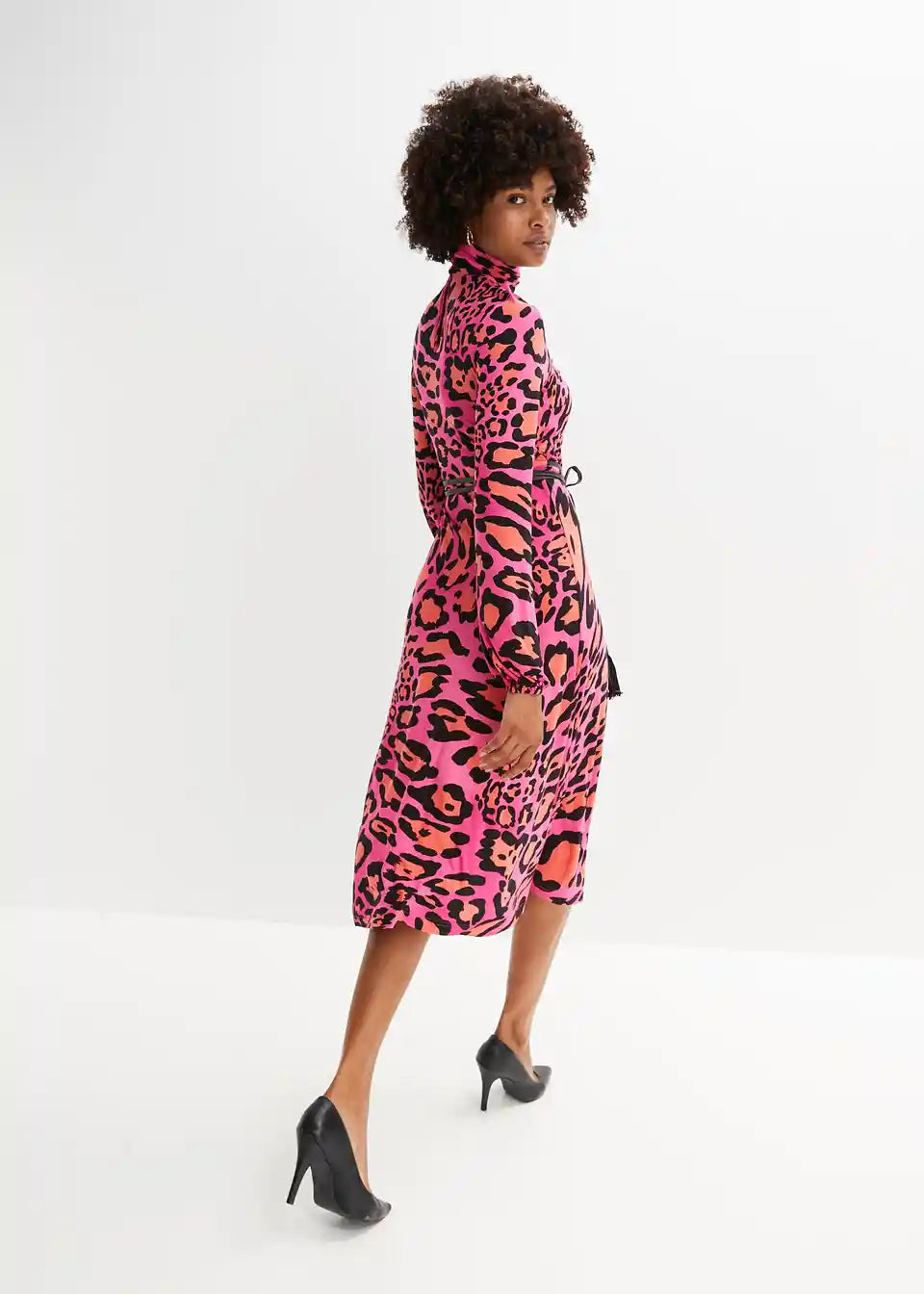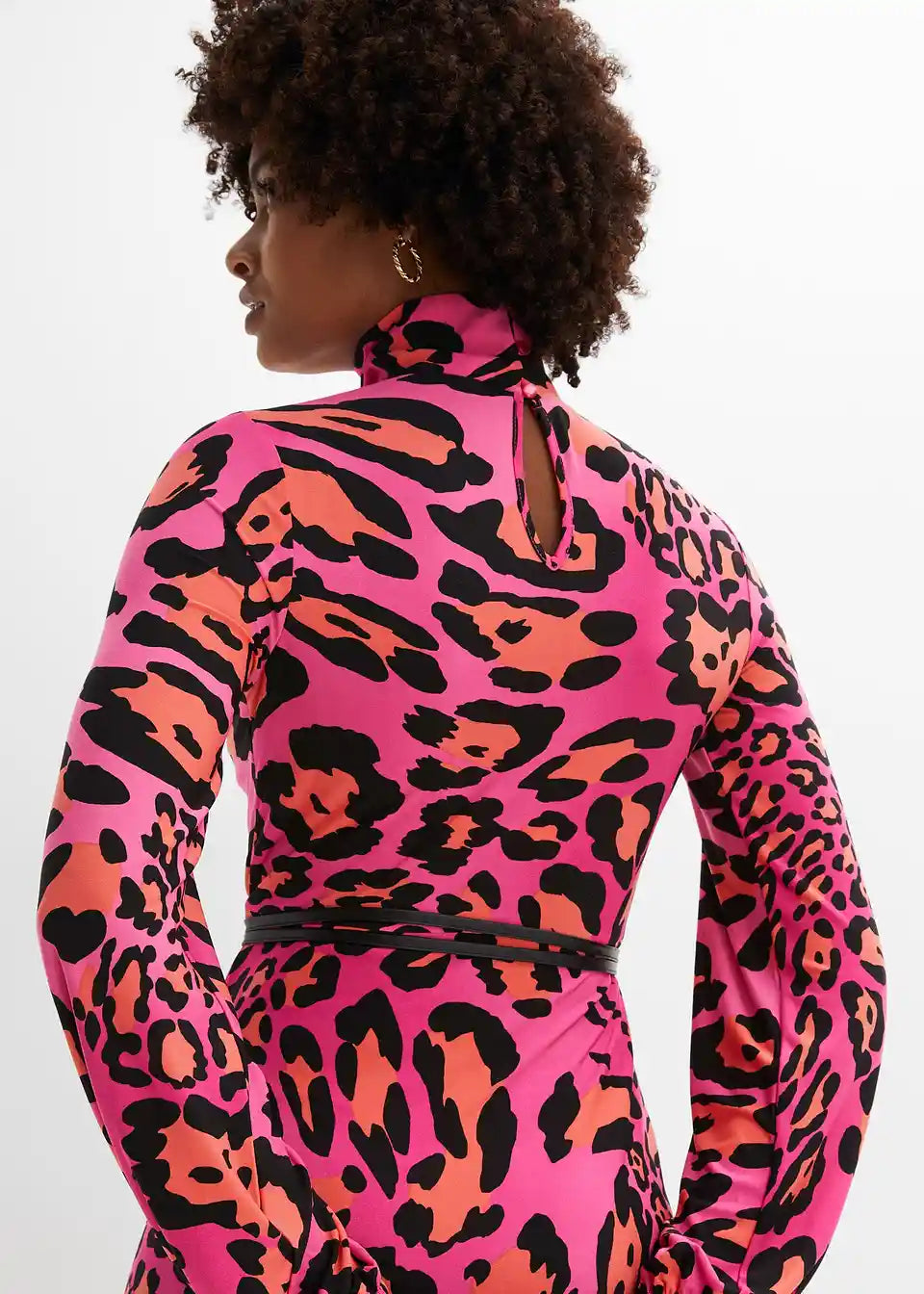 Obleka iz jerseyja s pokončnim ovratnikom in trakom za zavezovanje iz umetnega usnja