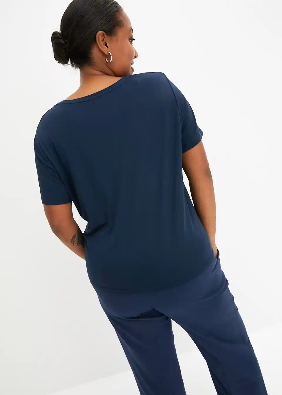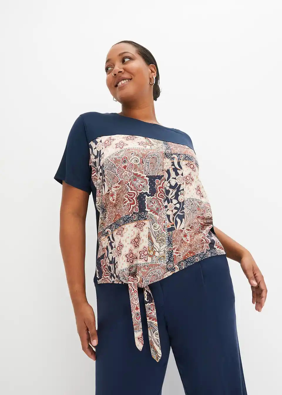 modna majica z natisnjenim tkanim materialom spredaj in detajlom vozla na robu