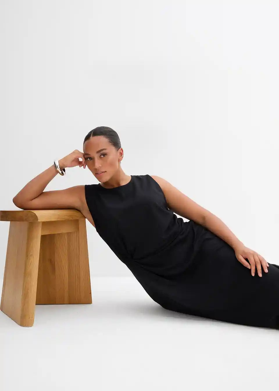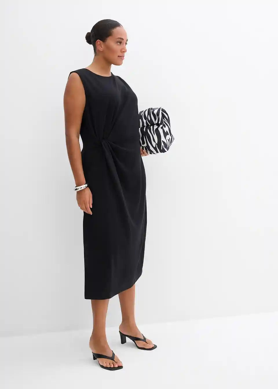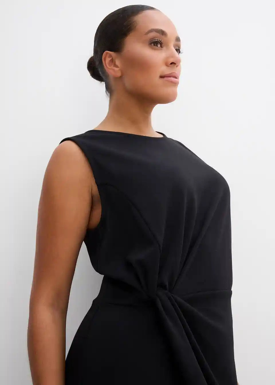 Srednje dolga obleka brez rokavov z okroglim izrezom in detajlom vozla na strani. Rob z razporkom ob strani in skrita zadrga na hrbtni strani.