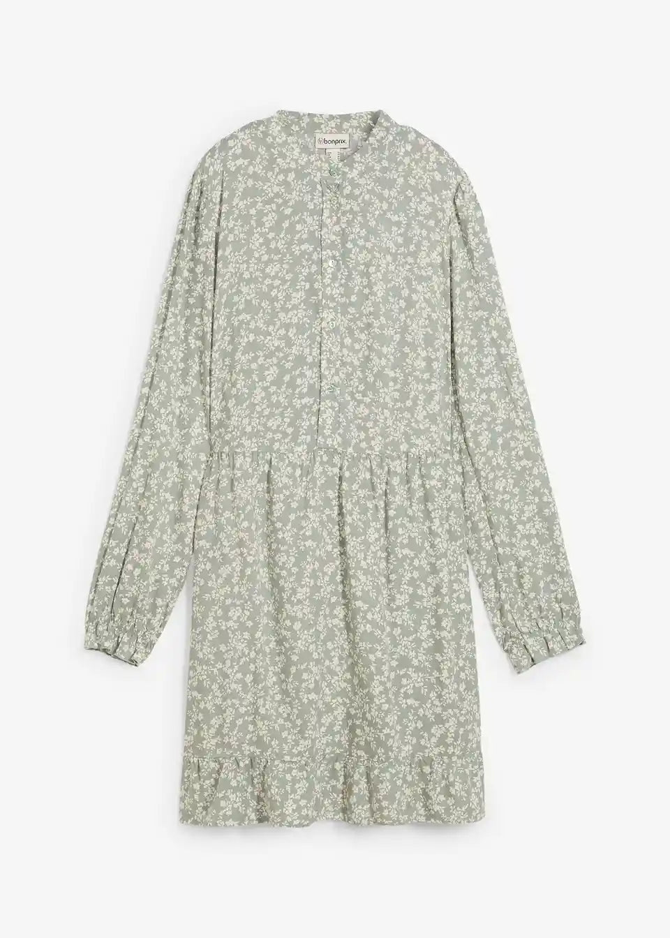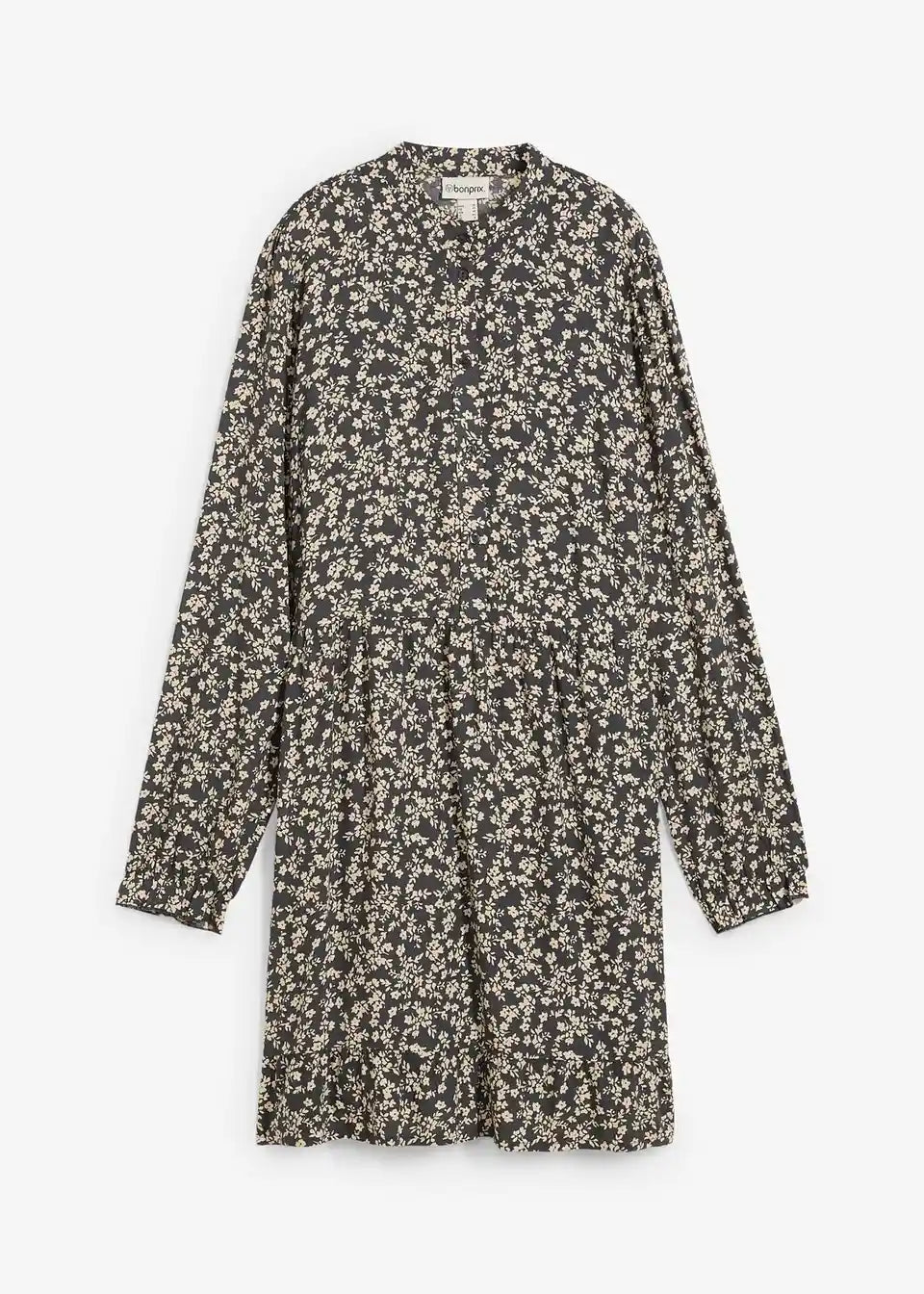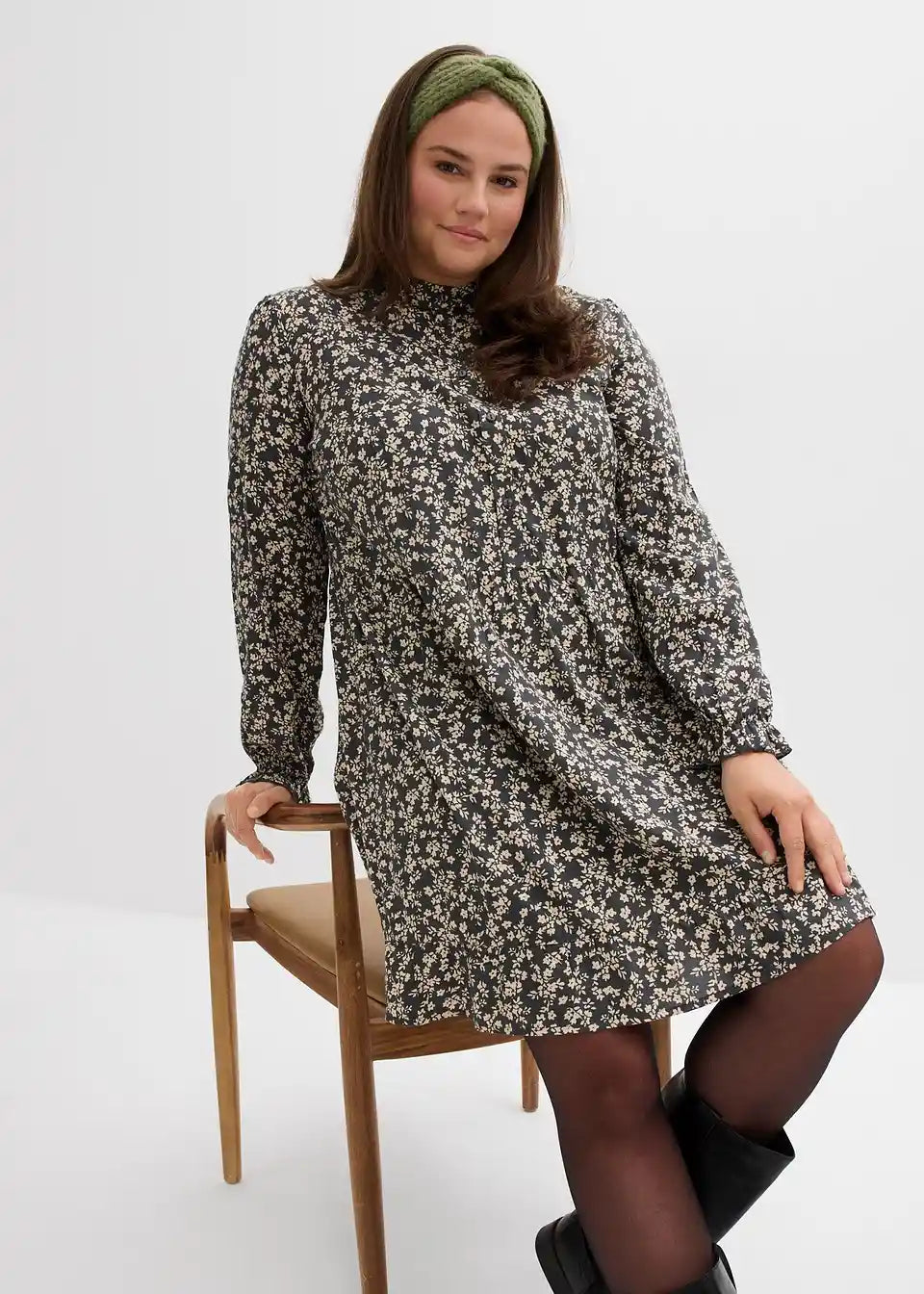 Široka kratka obleka z balonastimi rokavi in naborki na zaključkih rokavov
