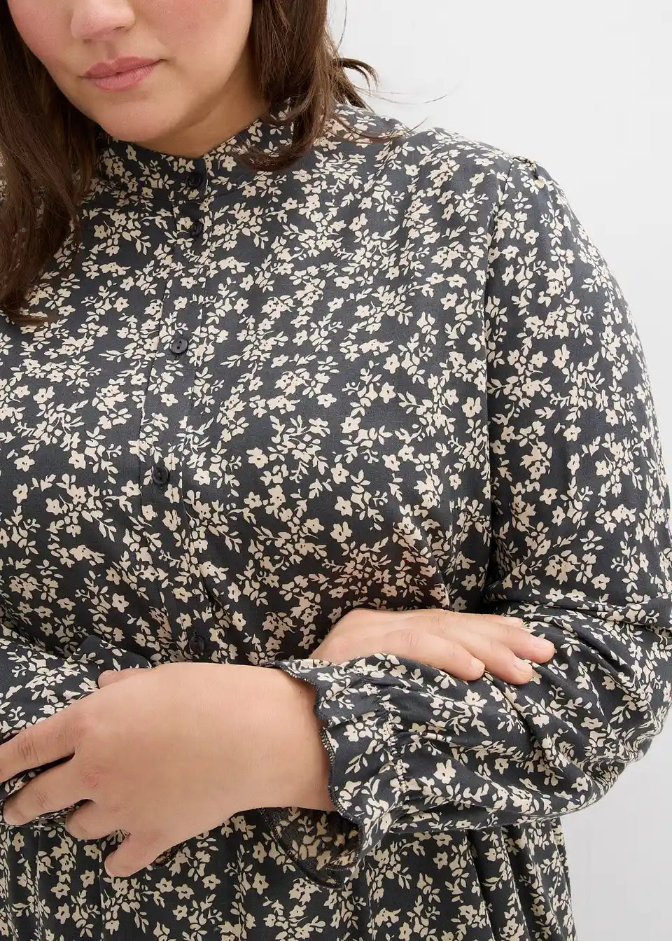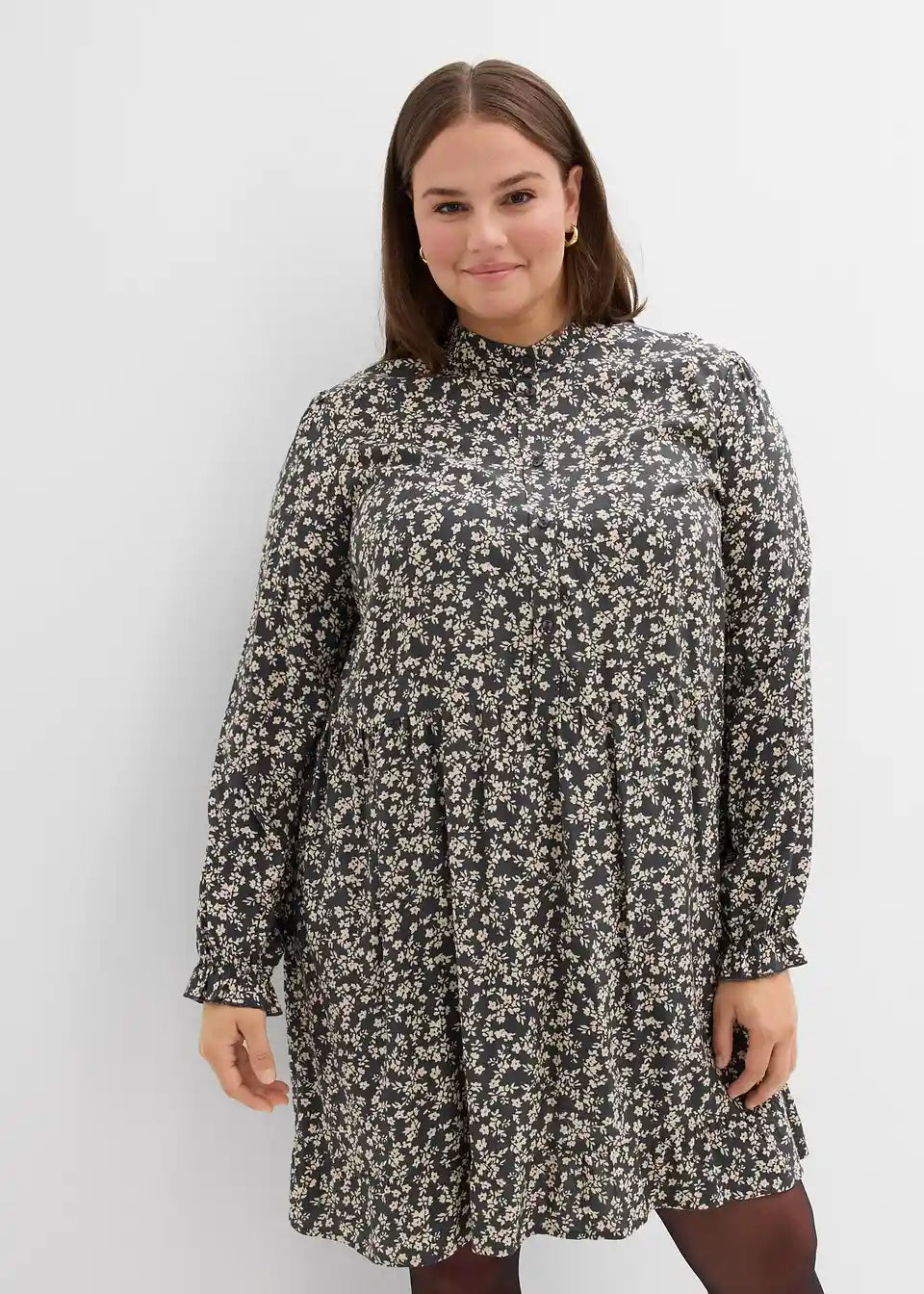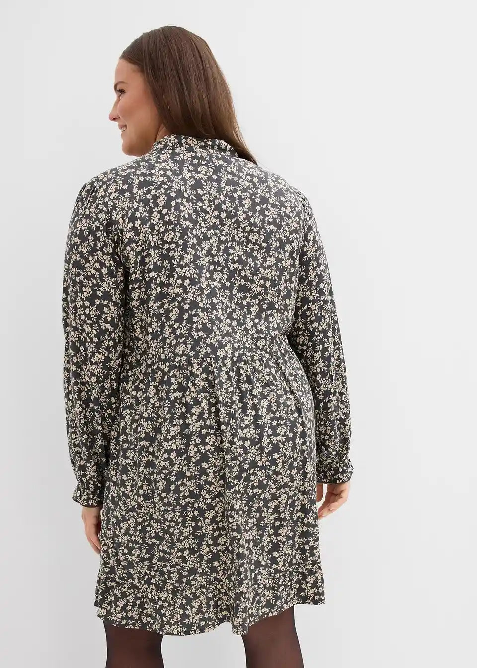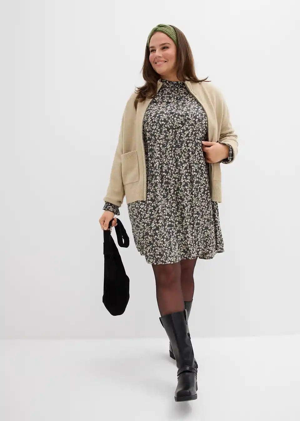 Široka kratka obleka z balonastimi rokavi in naborki na zaključkih rokavov