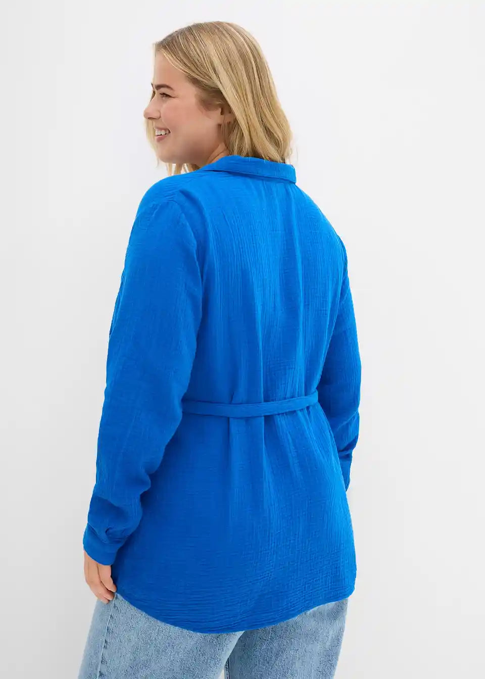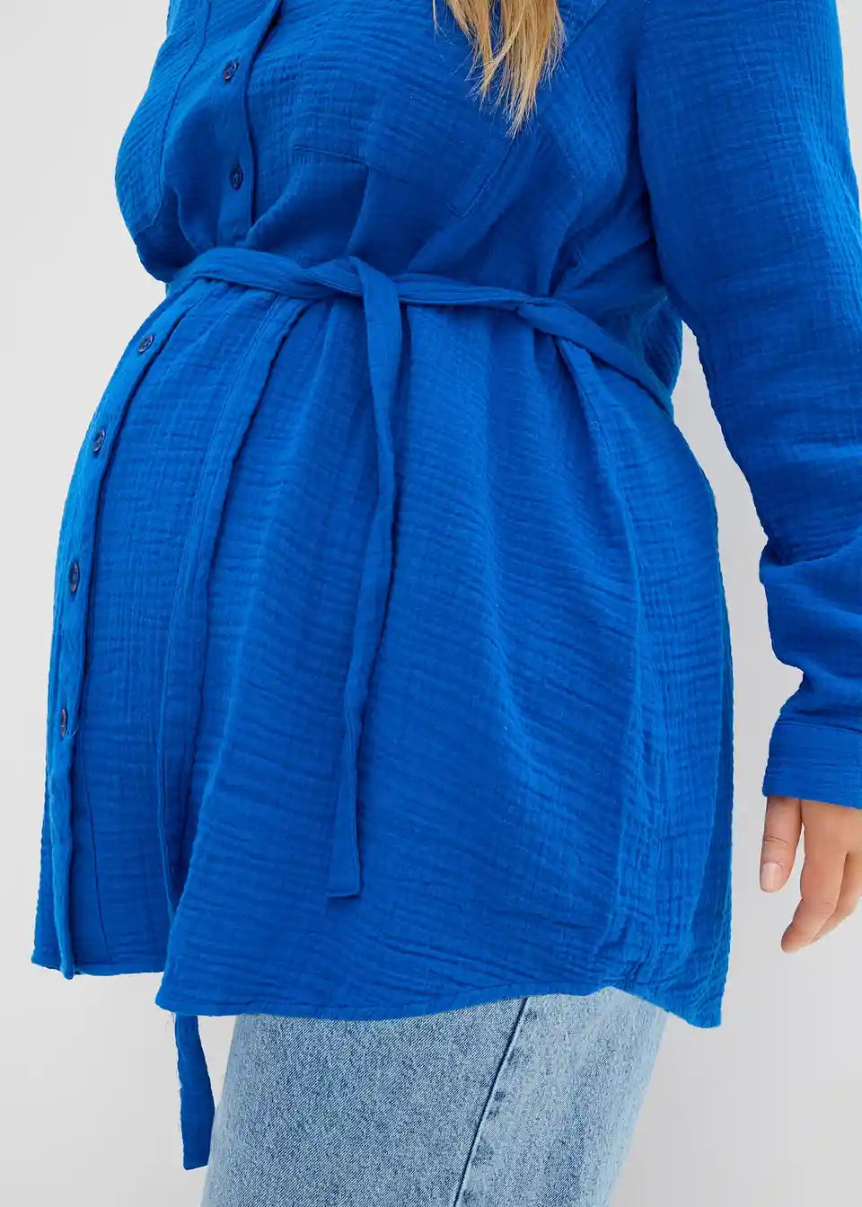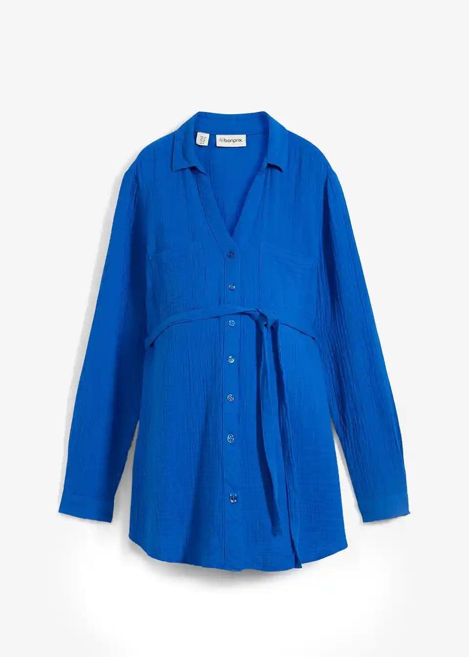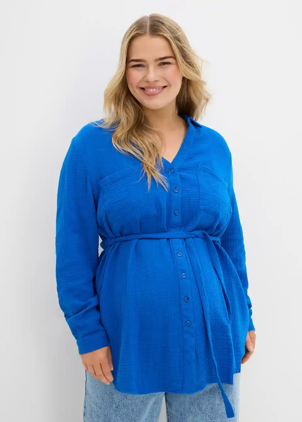 Dolgo-rokavna bluza za nosečnice in doječe matere iz kakovostnega, gosto tkanega muslina s praktičnimi prsnimi žepi in dovolj prostora za rastoči trebuh. Z neprekinjeno gumbno zapenjanjem za enostavno dojenje ter udobno oblačenje in slačenje. Širina se lahko prilagodi s snemljivim zavezovalnim pasom. Bluza se tako lahko nosi ohlapno ali oprijeto.