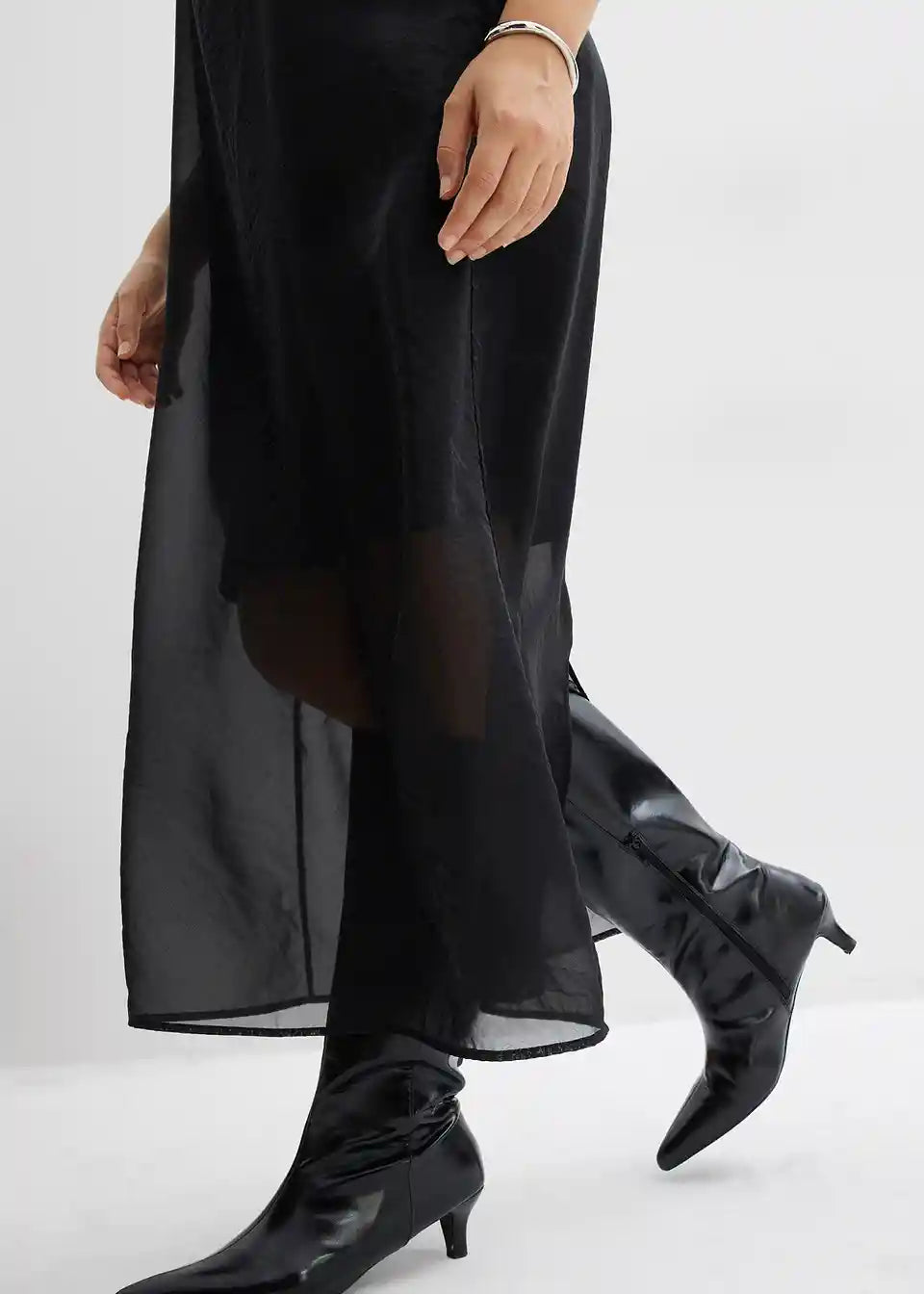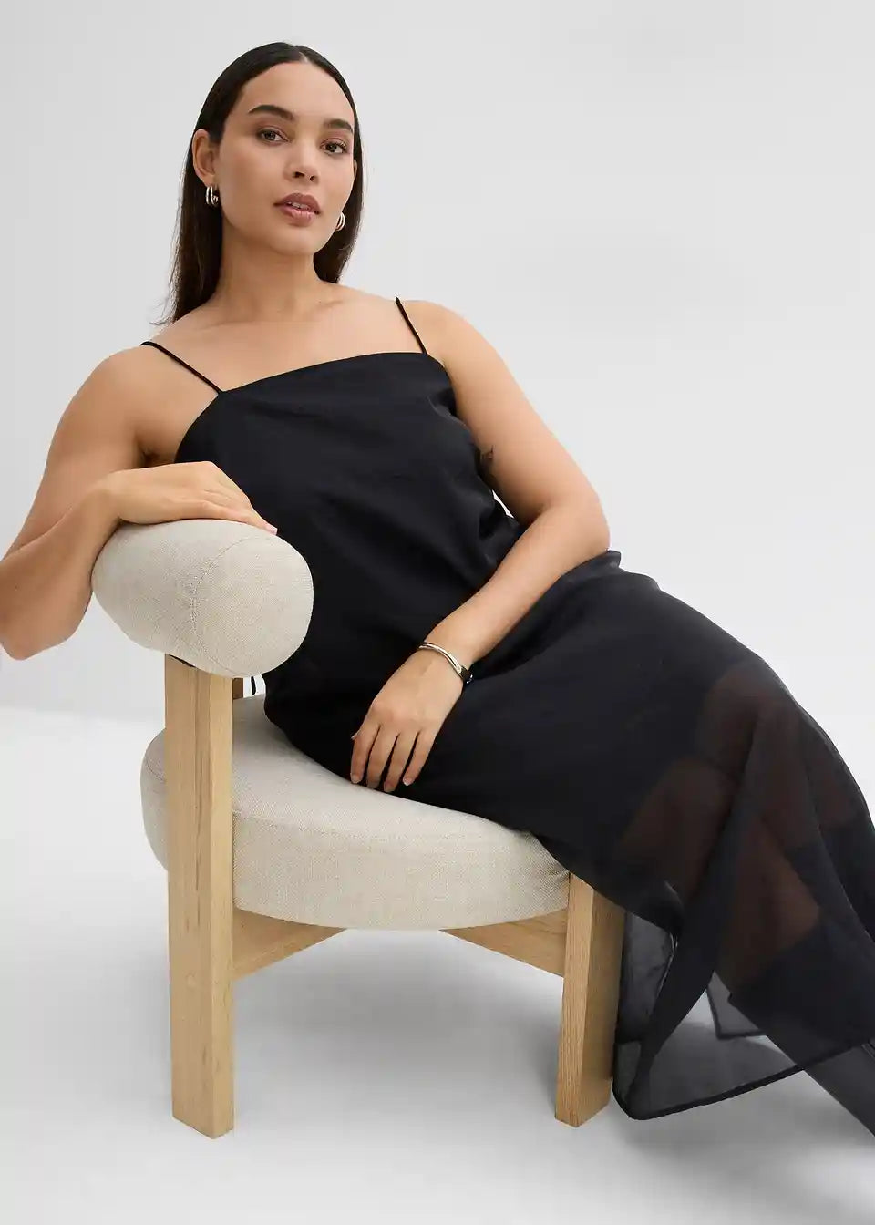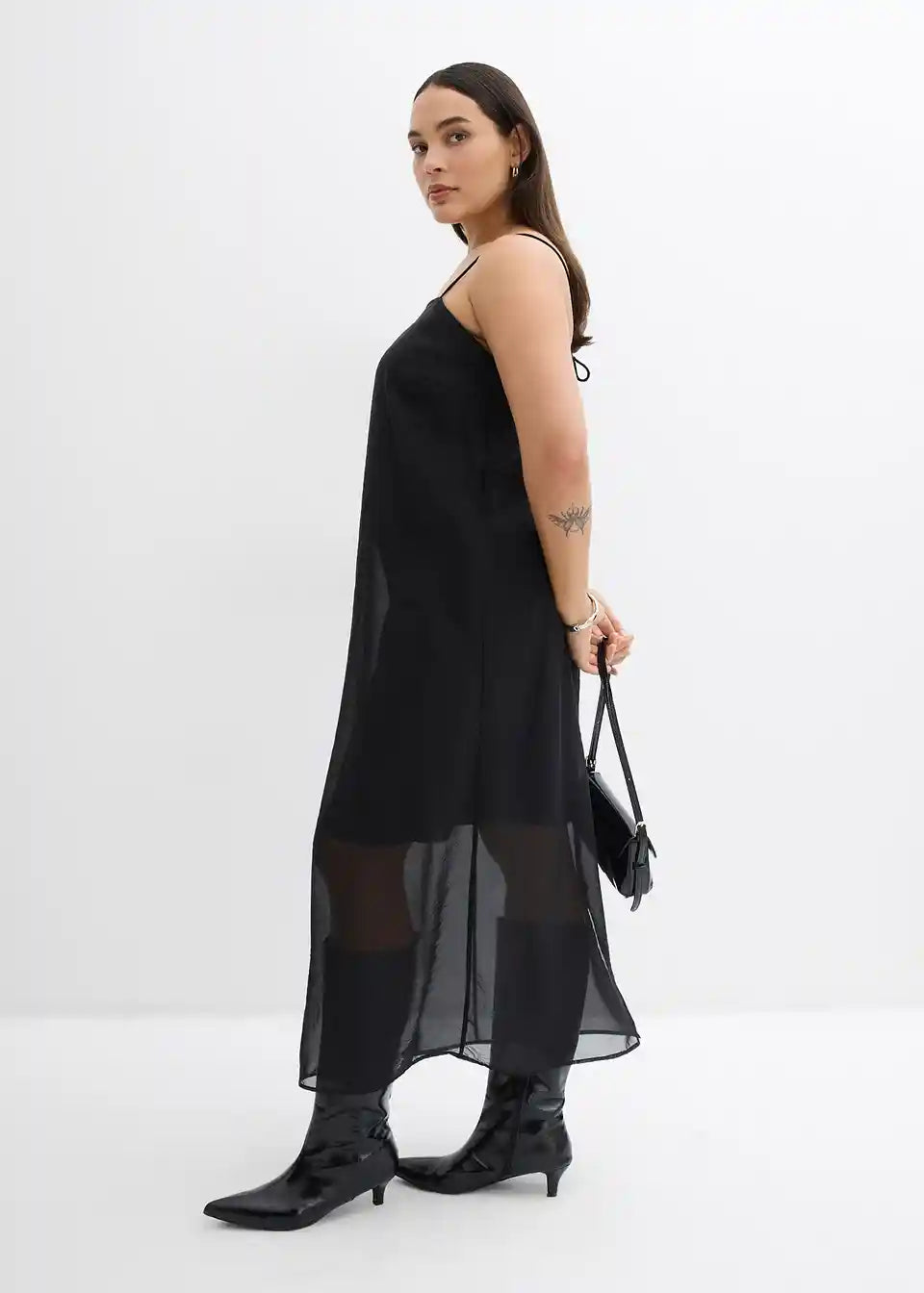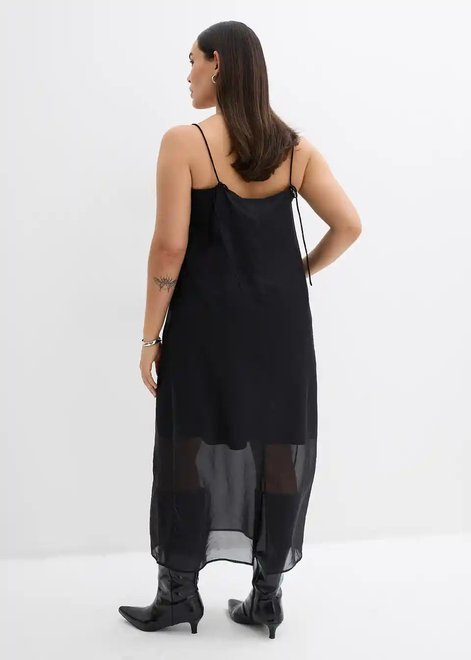 Dolga obleka s tankimi naramnicami iz različnih materialov s prosojno zgornjo obleko