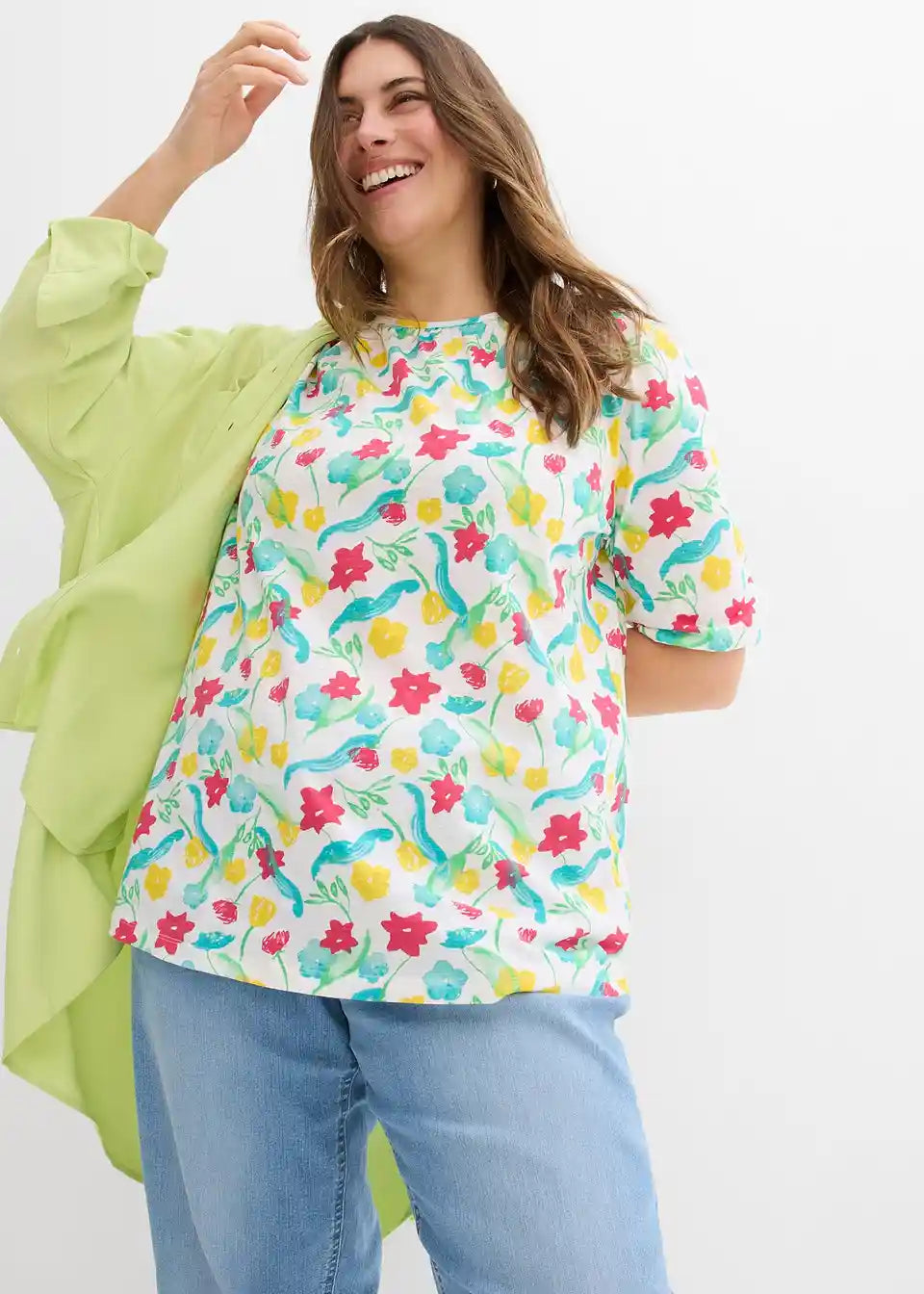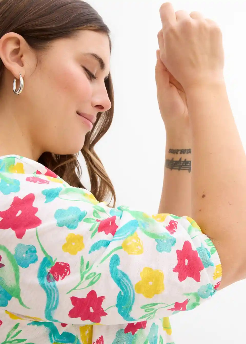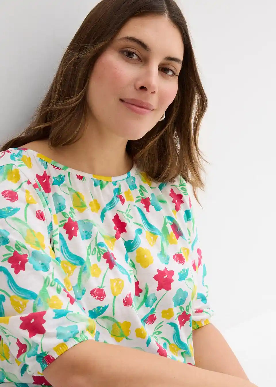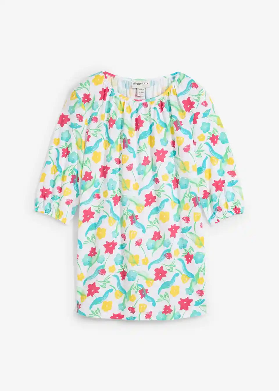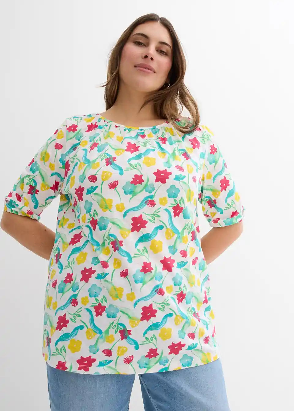 T-Shirt iz čiste bombažne tkanine. Z elastičnimi robovi na rokavih in cvetličnim potiskom.