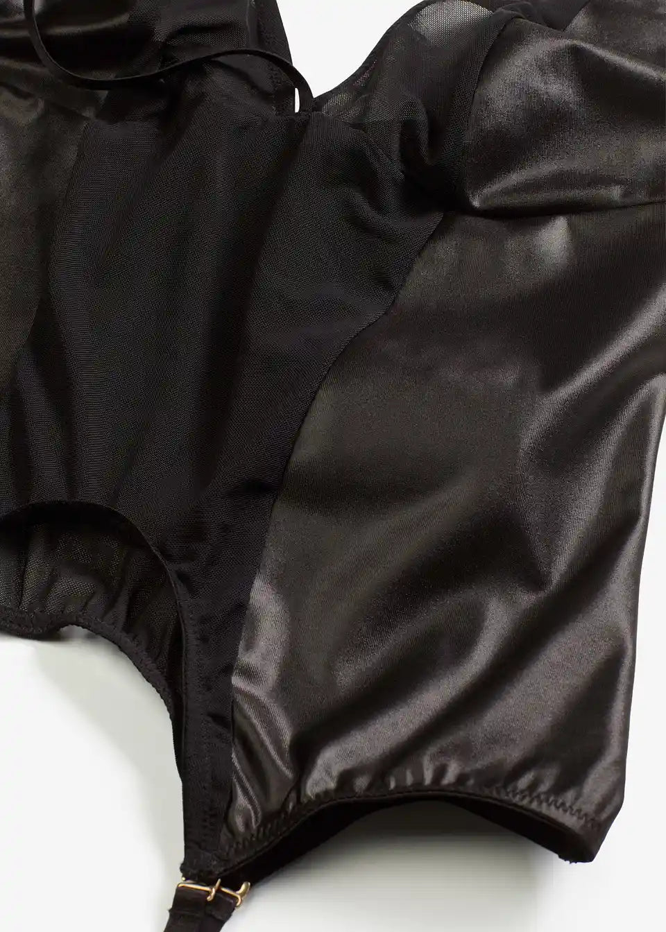 Top z držkami za nogavice in string v mokrem videzu z mrežastimi všitki.