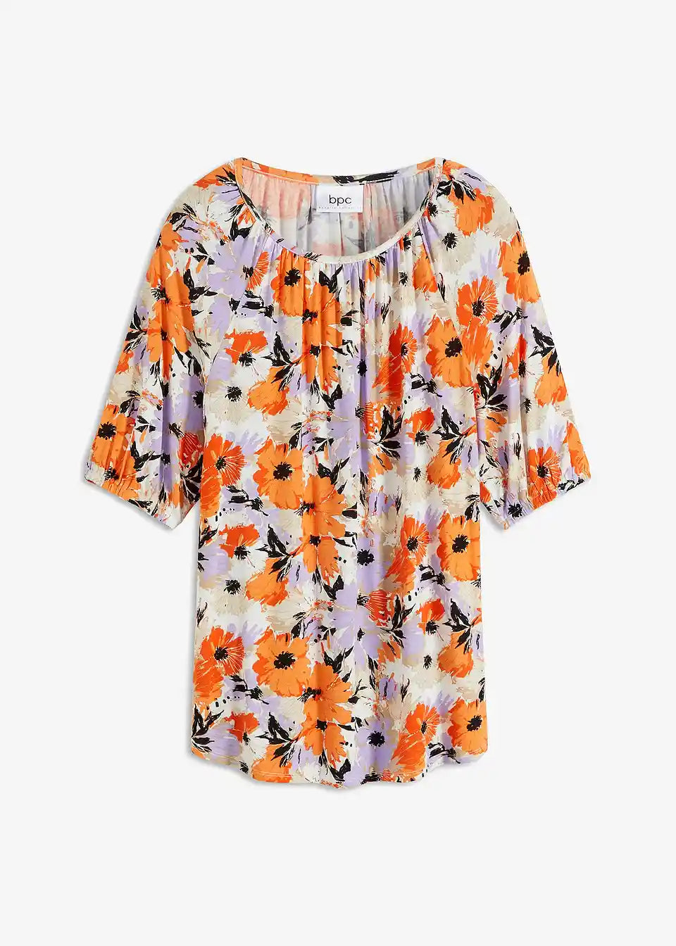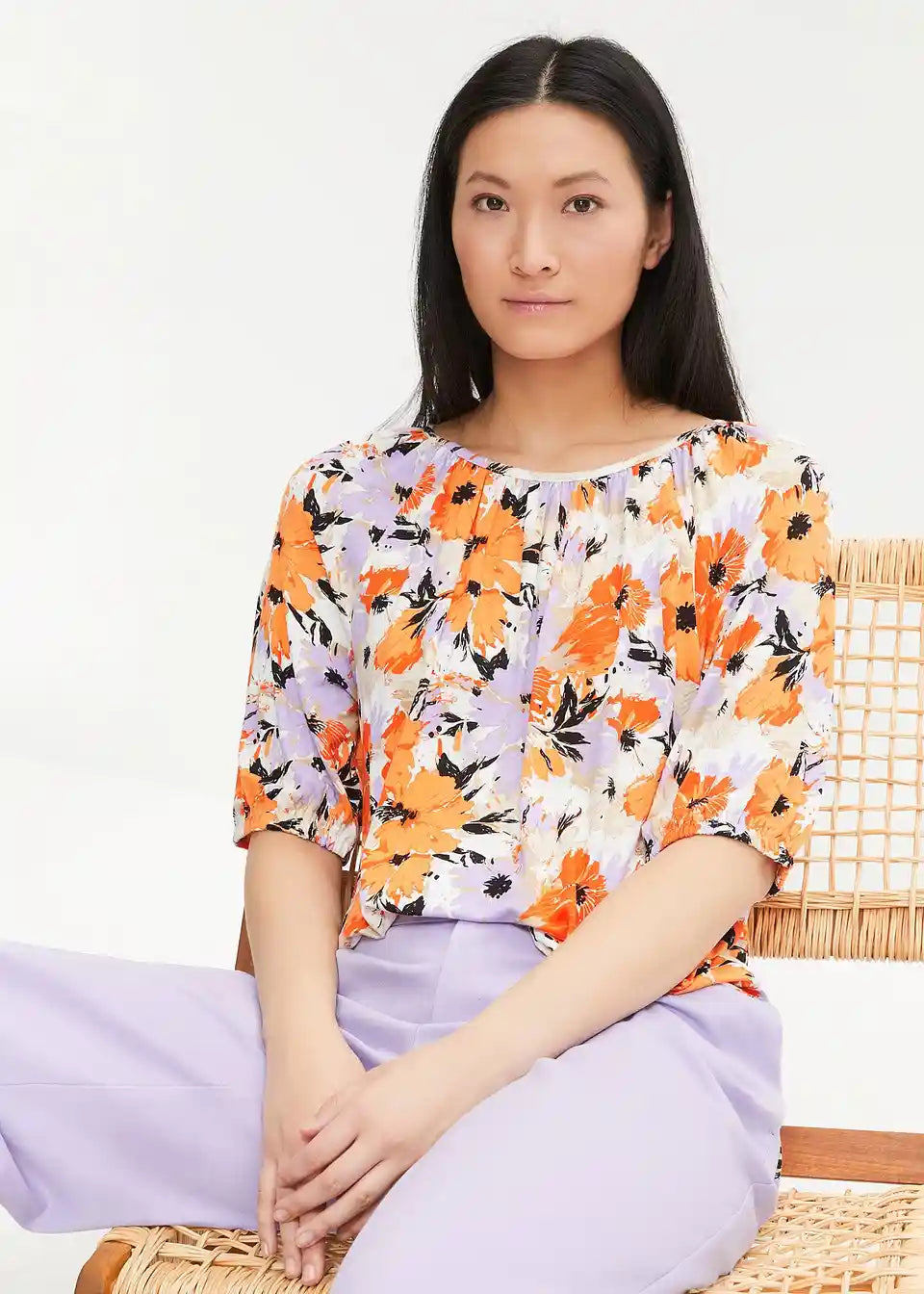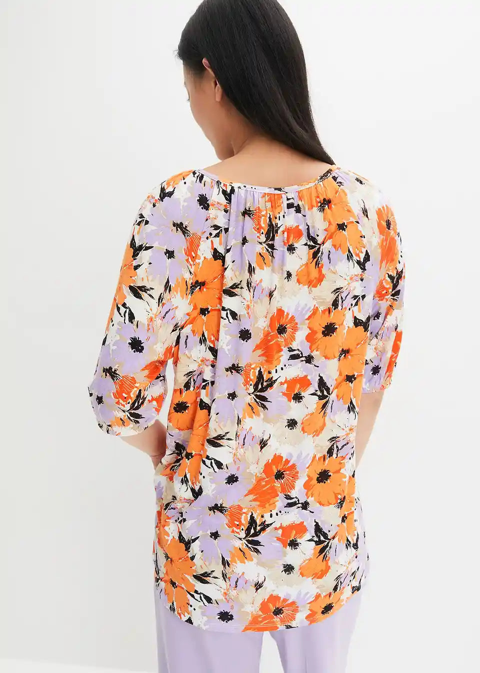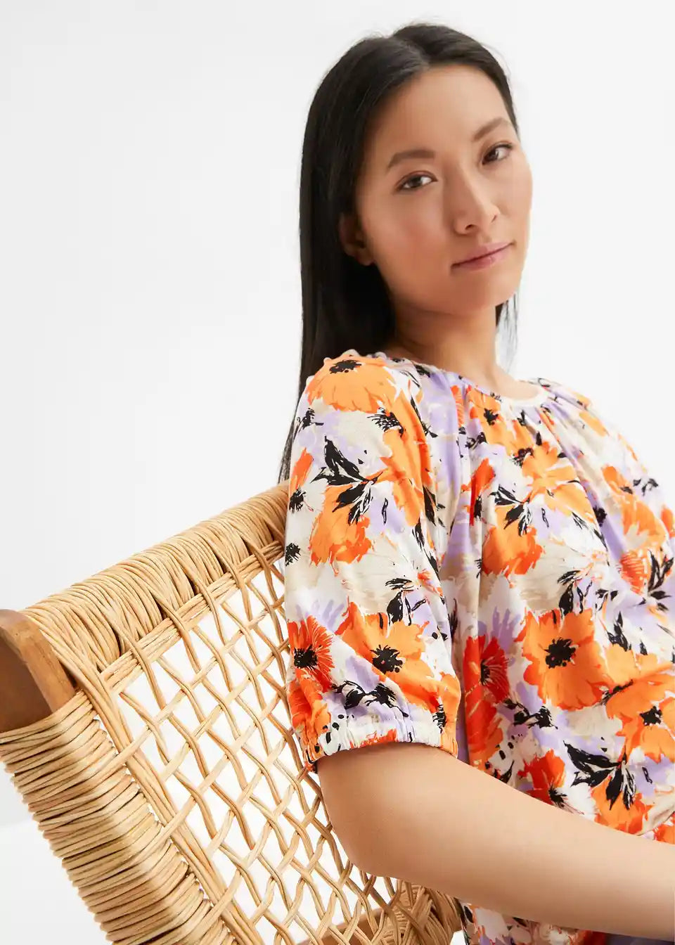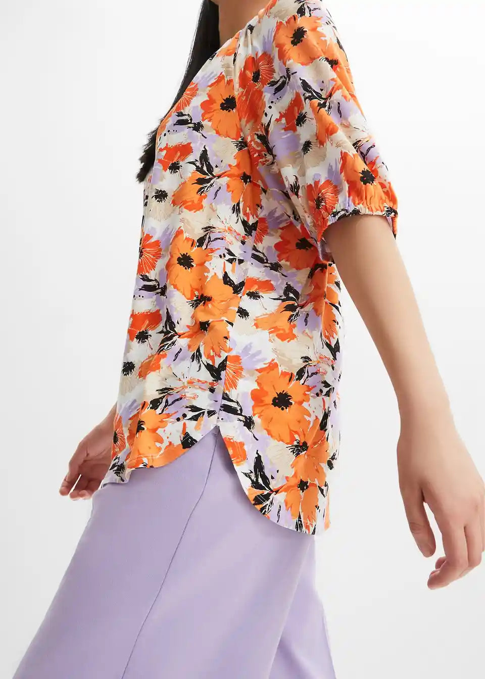 T-Shirt z V-izrezom in voluminoznimi rokavi s cvetličnim potiskom