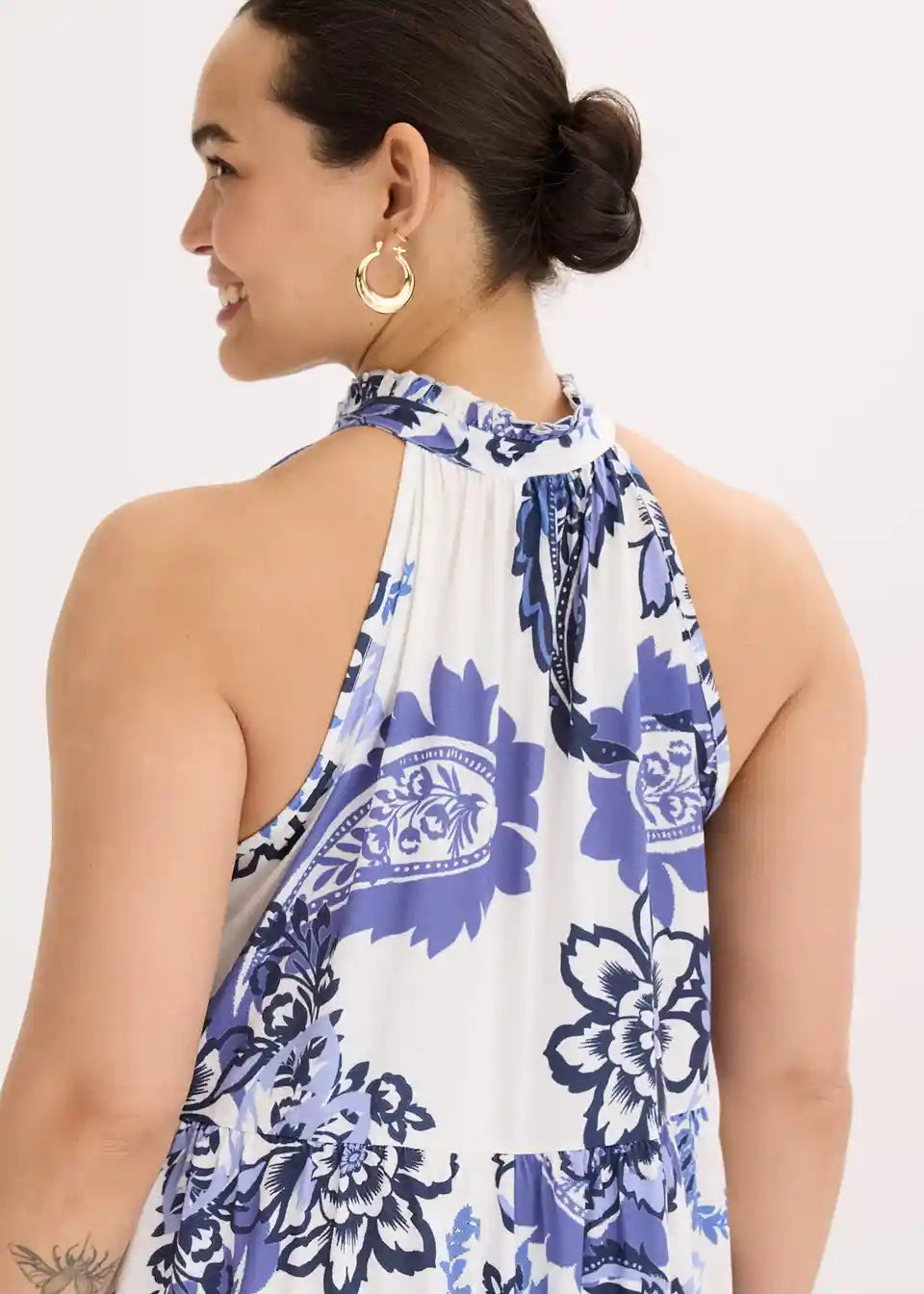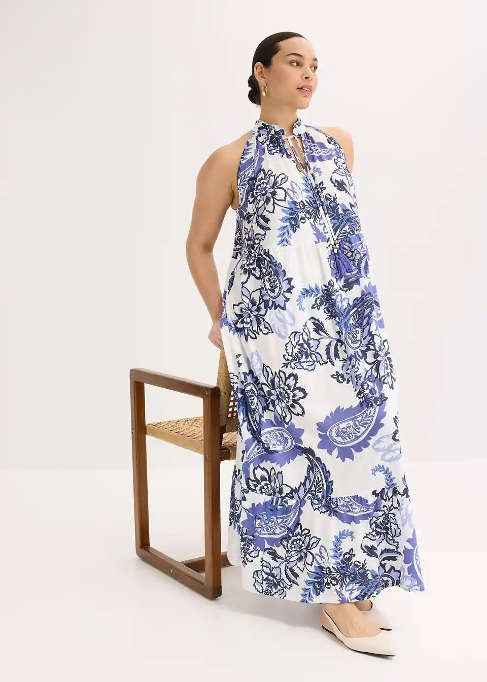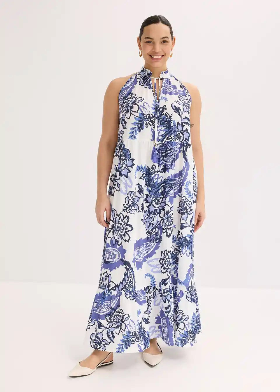 tiskana obleka iz jerseya v maksi dolžini z majhnim volančkom na ovratniku in zavezovanjem spredaj pri izrezu