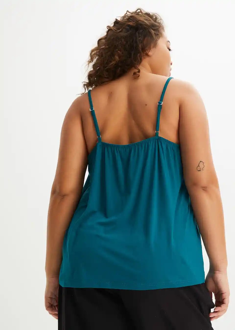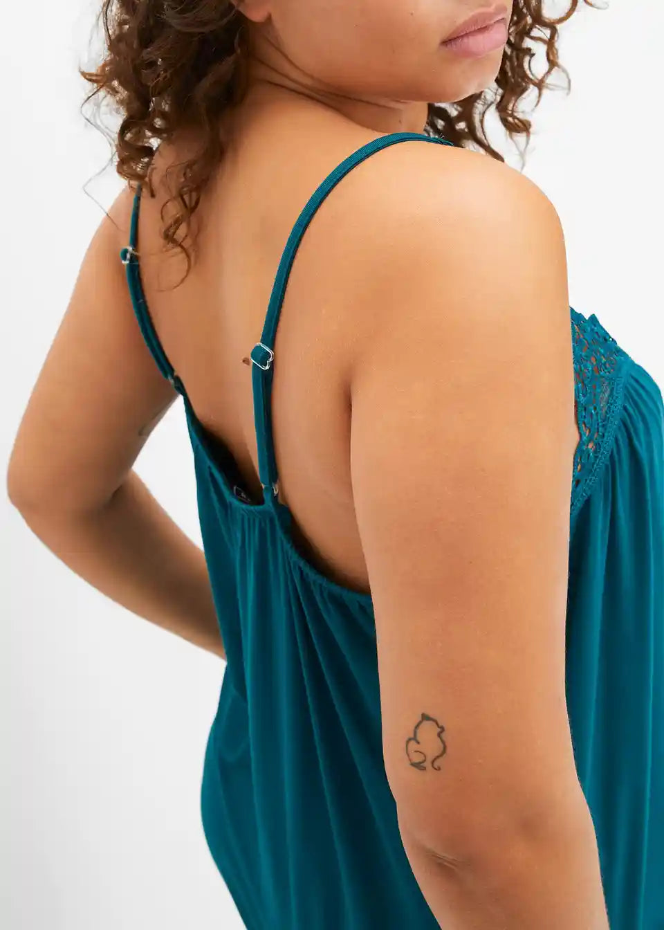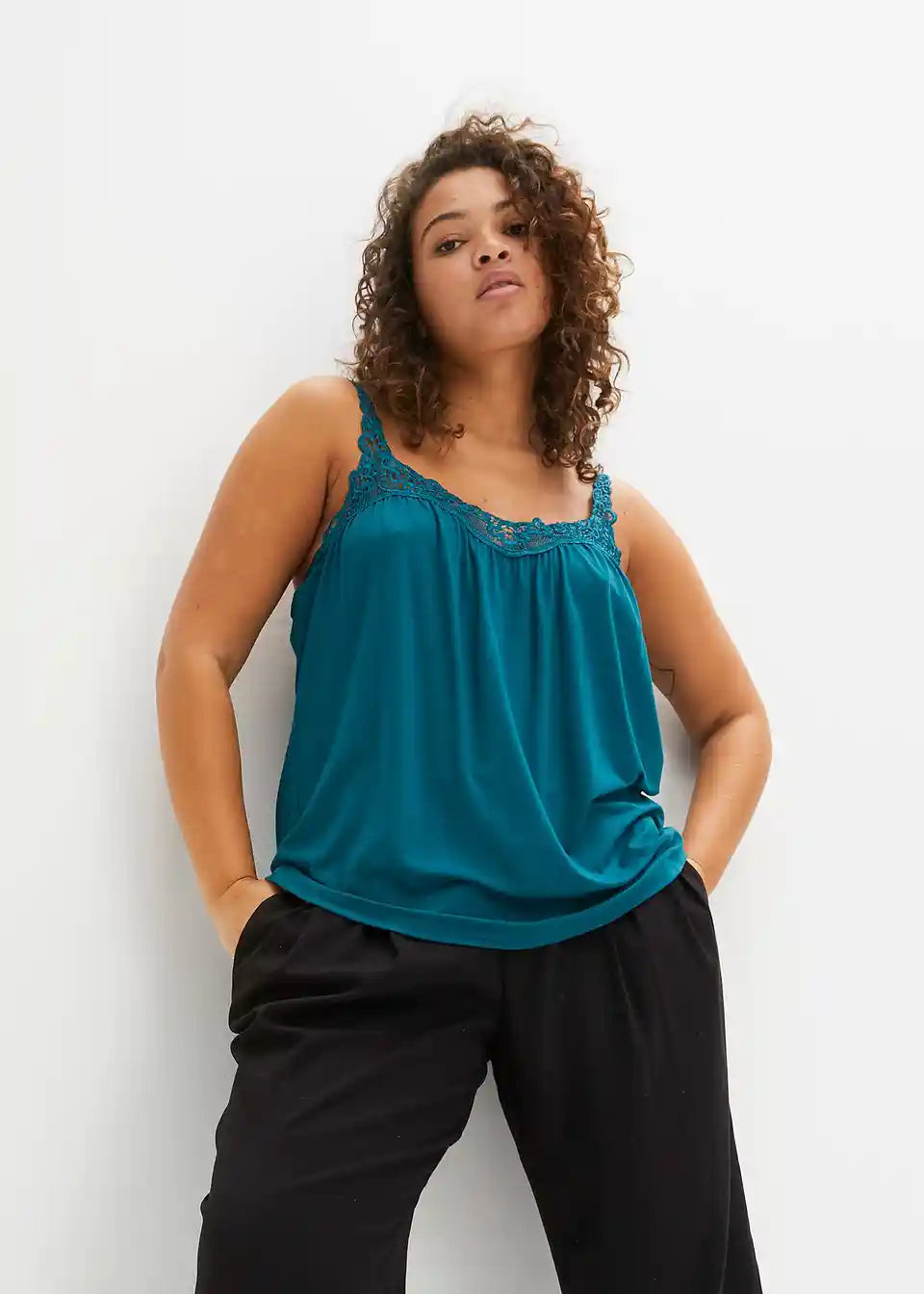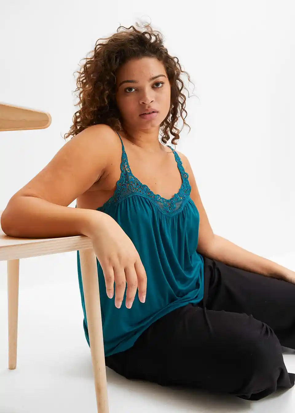 Stilski čipkasti detajl krasi ta top na srčastem izrezu ter vzdolž sprednjega dela naramnic. Lahka oblika laskavo poudari postavo. Zvečer se top v dvojniku odlično ujema z usnjenimi legicami ali mini krilom. V hladnejših dneh čipkast rob kuka izpod prijetnega puloverja z V-izrezom. Kombinacija z boyfriend kavbojkami in usnjeno jakno pa prinese moden kontrast.