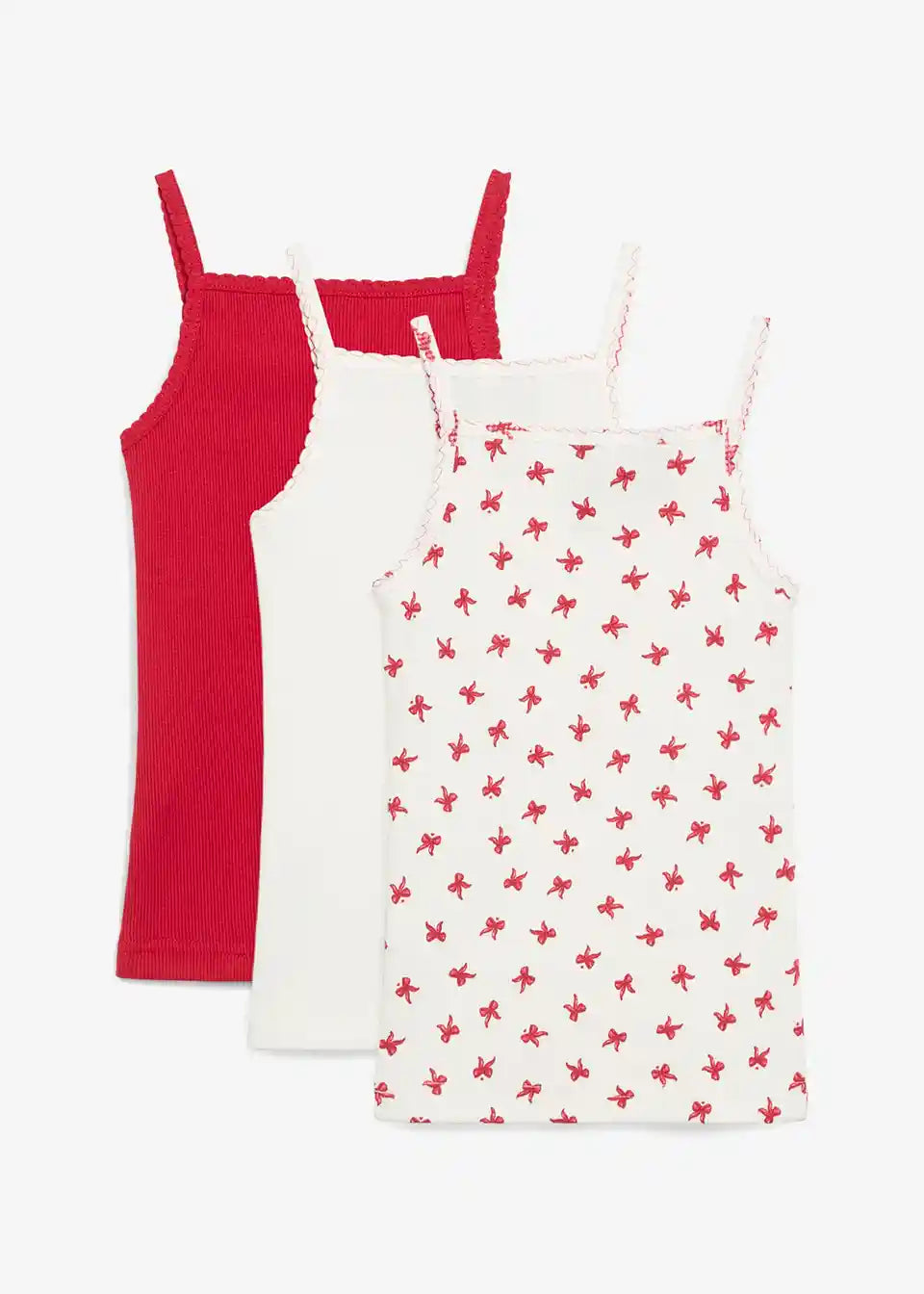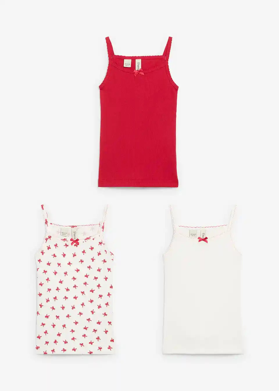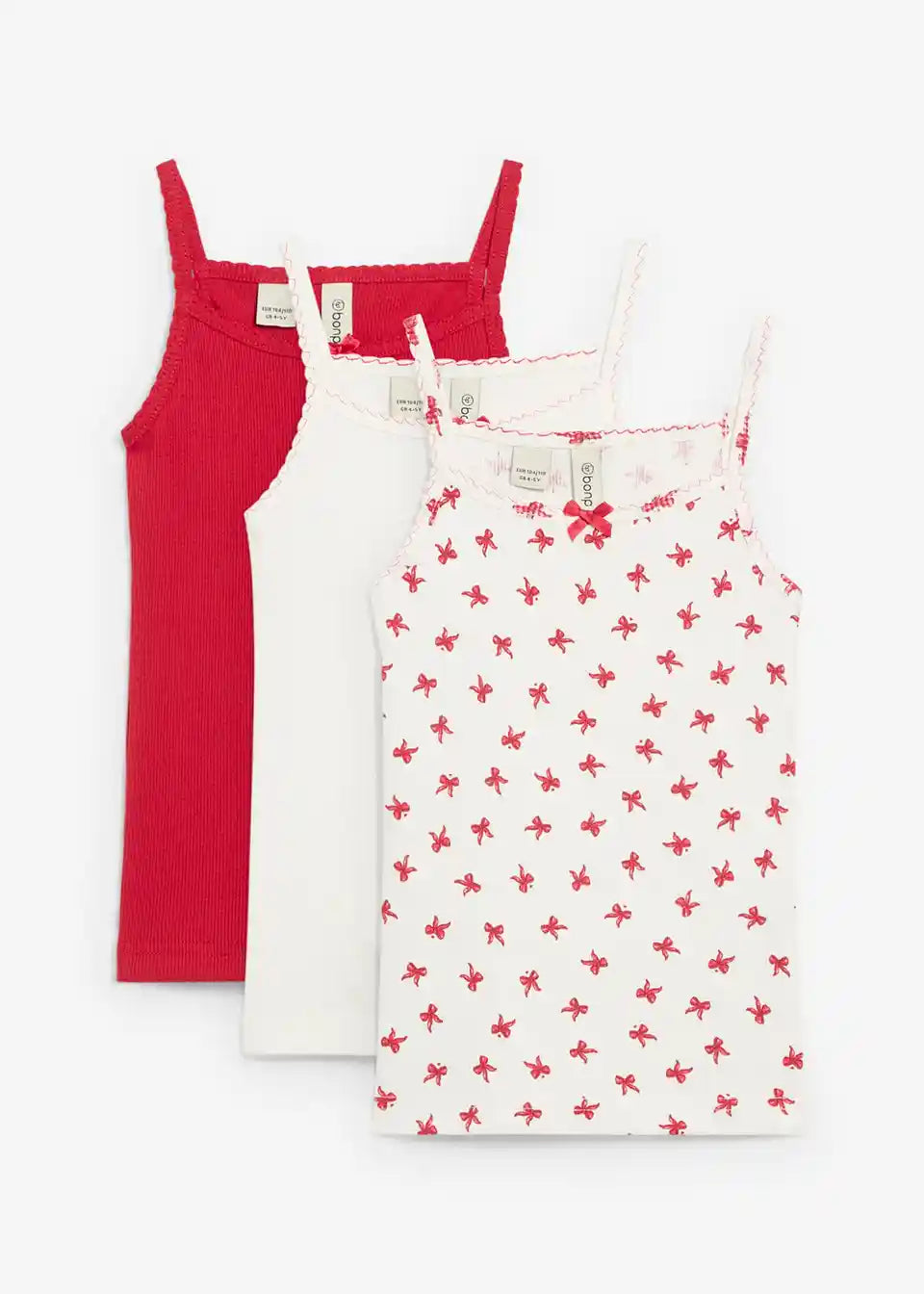 Igriva spodnja majica iz mehkega rebrastega materiala s tankimi naramnicami in majhno pentljo spredaj v praktičnem 3-delnem setu.