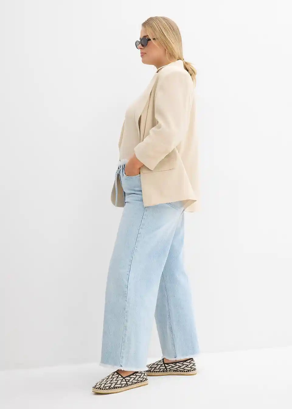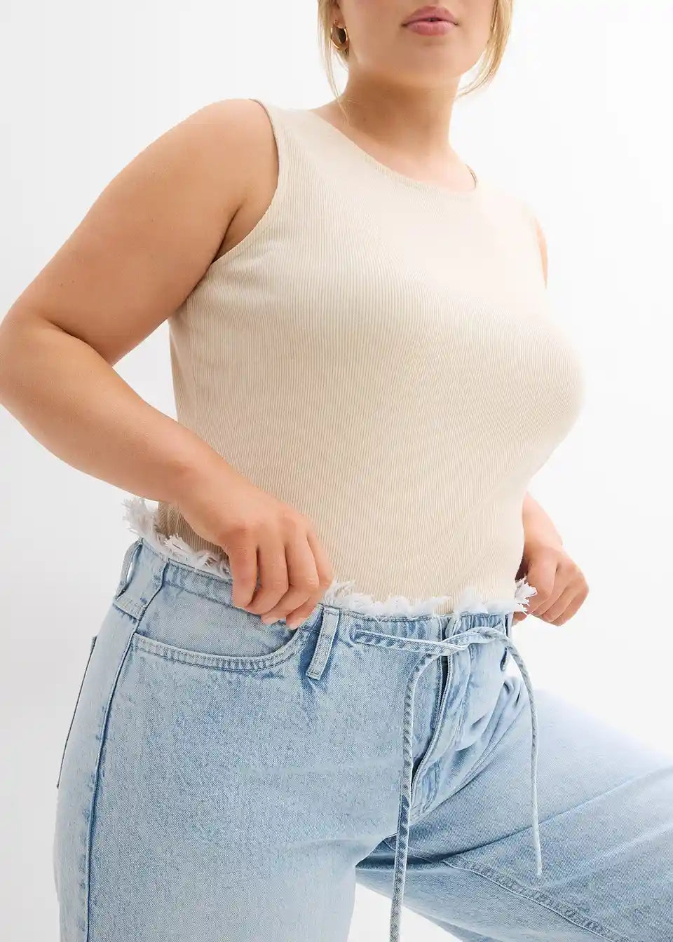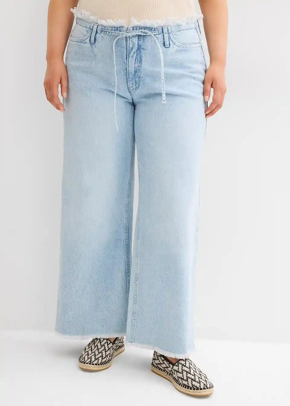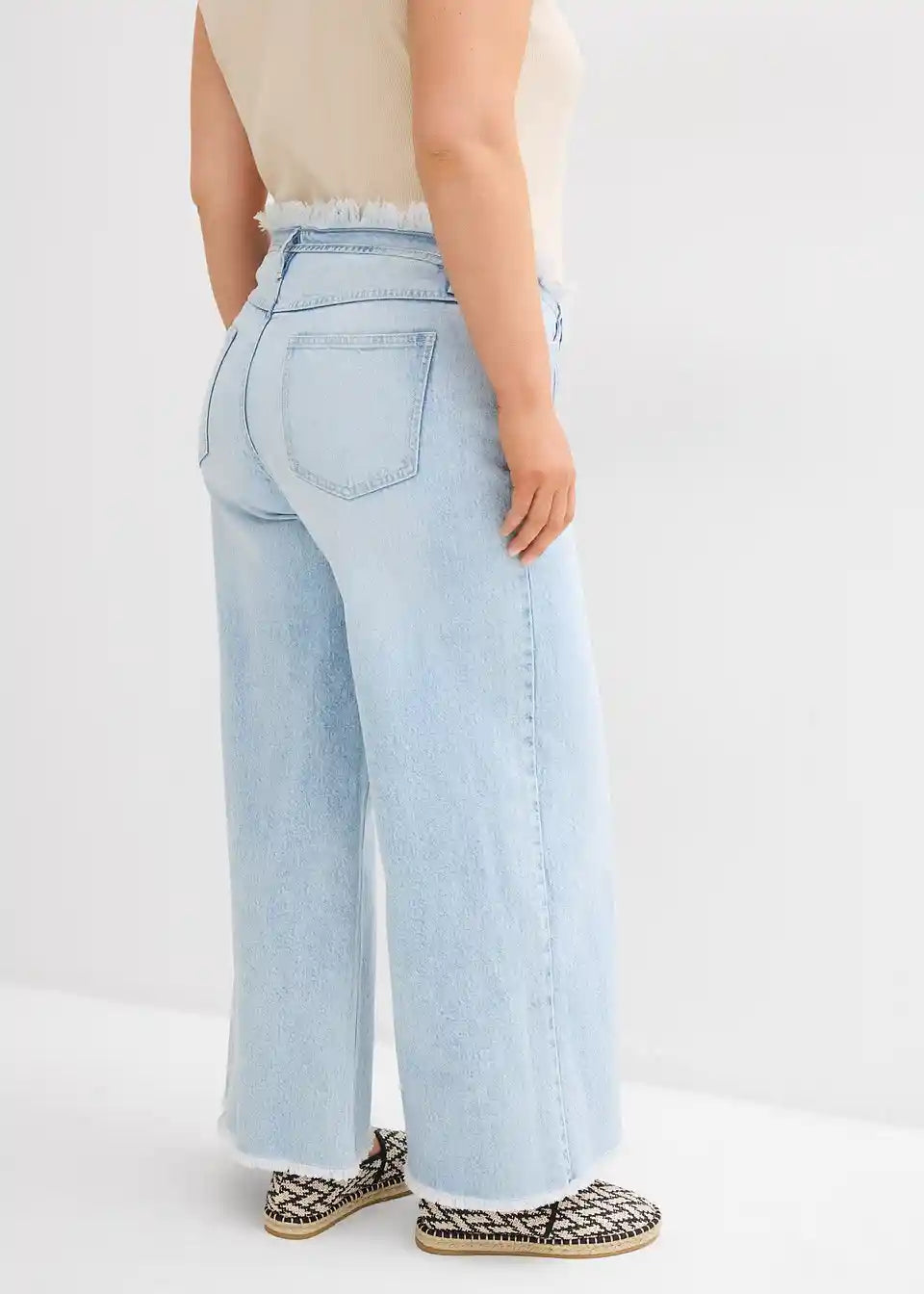 Kavbojke s širokimi hlačnicami in srednje visokim pasom iz rahlo raztegljivega materiala z resami na robu