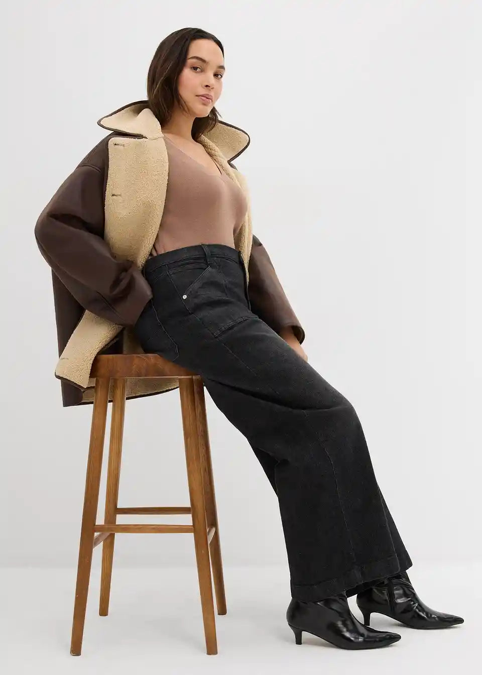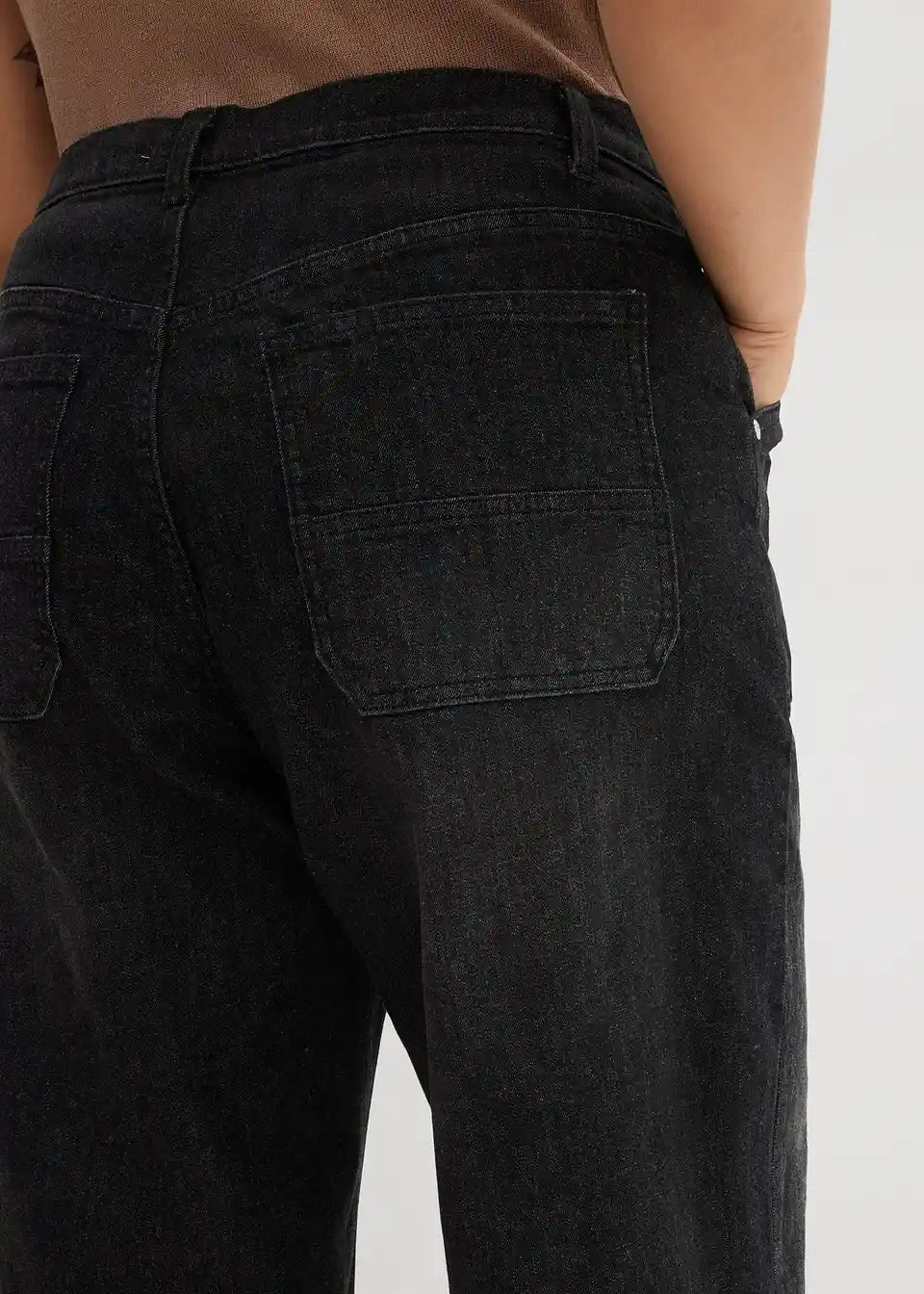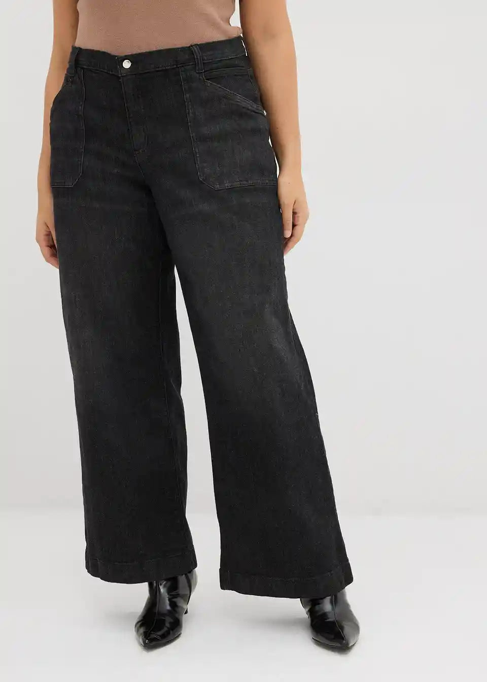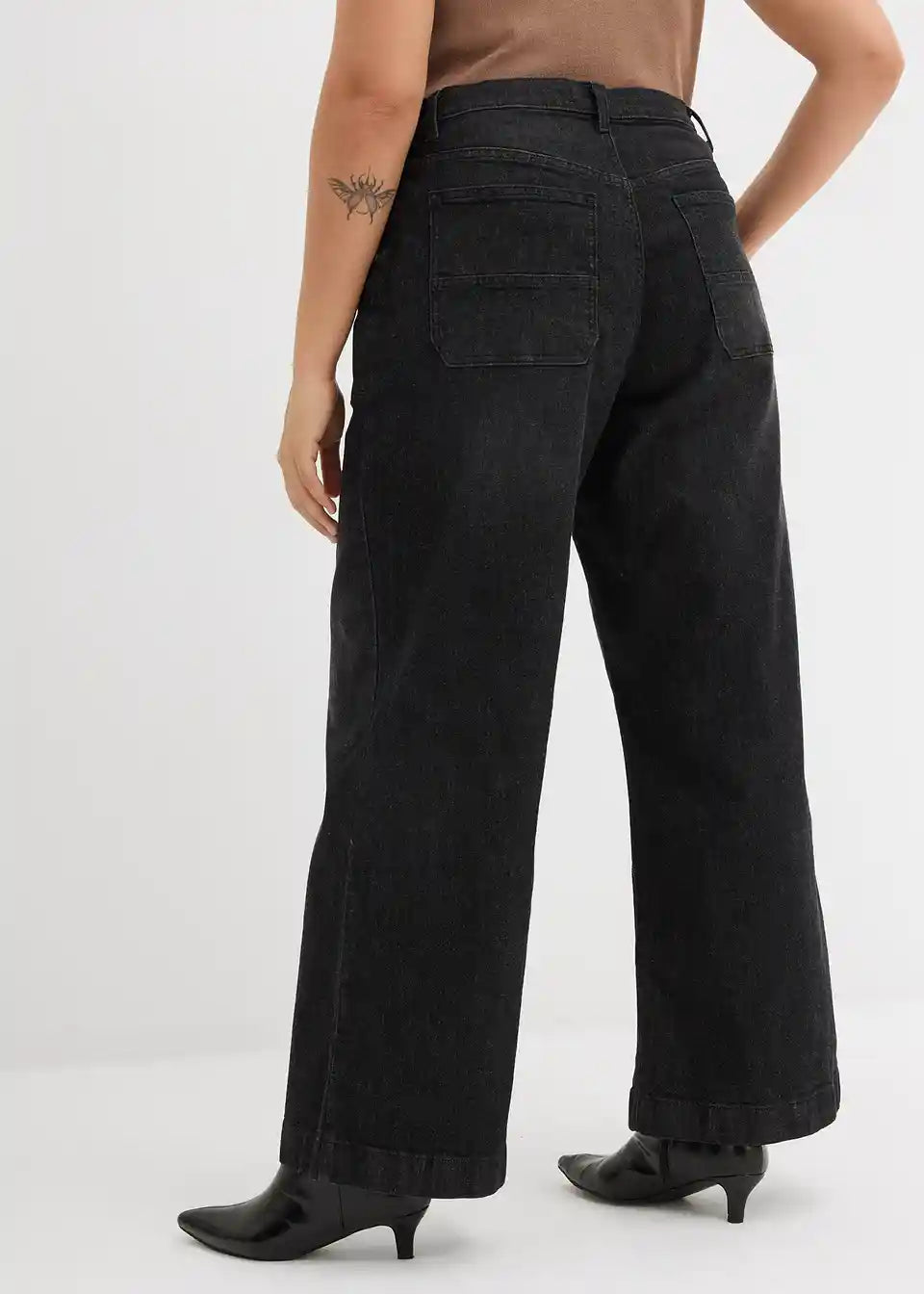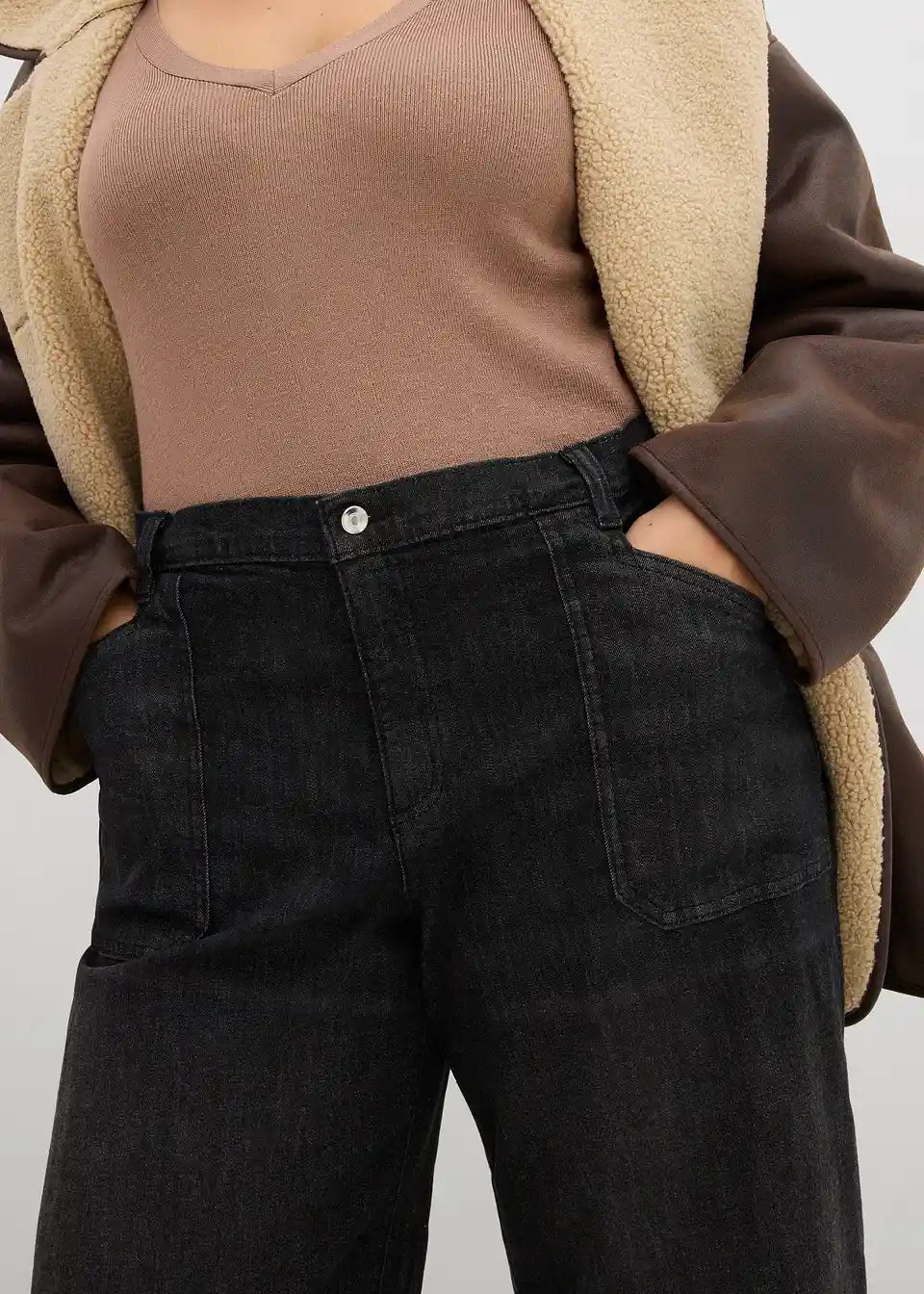 Kavbojke s širokimi hlačnicami, srednje visokim pasom in našitimi žepi
