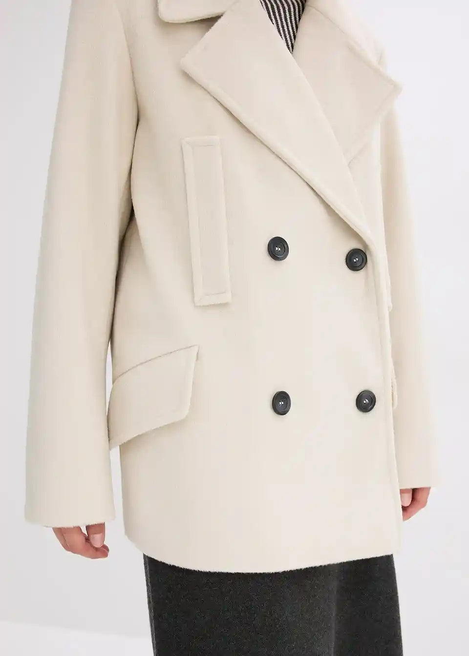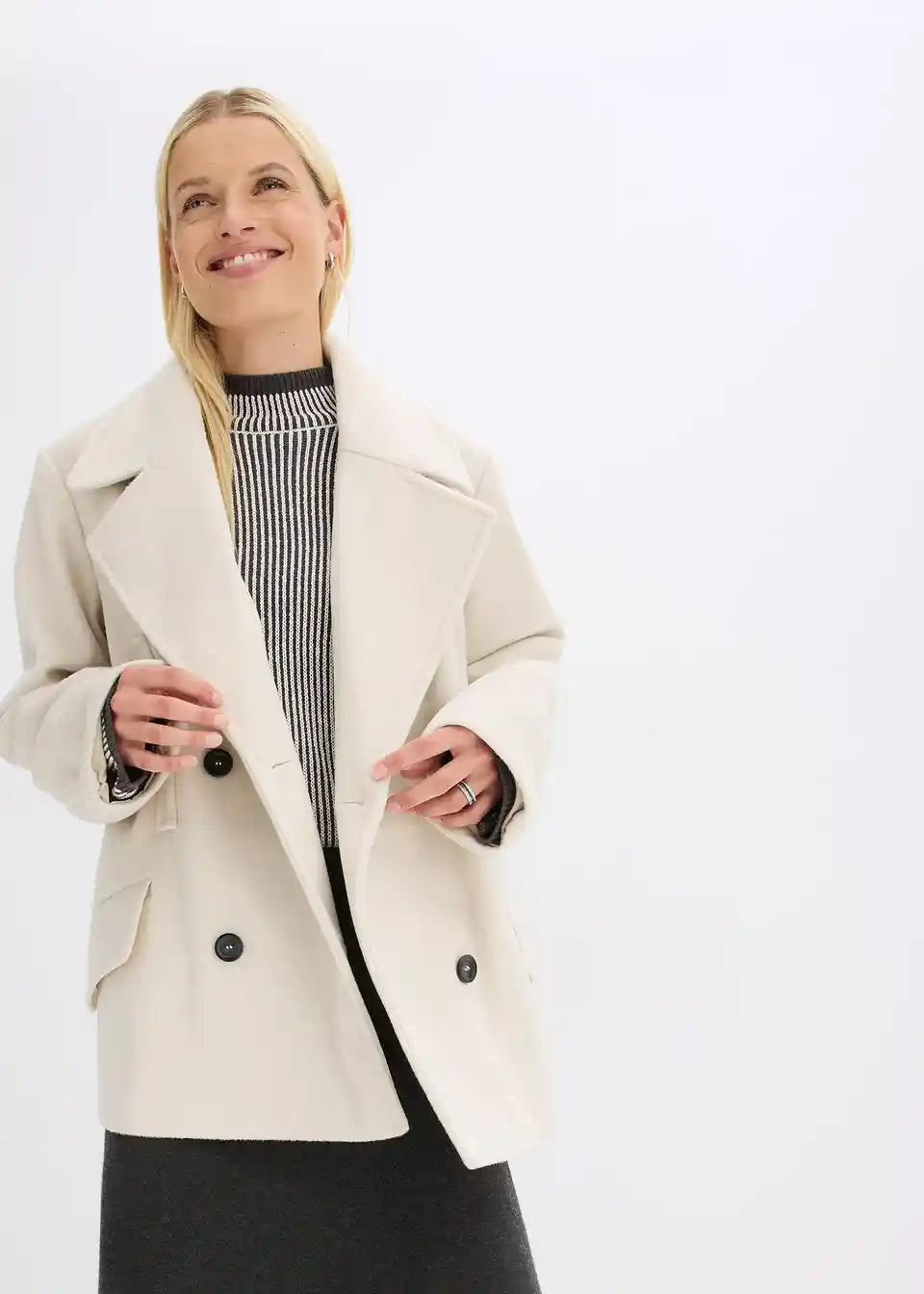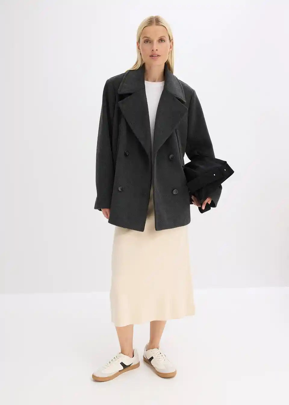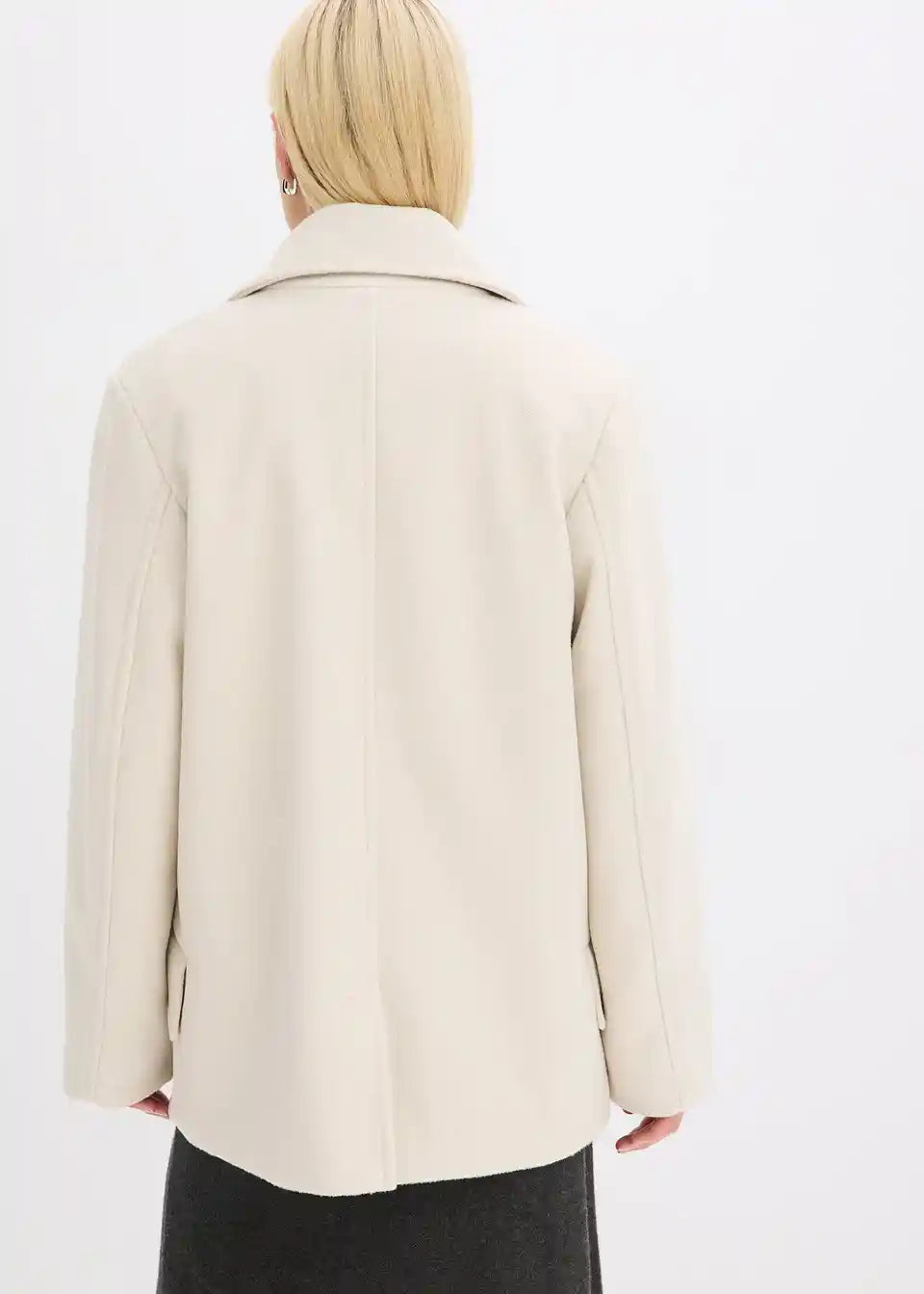 Kratka jakna z dvorednim zapenjanjem z žepi s poklopci in razporkom zadaj