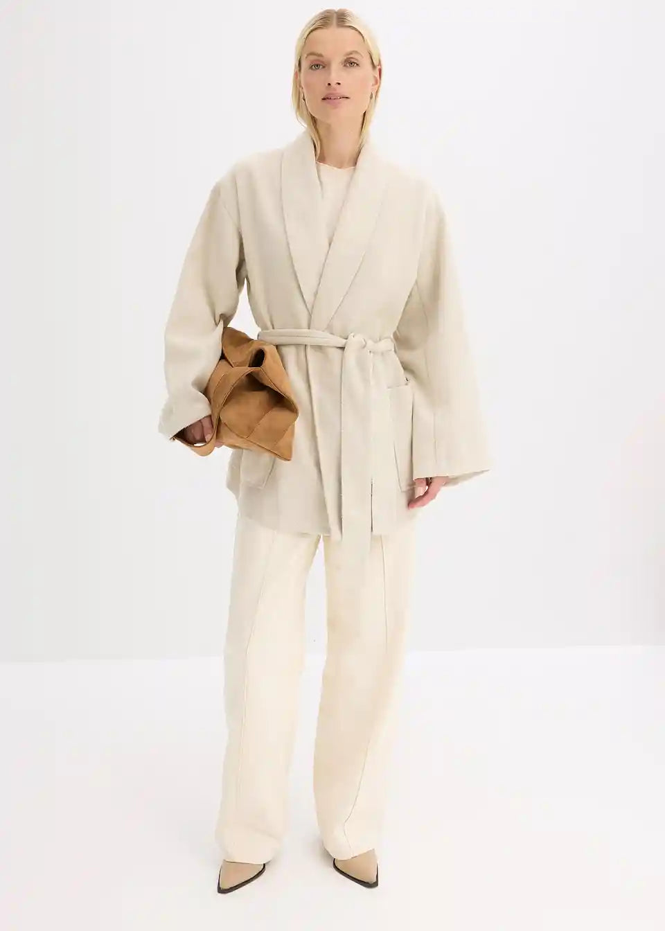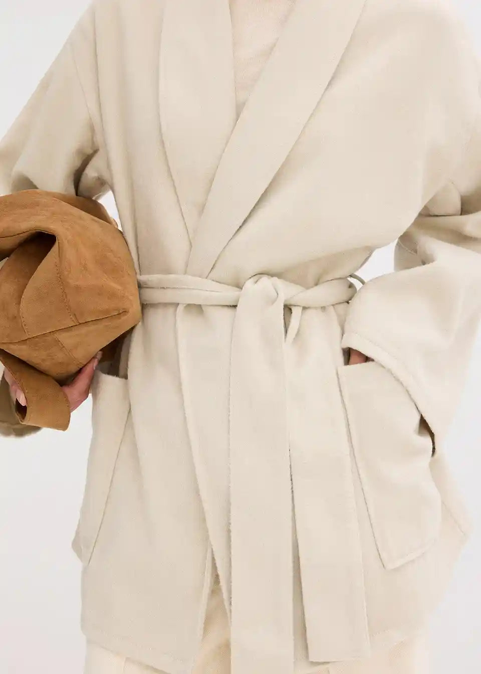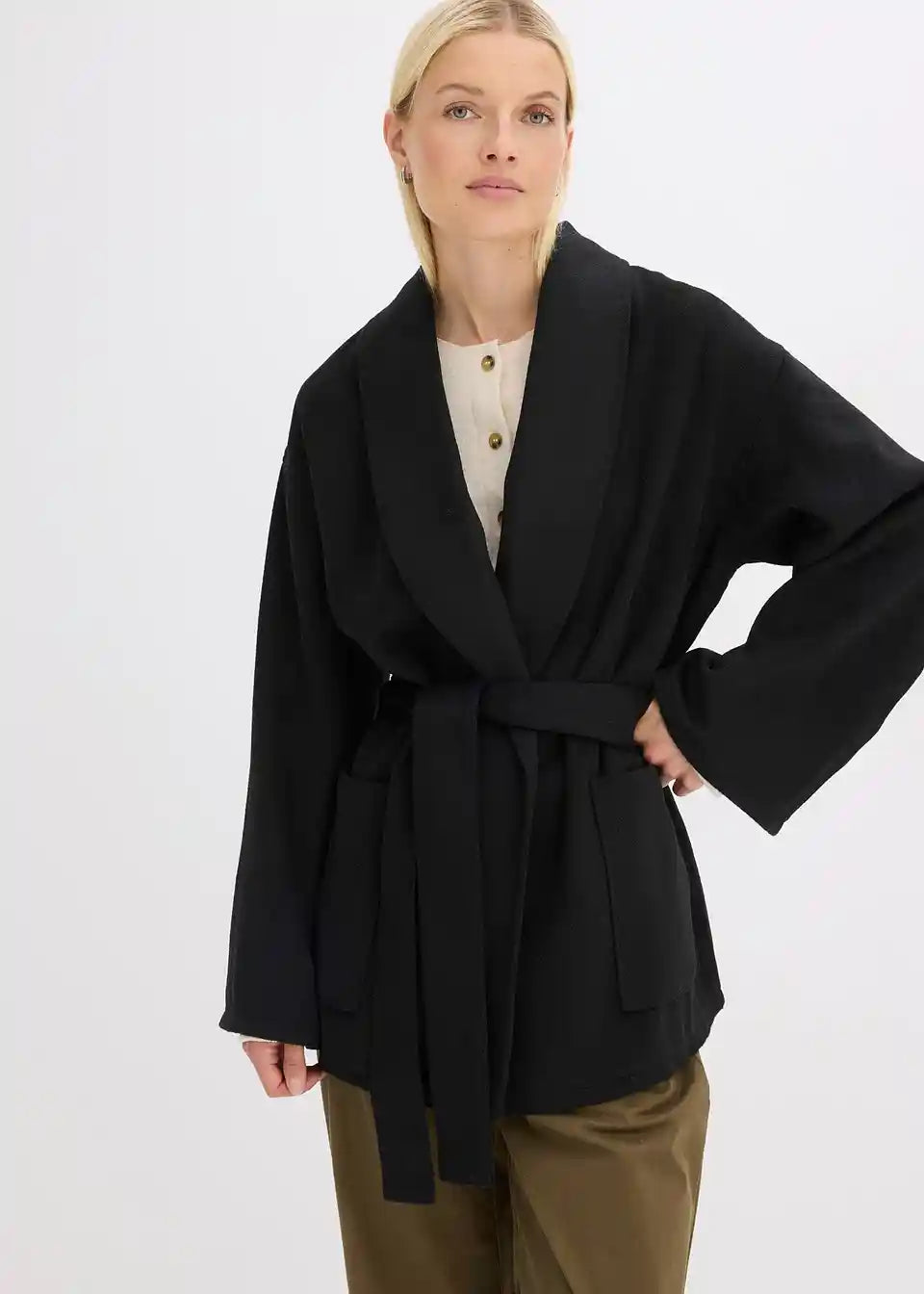 Udobna volnena jakna s trakom za zavezovanje in našitimi žepi