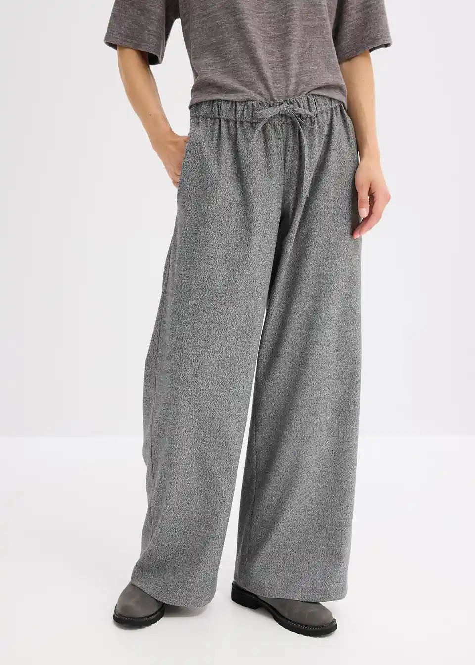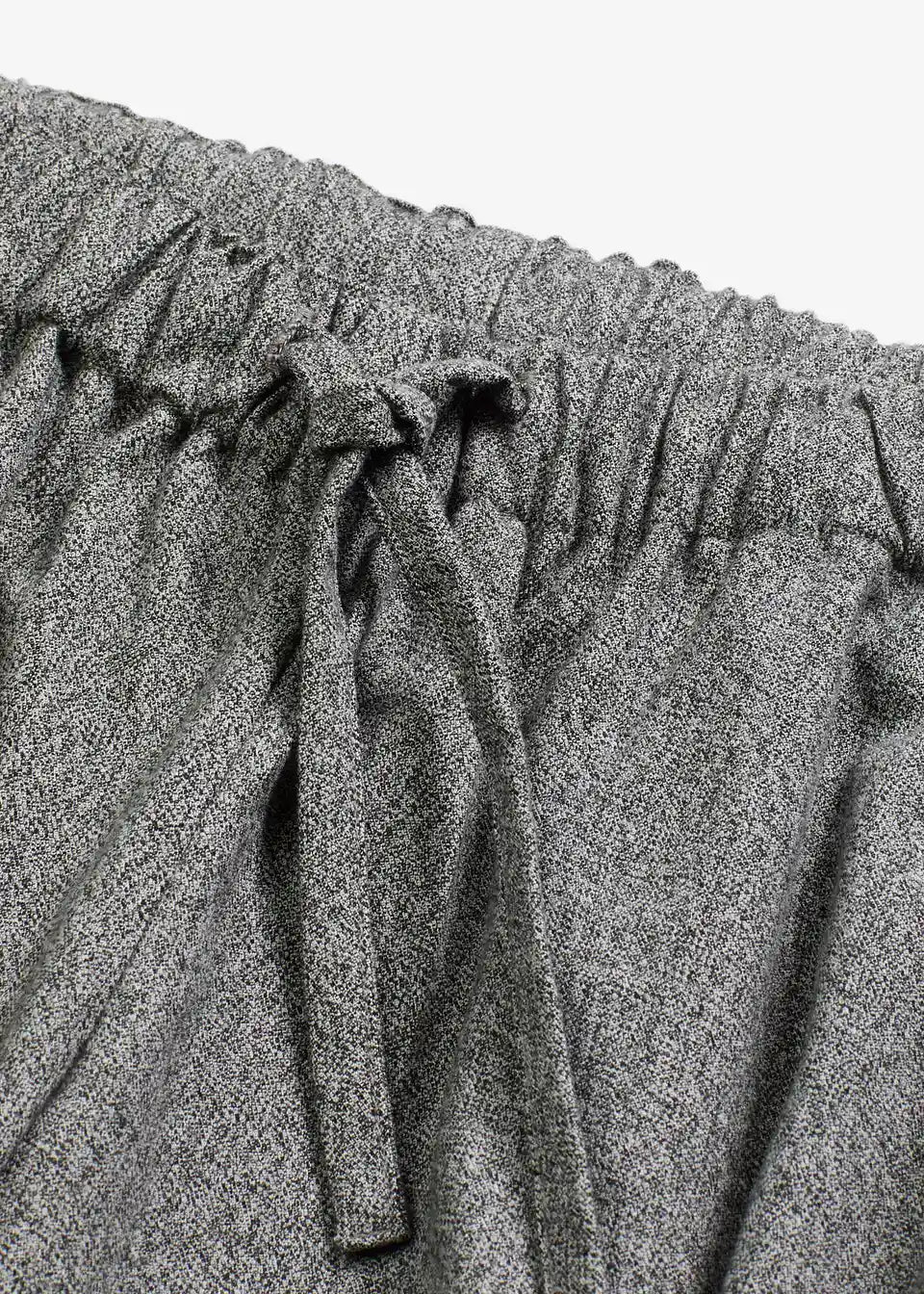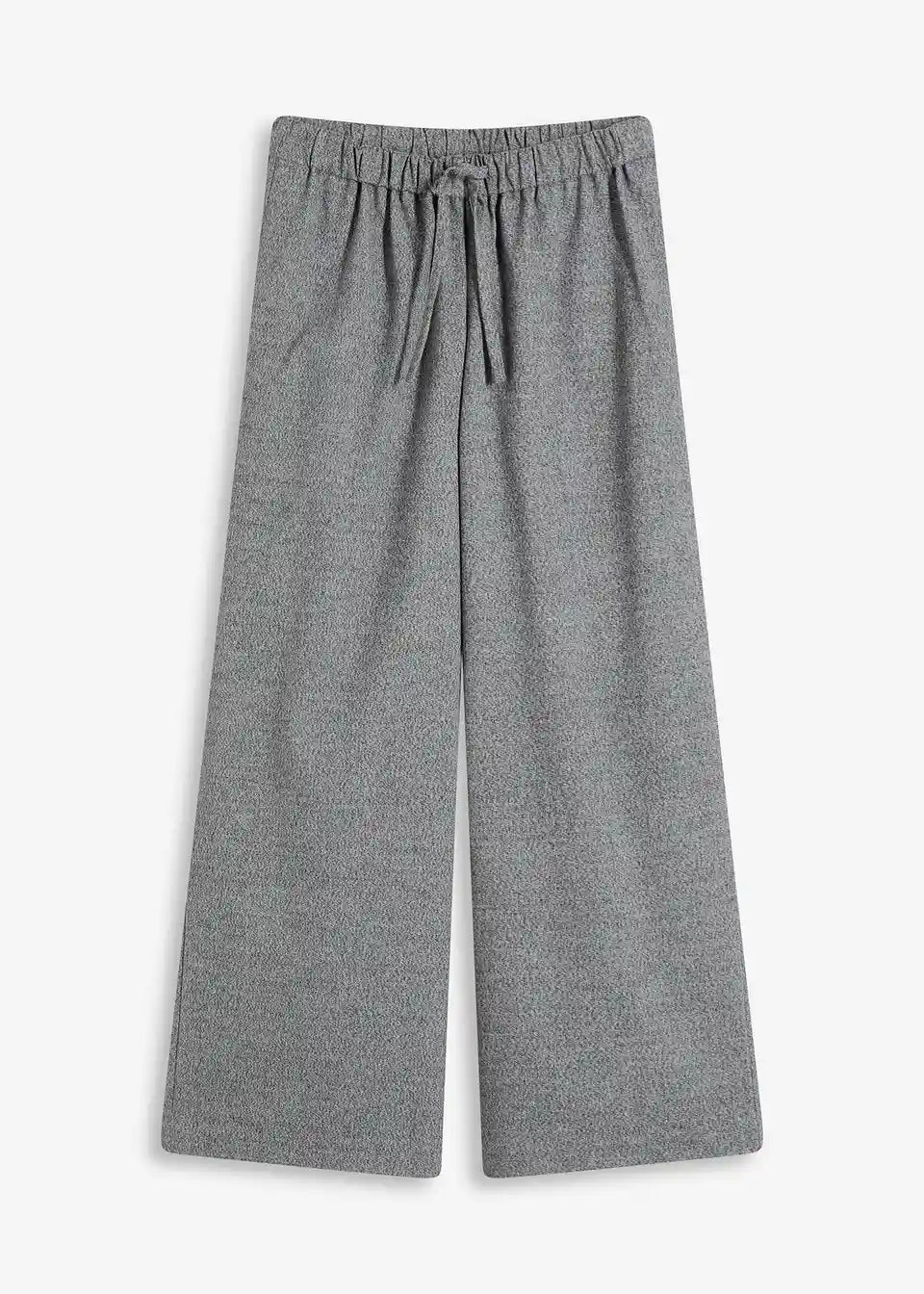 Široko krojene hlače v sol in poper videzu z vrvico v pasu in stranskimi všitimi žepi.