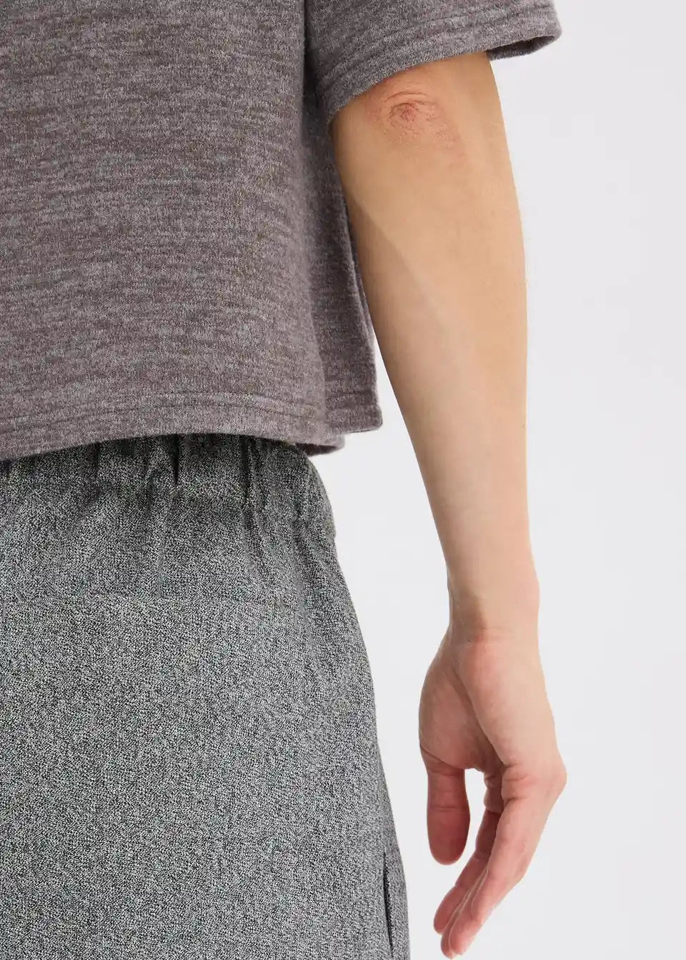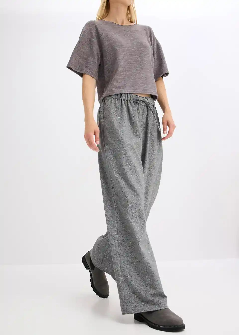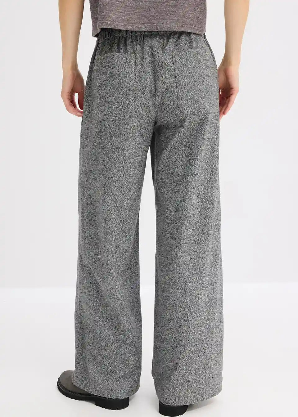 Široko krojene hlače v sol in poper videzu z vrvico v pasu in stranskimi všitimi žepi.