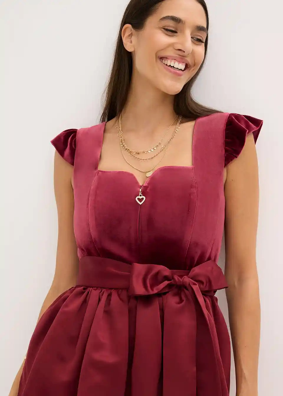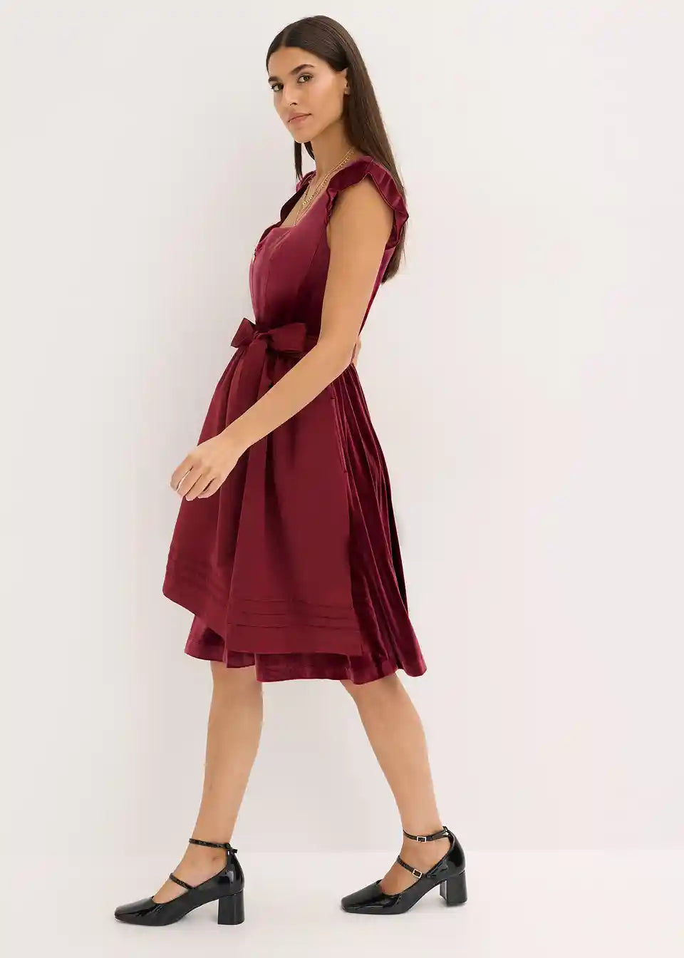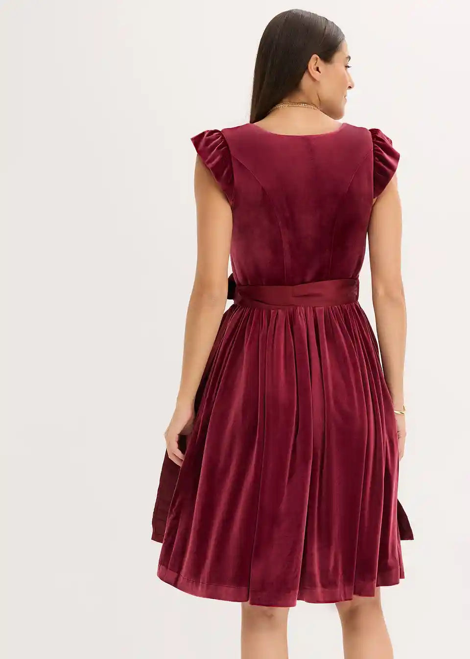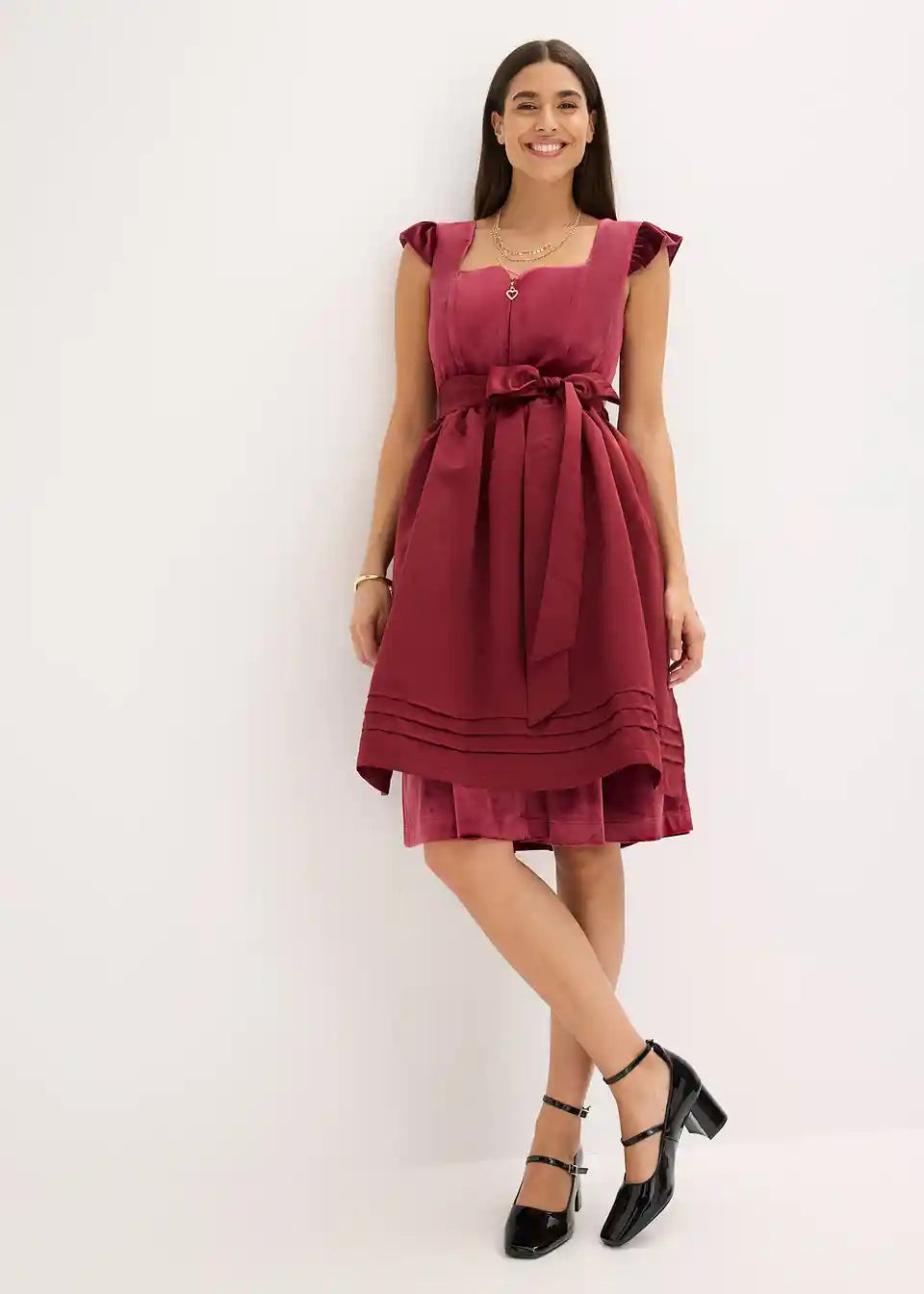 Moderno in ženstveno: dirndl iz žameta z v srce oblikovanim izrezom in naborki na rokavih ter predpasnikom iz sijočega satena