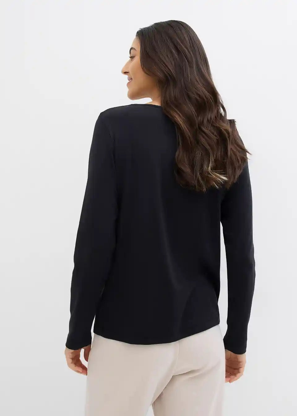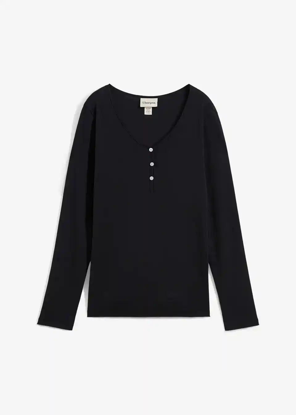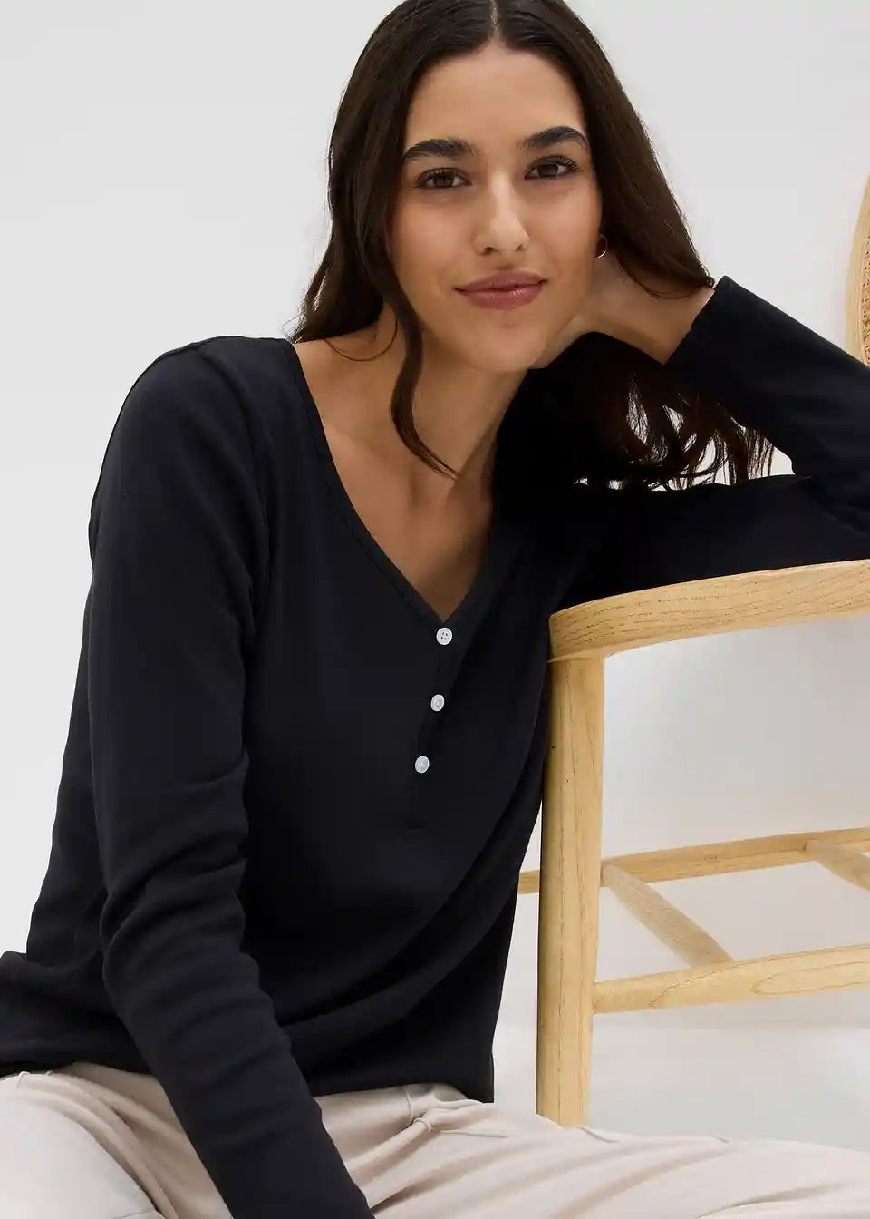 Udobna majica z dolgimi rokavi in gumbki pri V-izrezu iz organskega bombaža. Dolžina pri št. 40/42 pribl. 66 cm, pralna v stroju.