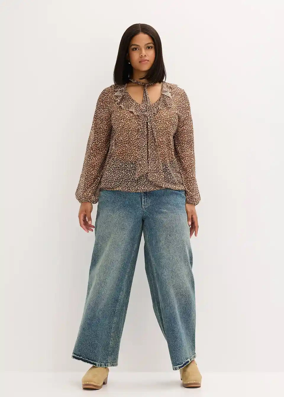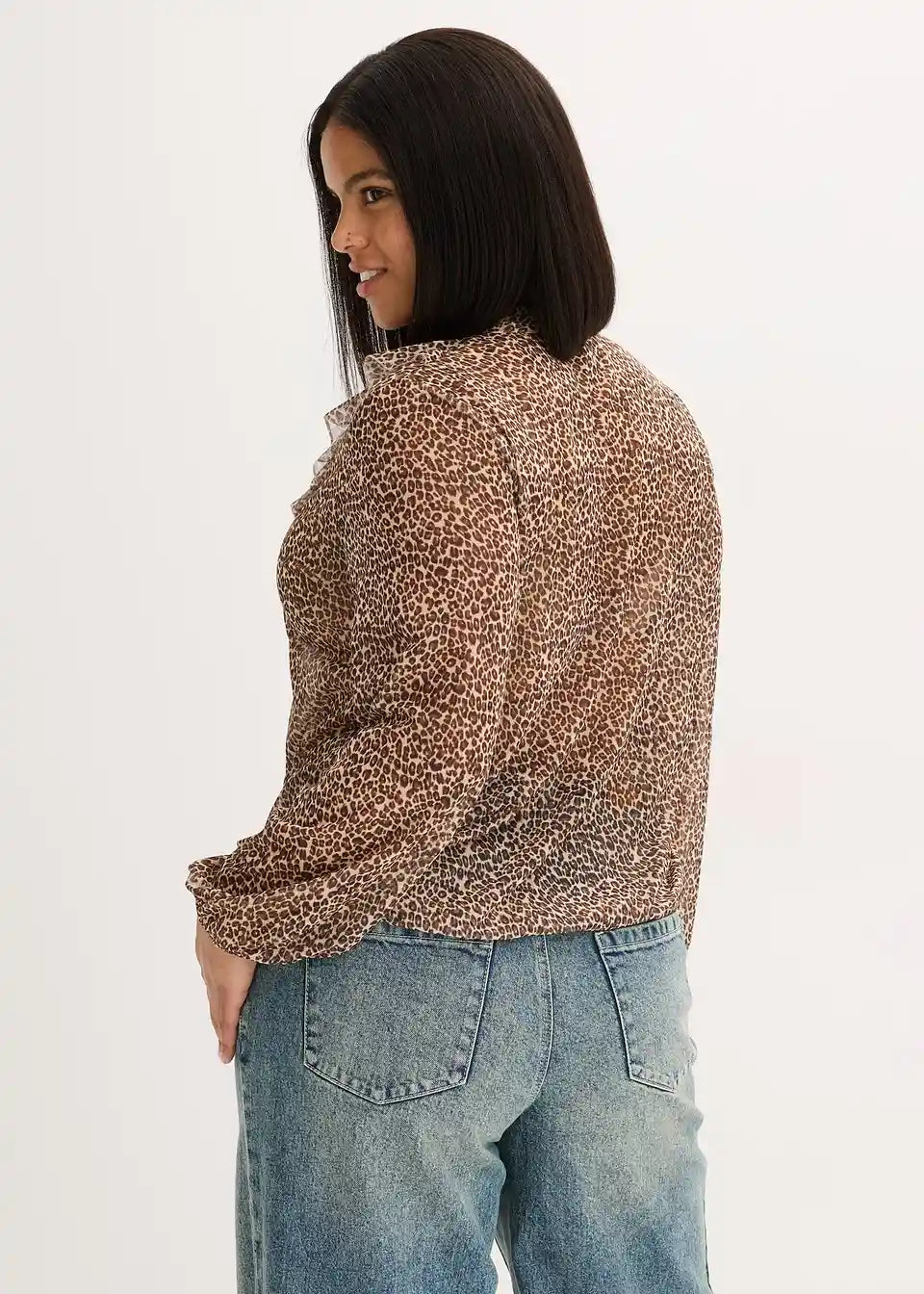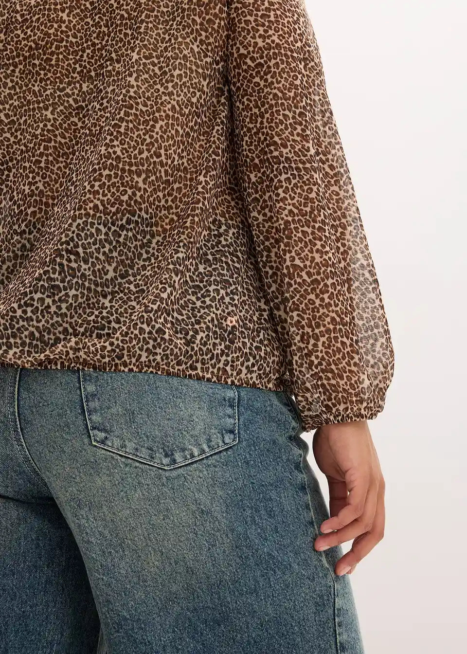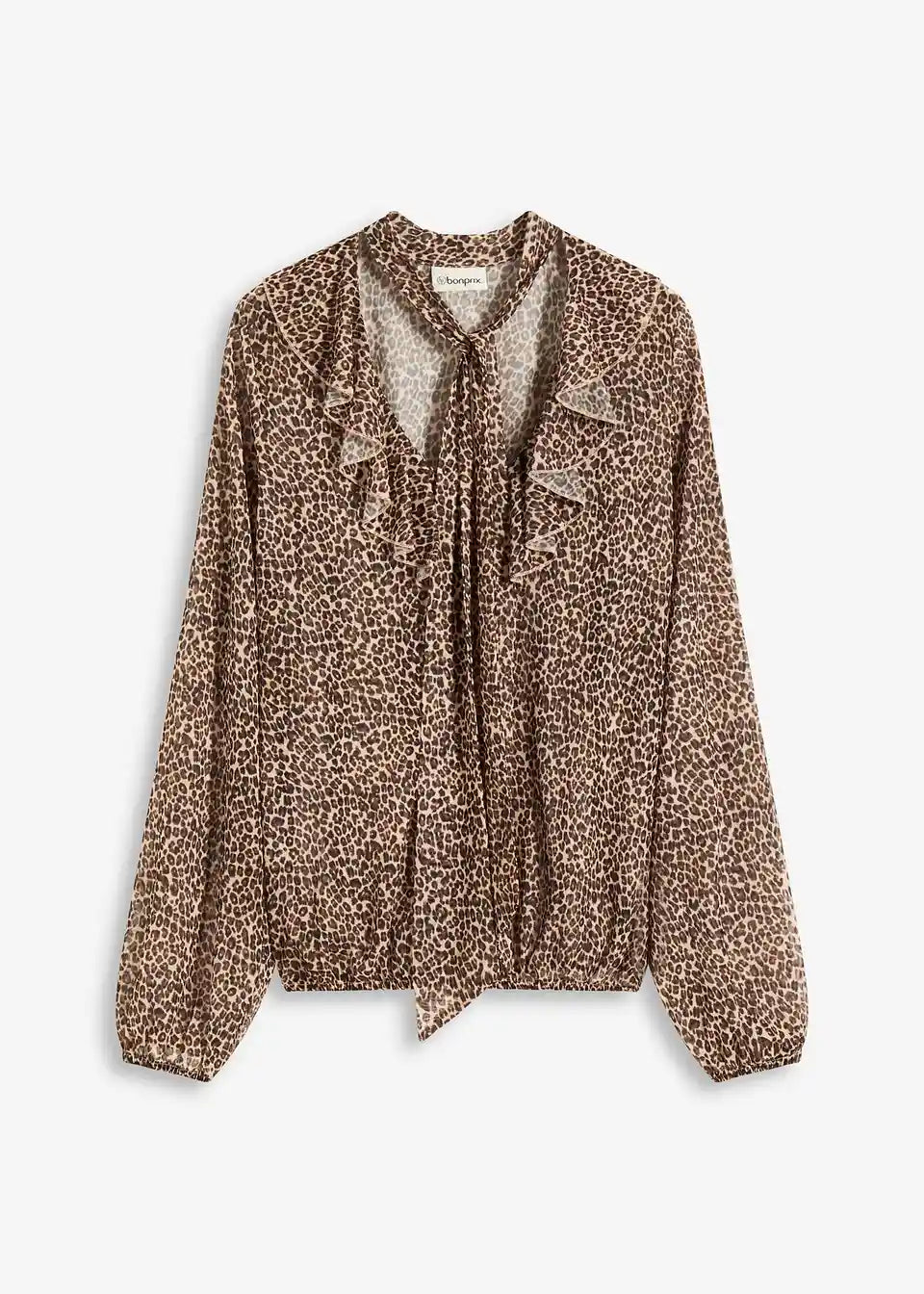 Lahka prosojna bluza z volanom in zavezovanjem s trakom v trendovskem živalskem vzorcu