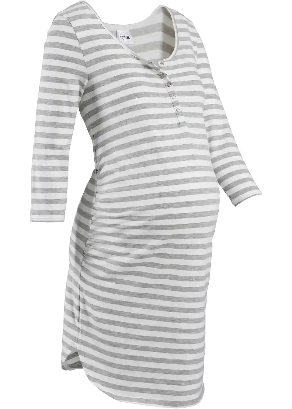 Ta nočna srajca znamke bpc je odlična za nosečnost in čas dojenja. Med nosečnostjo zagotavlja kroj, ki lepo pade po telesu, in stranske naborke, ki ponujajo veliko prostora za rastoči nosečniški trebušček. Po porodu dolga vrstica gumbov na izrezu omogoča udobno dojenje. Nočna srajca za dojenje z dolgimi rokavi se ponaša s črtami in stranskimi razporki na robu. Mehka bombažna kakovost poskrbi za prijeten občutek pri nošenju.