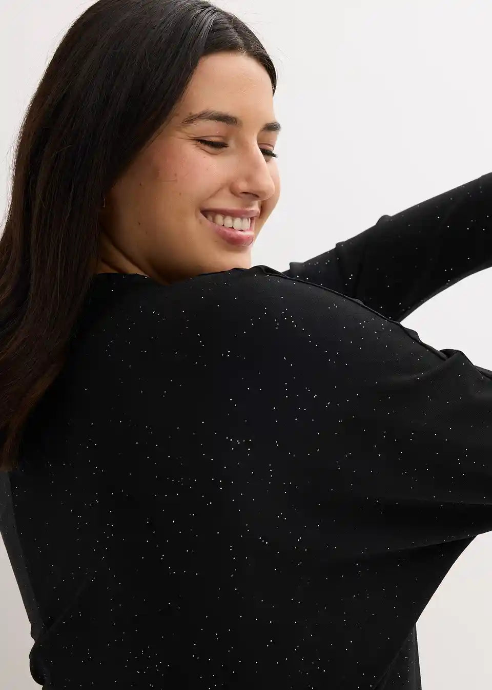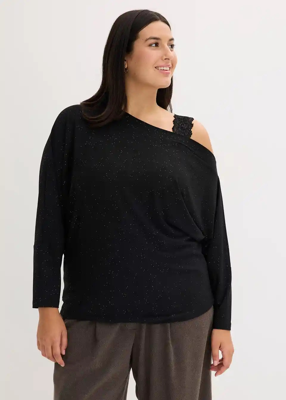 Modna majica z odkrito ramo, bleščicami in detajlom iz čipke