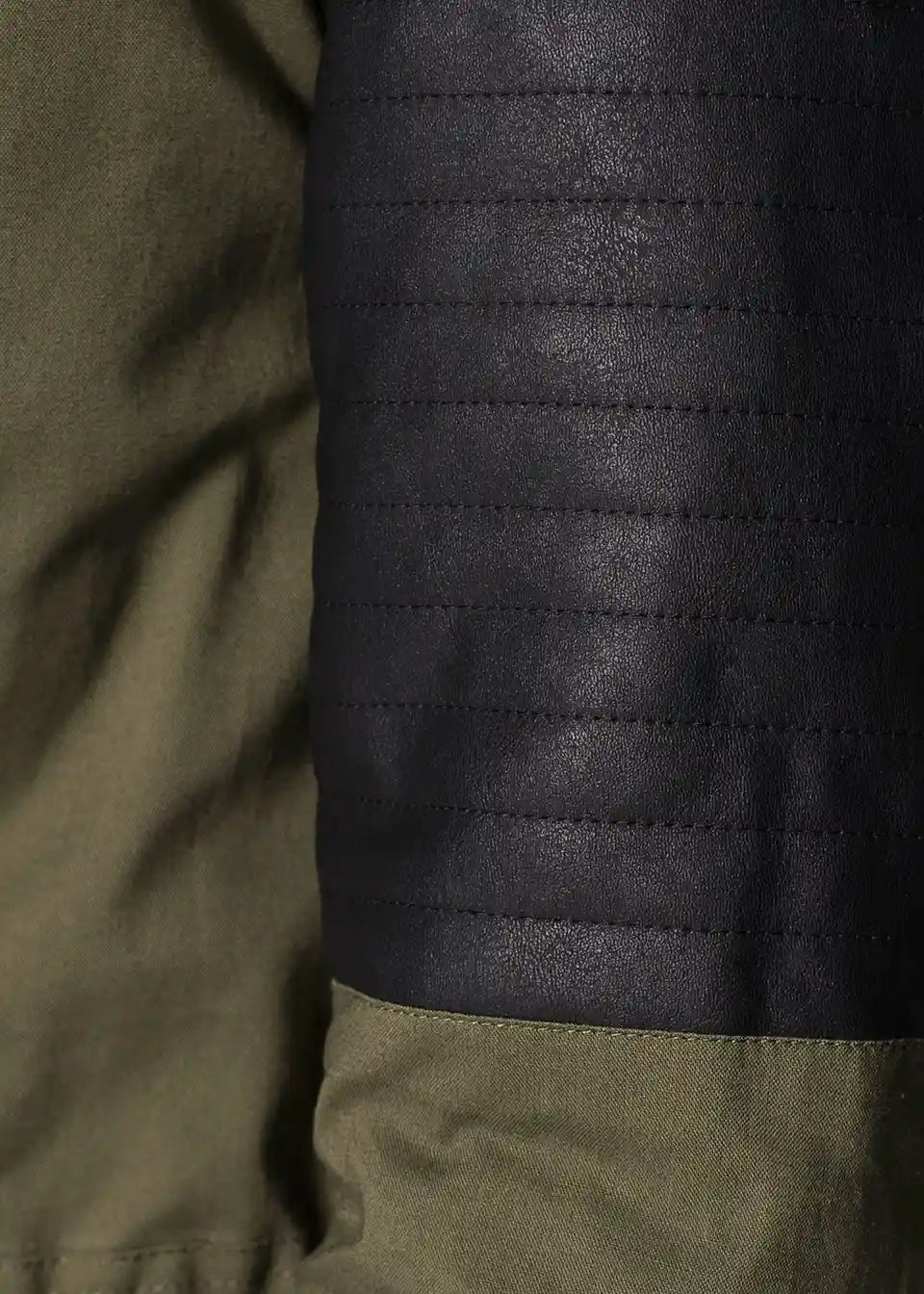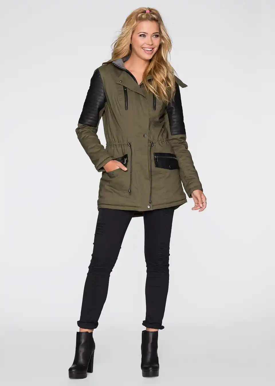Udobna parka s kapuco in detajlom iz umetnega usnja