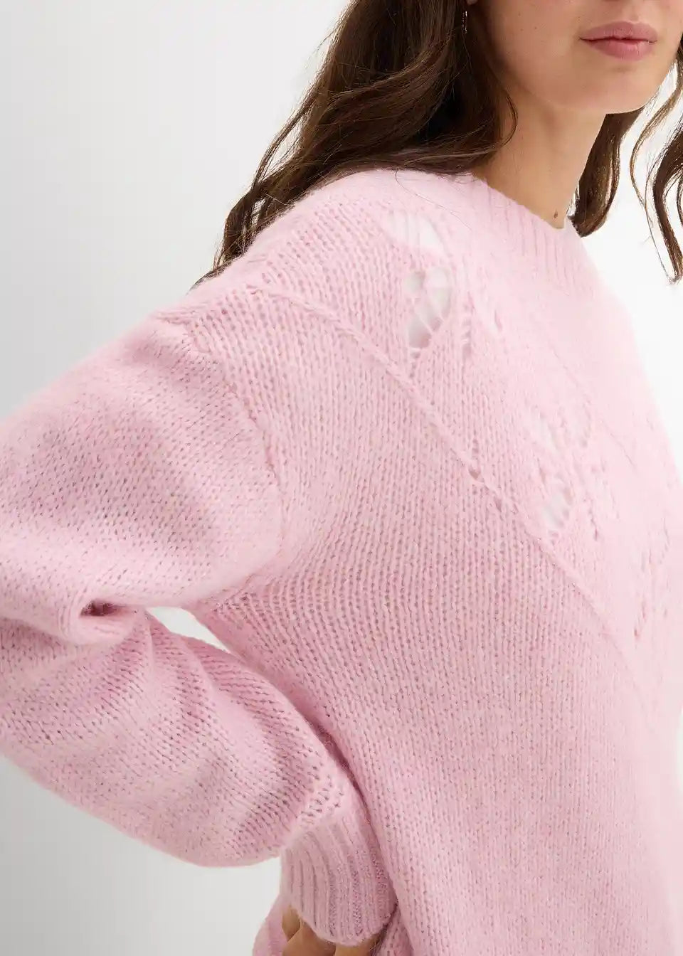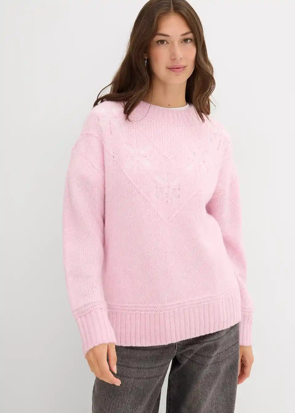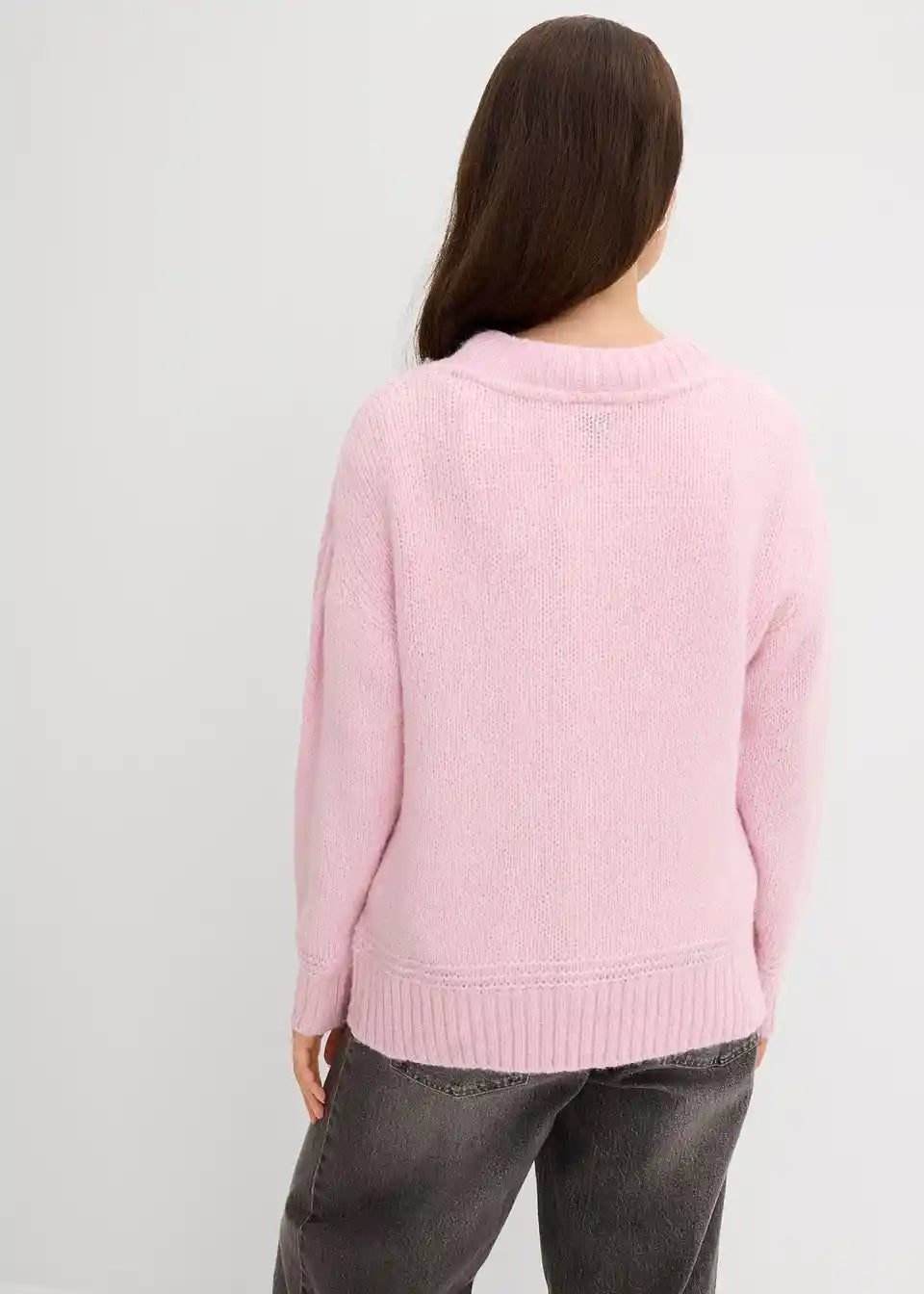 Grobo pleten pulover iz mehke volnene mešanice z igrivimi detajli