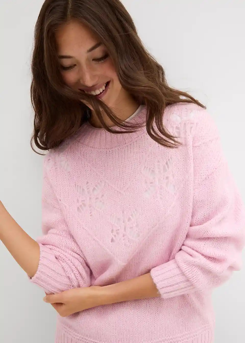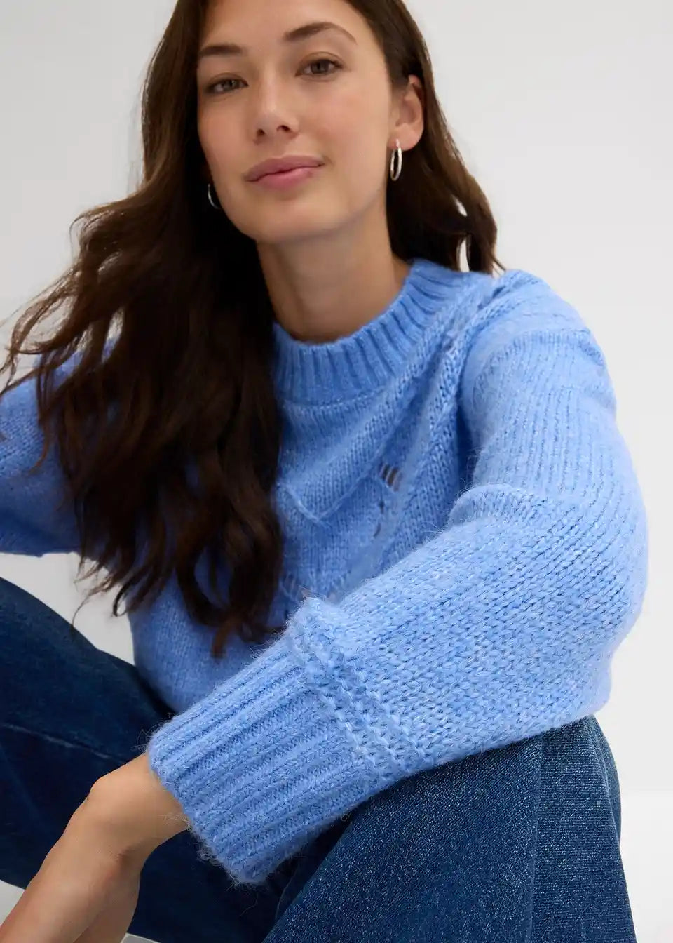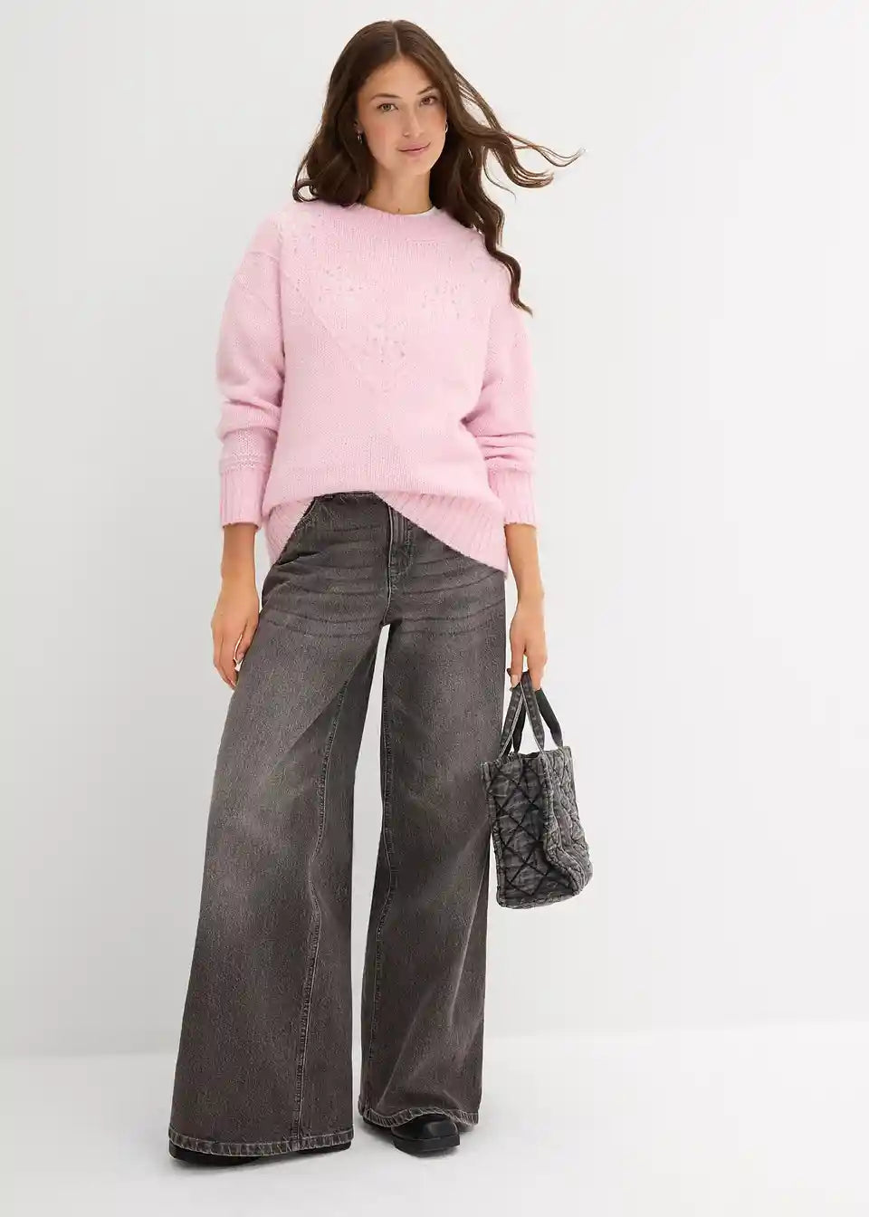 Grobo pleten pulover iz mehke volnene mešanice z igrivimi detajli