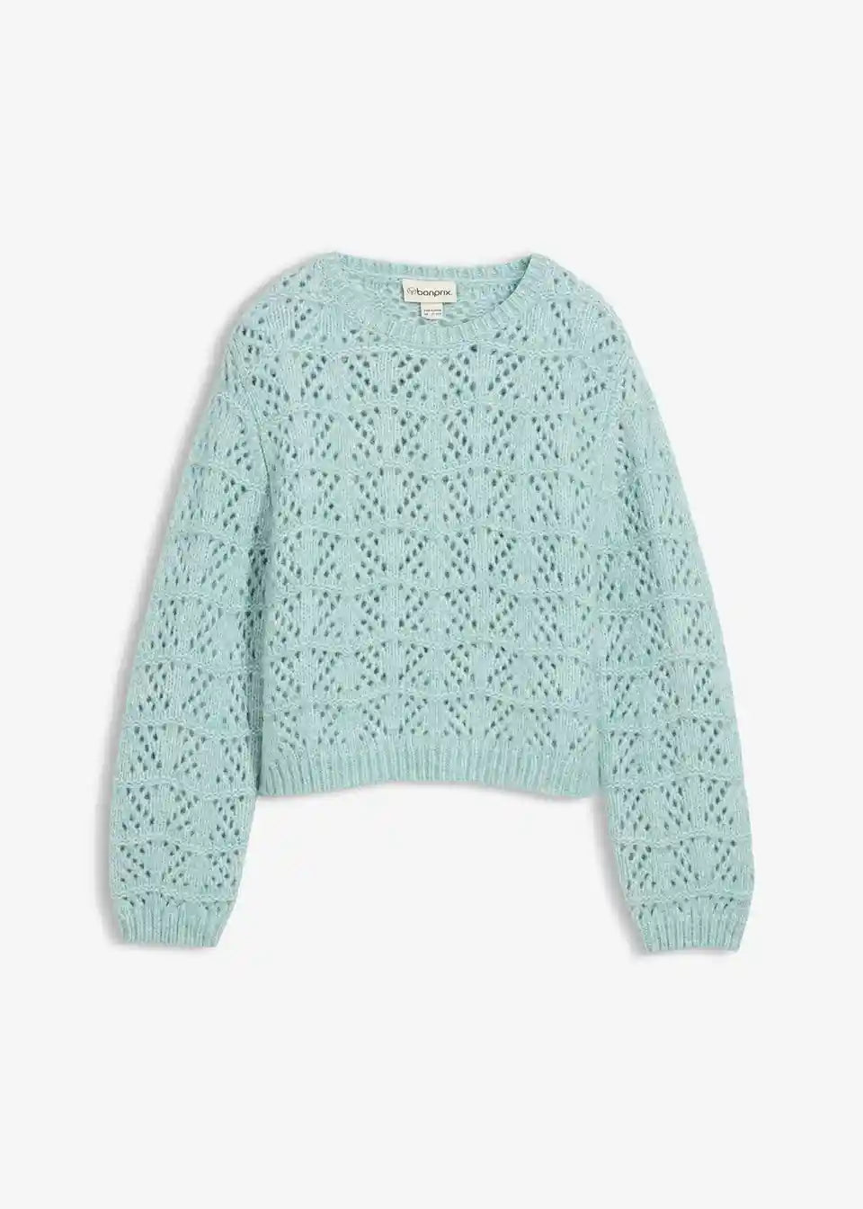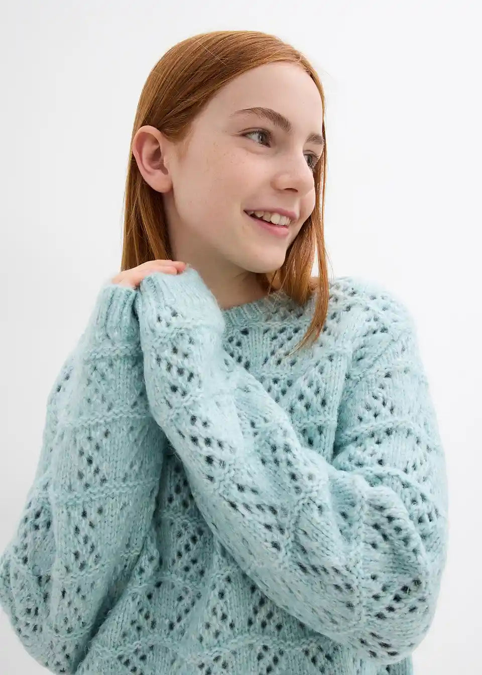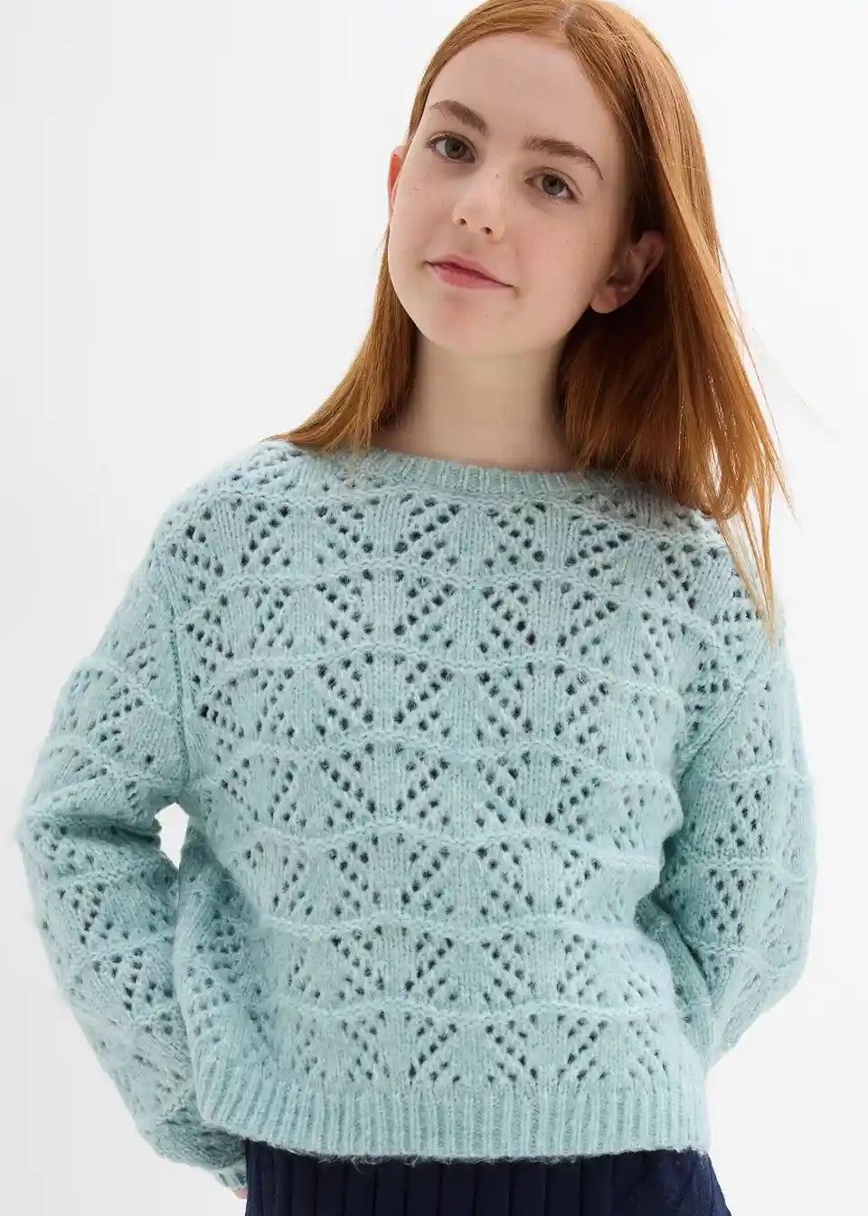 Pulover iz zračne grobe pletenine z luknjičasto vezenino za dekleta