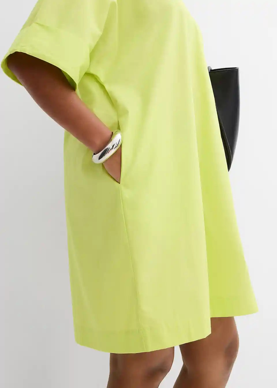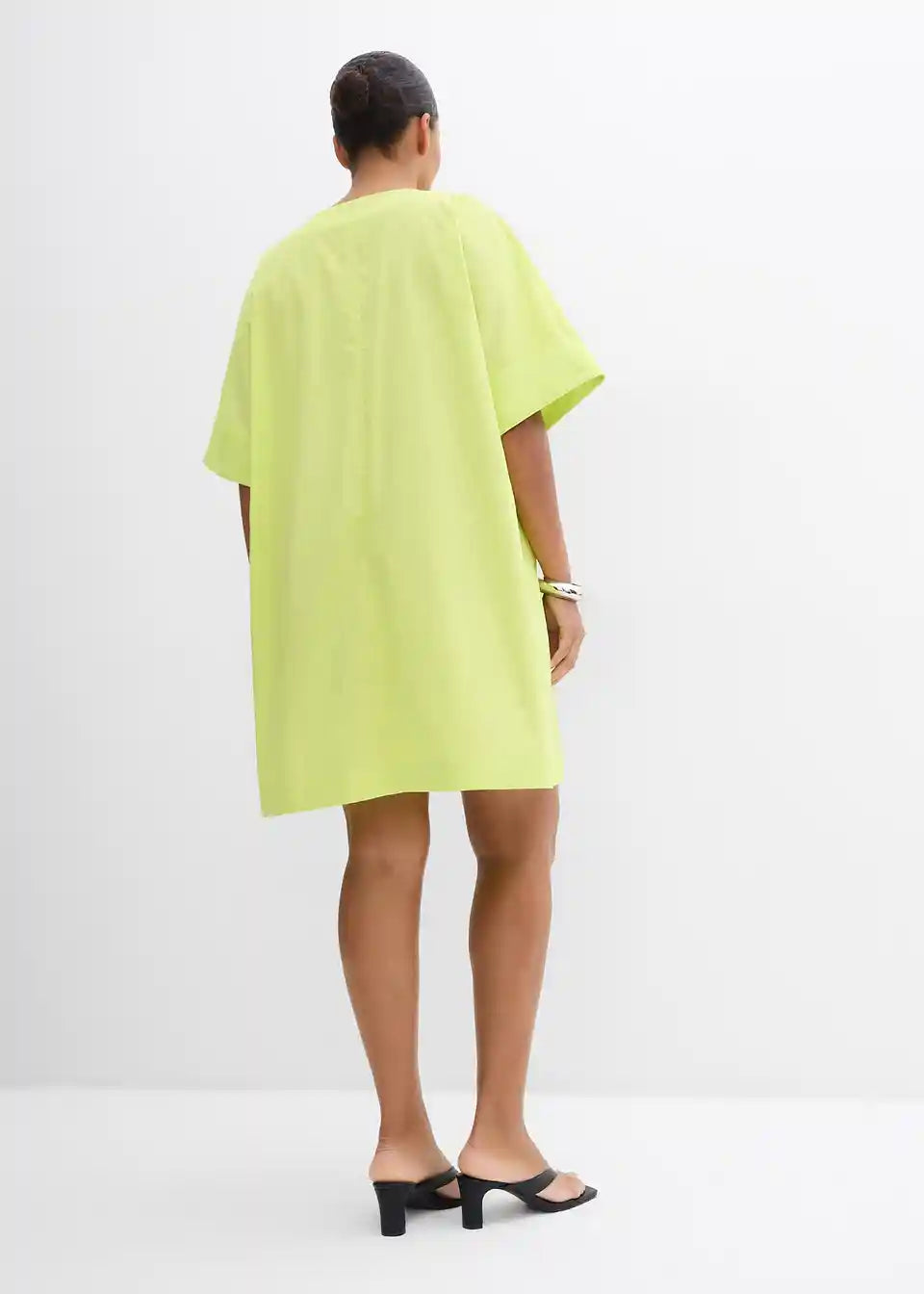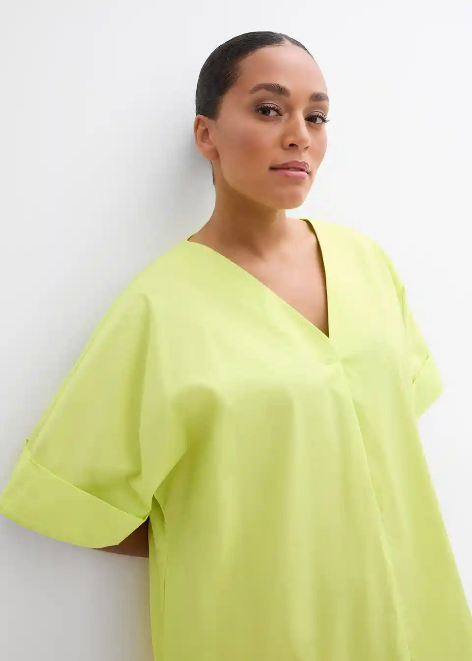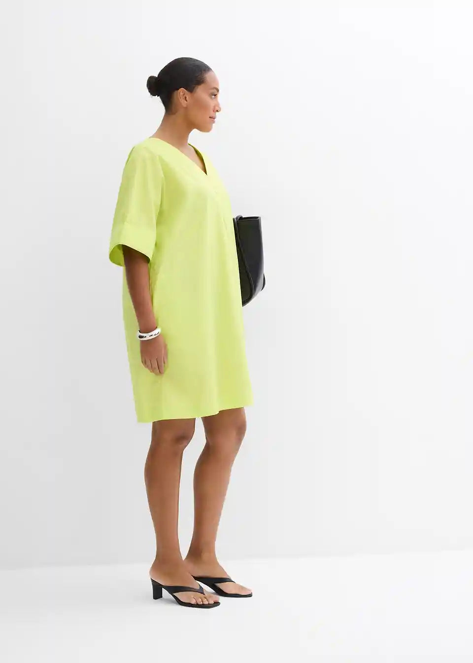 Spodaj razširjena obleka v kroju tunike z V-izrezom in kratkimi rokavi