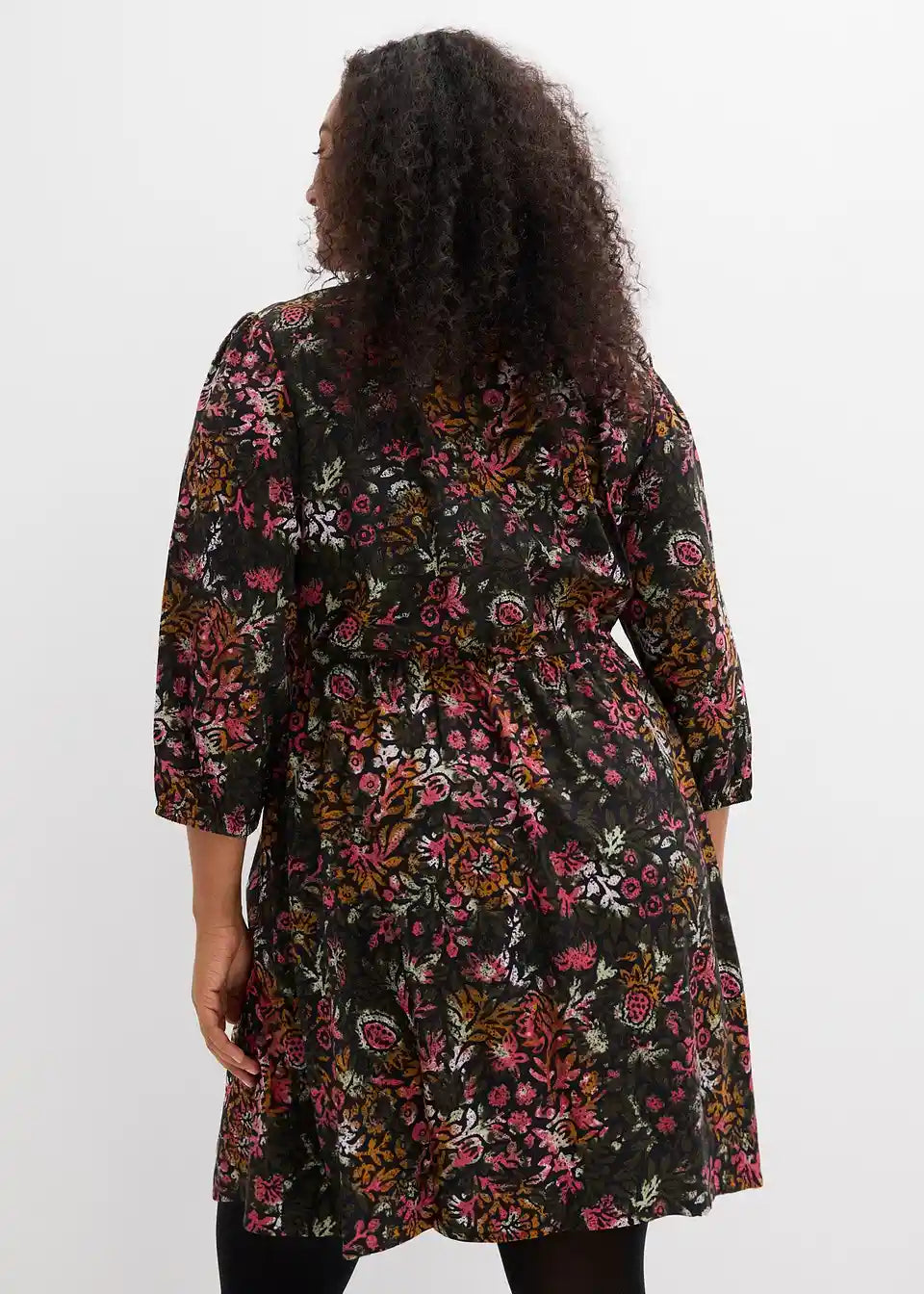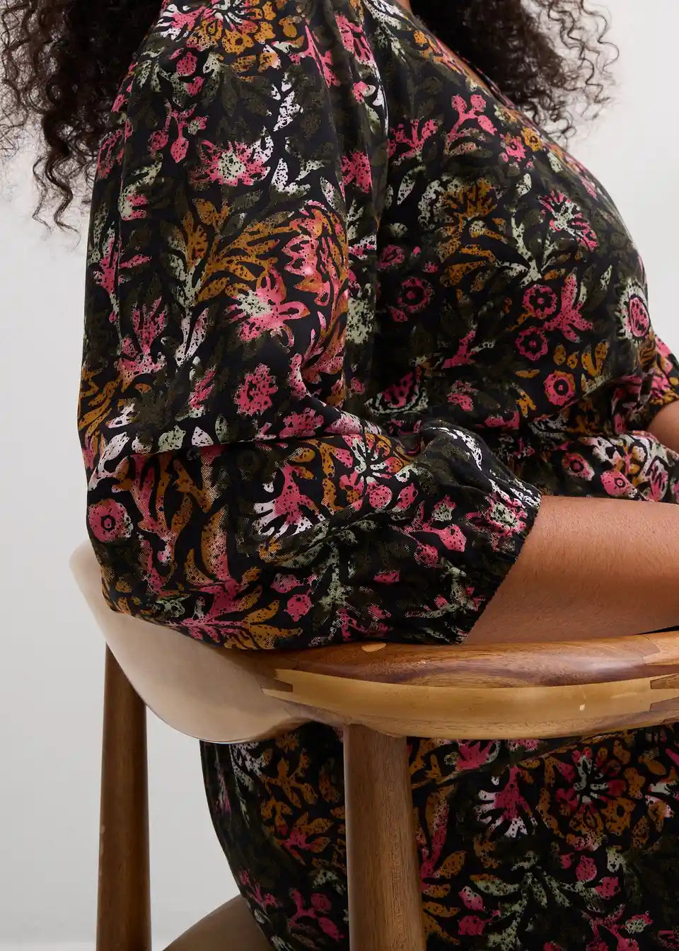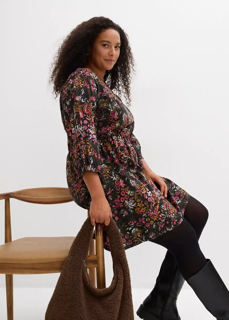 Obleka z razširjenim spodnjim robom in globokim V-izrezom iz padajoče viskoze