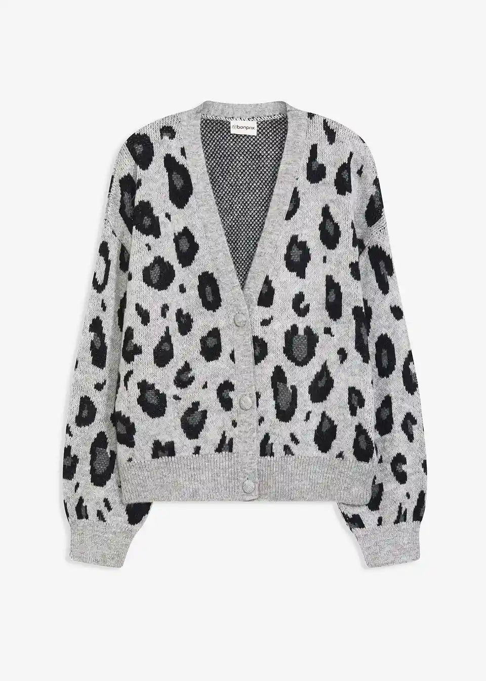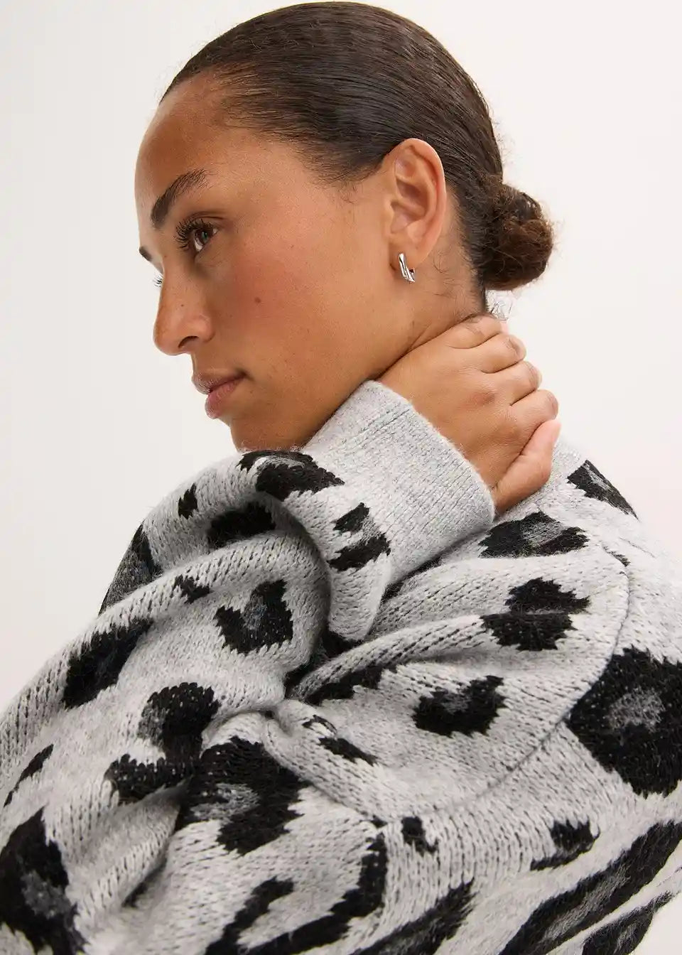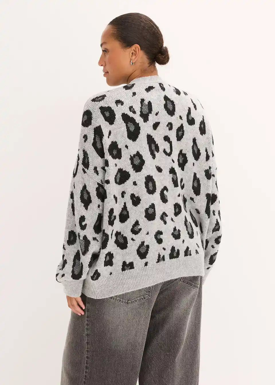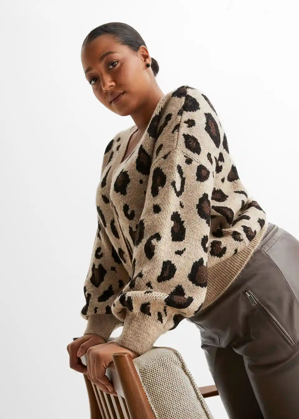Modna pletena jopa z leopardjim živalskim vzorcem.