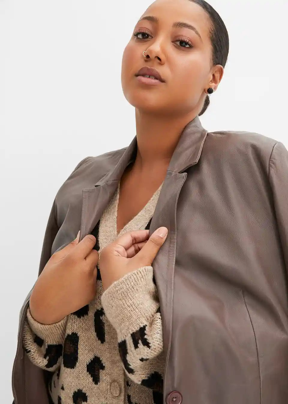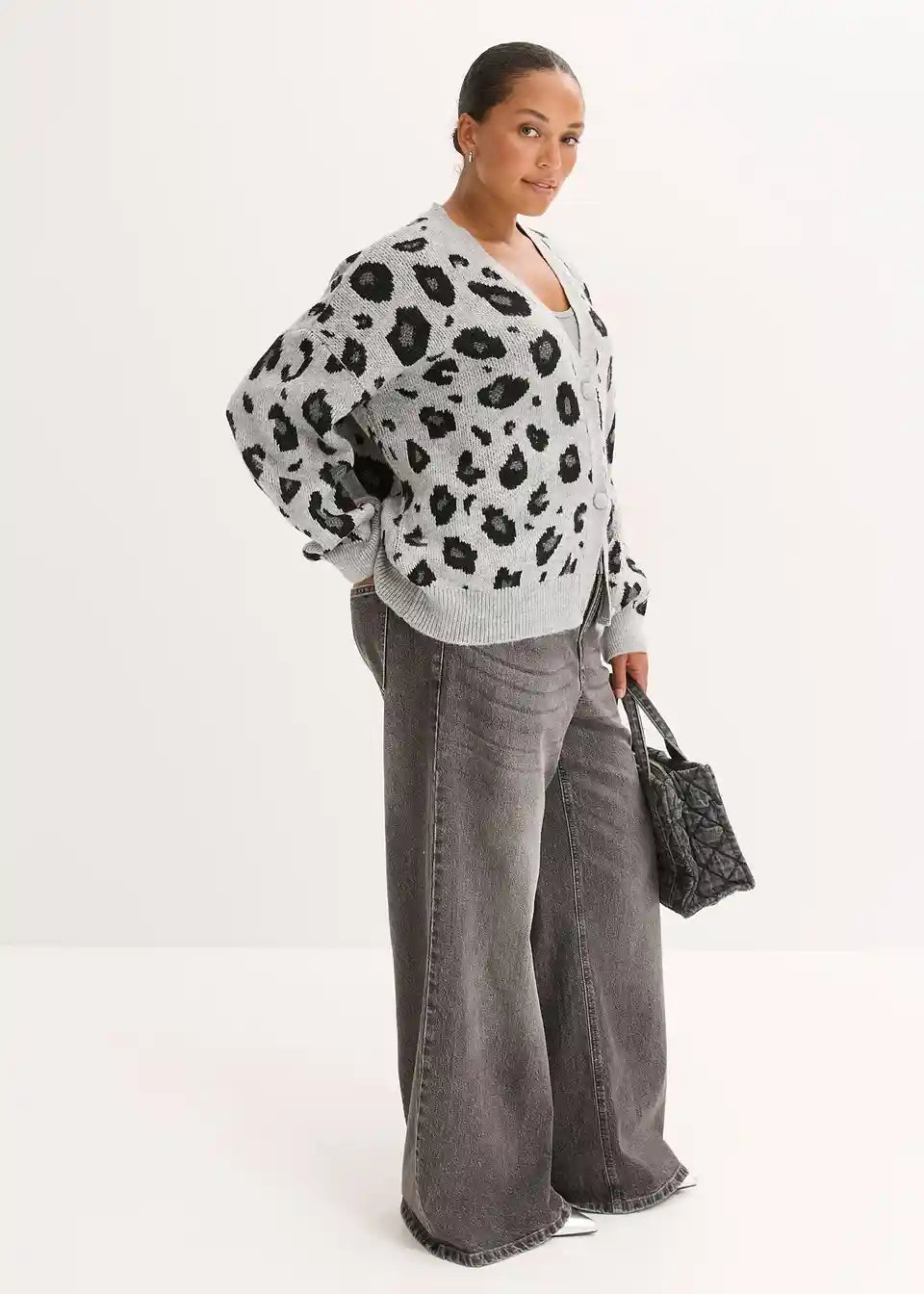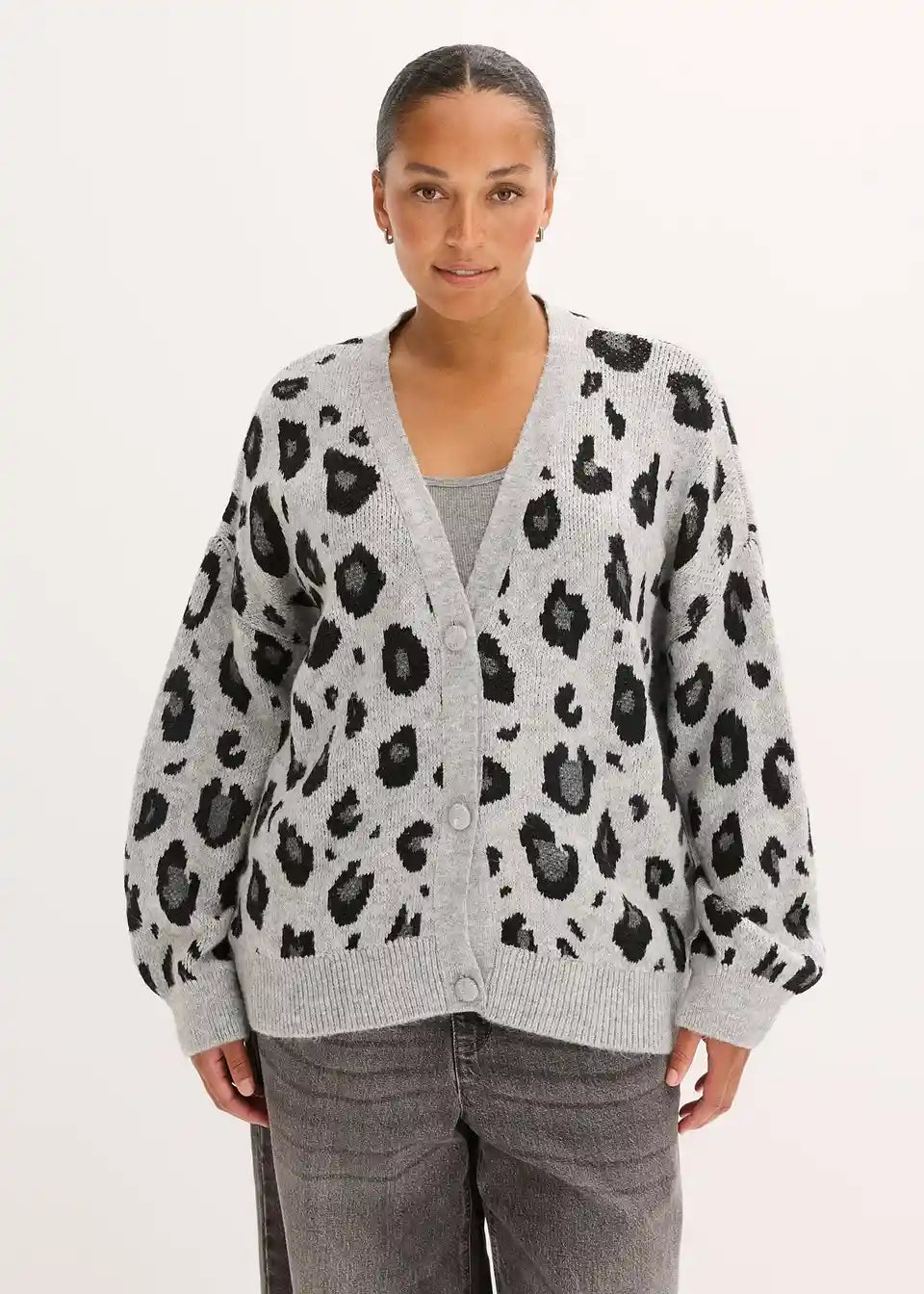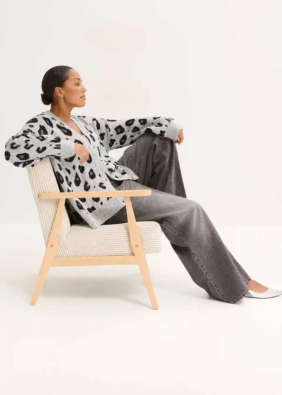 Modna pletena jopa z leopardjim živalskim vzorcem.