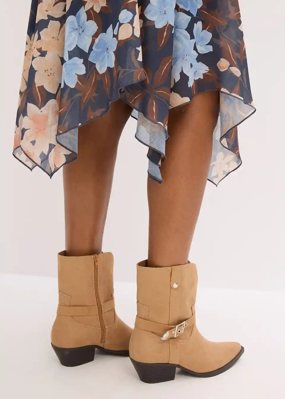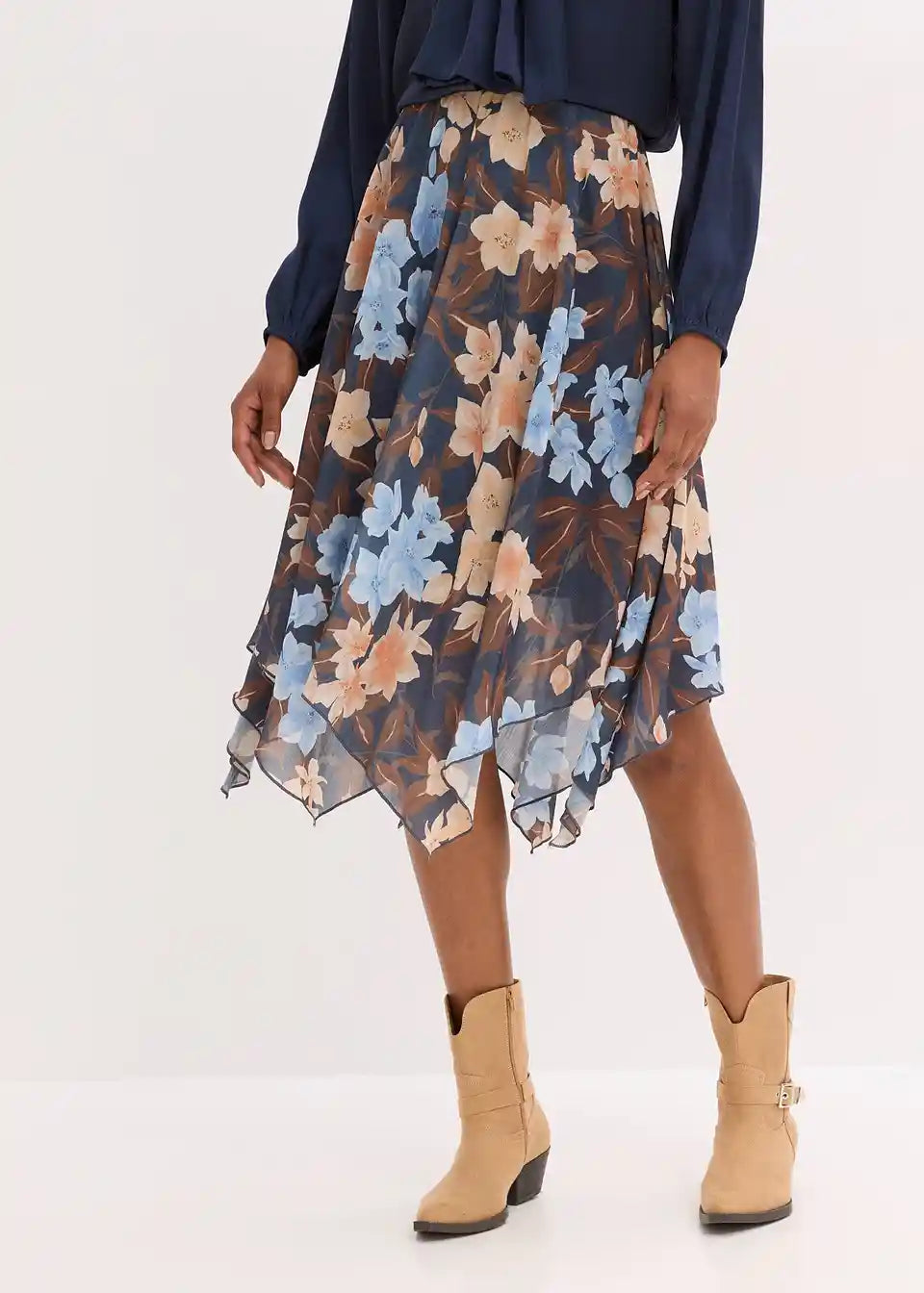 Cvetlično potiskano midi krilo z asimetričnim spodnjim robom iz šifona z elastiko v pasu
