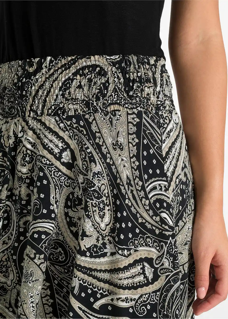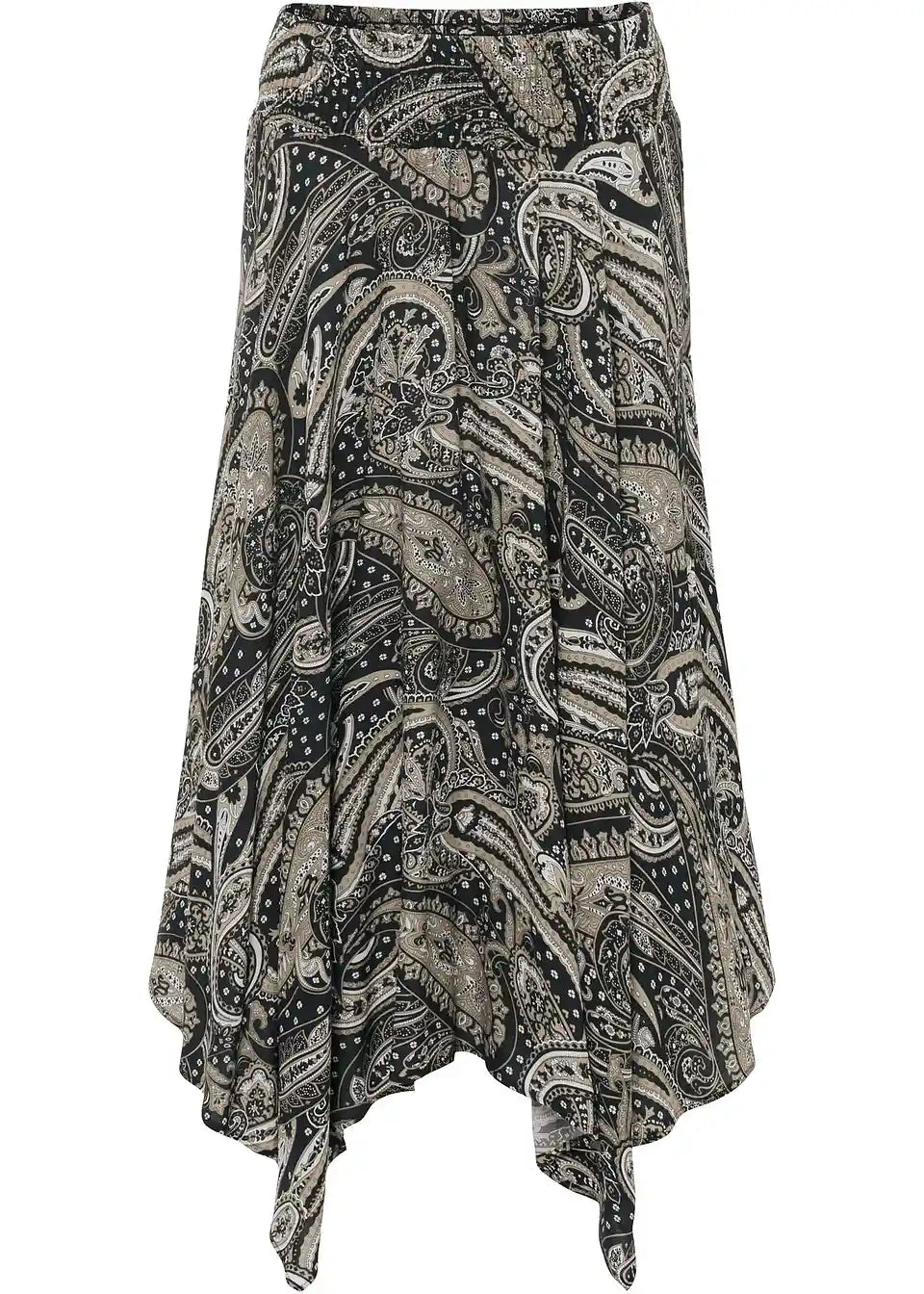 Izpopolnjeno krilo z asimetričnim robom v koničasti obliki. Elastičen pas s smock učinkom.
