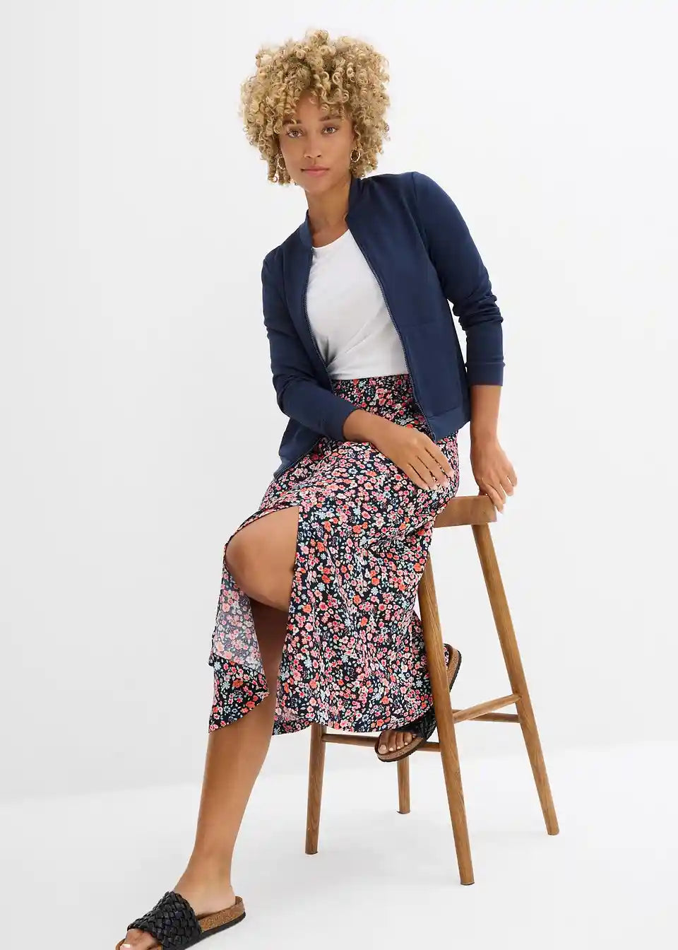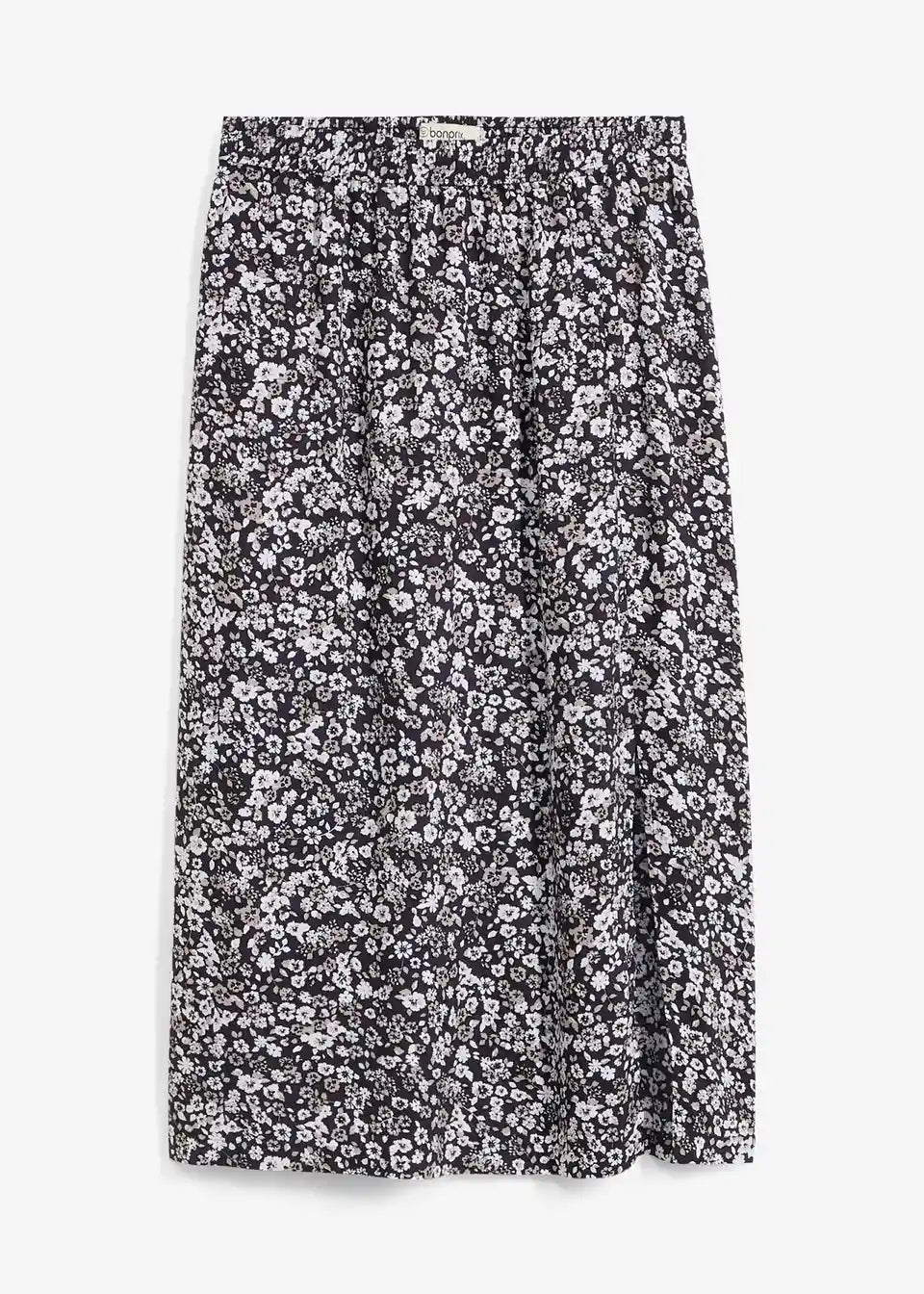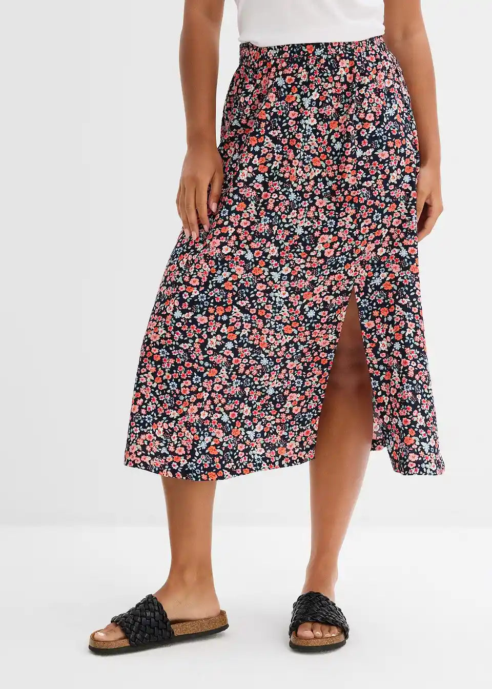 Midi krilo iz viskoze s stranskim razporkom in elastičnim udobnim pasom.